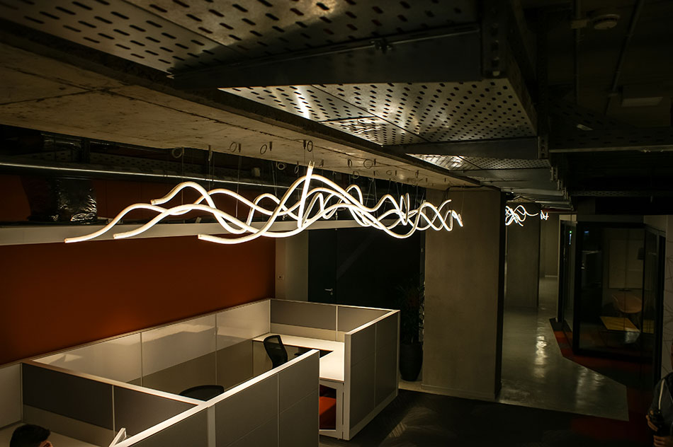 Für die Büroräumlichkeiten von Broadcom in Yakum, Israel schufen Lichtdesigner Eran Aronson von Aronson Lighting Design und RTLD Lighting Design eine ganz besondere Installation mit 31 VENUS Leuchten. Jede Leuchte wurde auf der Baustelle von ihm individuell gebogen. Daher ist keine Leuchte wie die andere und alle unterscheiden sich in ihren Biegungen und den Abpendelungen. Insgesamt entstanden bei dem Projekt 31 außergewöhnliche Leuchten gefertigt aus 775 Metern der flexiblen VarioLED™ Flex VENUS, 775 Metern Aluminiumprofil, 775 Metern transparentem Schrumpfschlauch, 775 speziell entwickelten Steckverbindern, 775 silikonbeschichteten Stahlkabeln, 775 Deckenanschlüssen und das alles in weit über 775 Stunden der Planung, Konzeption und Installation. Festgehalten hat Eran Aronson diesen spannenden Prozess in einem Video, welches in Zusammenarbeit mit Yoni Gofer produziert wurde. Viel Spaß beim Ansehen von „Light Sketch“!