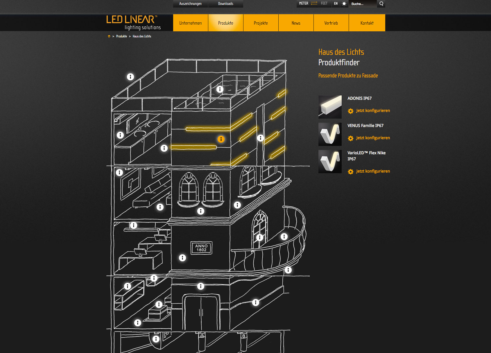 Oder möchten Sie sich visuell leiten lassen und über verschiedene Etagen und Räume die passende Leuchte finden? Dann lassen Sie sich im „Haus des Lichts“ inspirieren und wählen Sie Ihr Produkt nach Anwendungsbereichen. Wir bieten Ihnen automatisch eine Auswahl von bis zu 4 Leuchten, passend zur gewählten Applikation, und Sie können direkt aus diesem Menü in die Konfiguration springen.