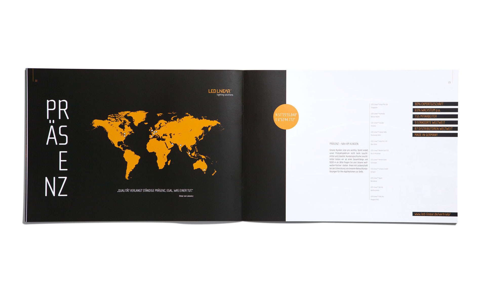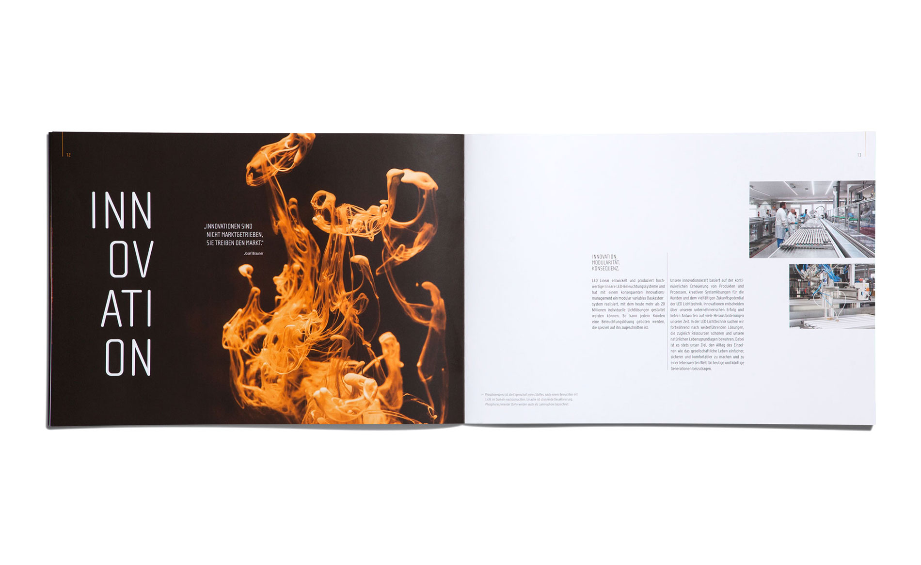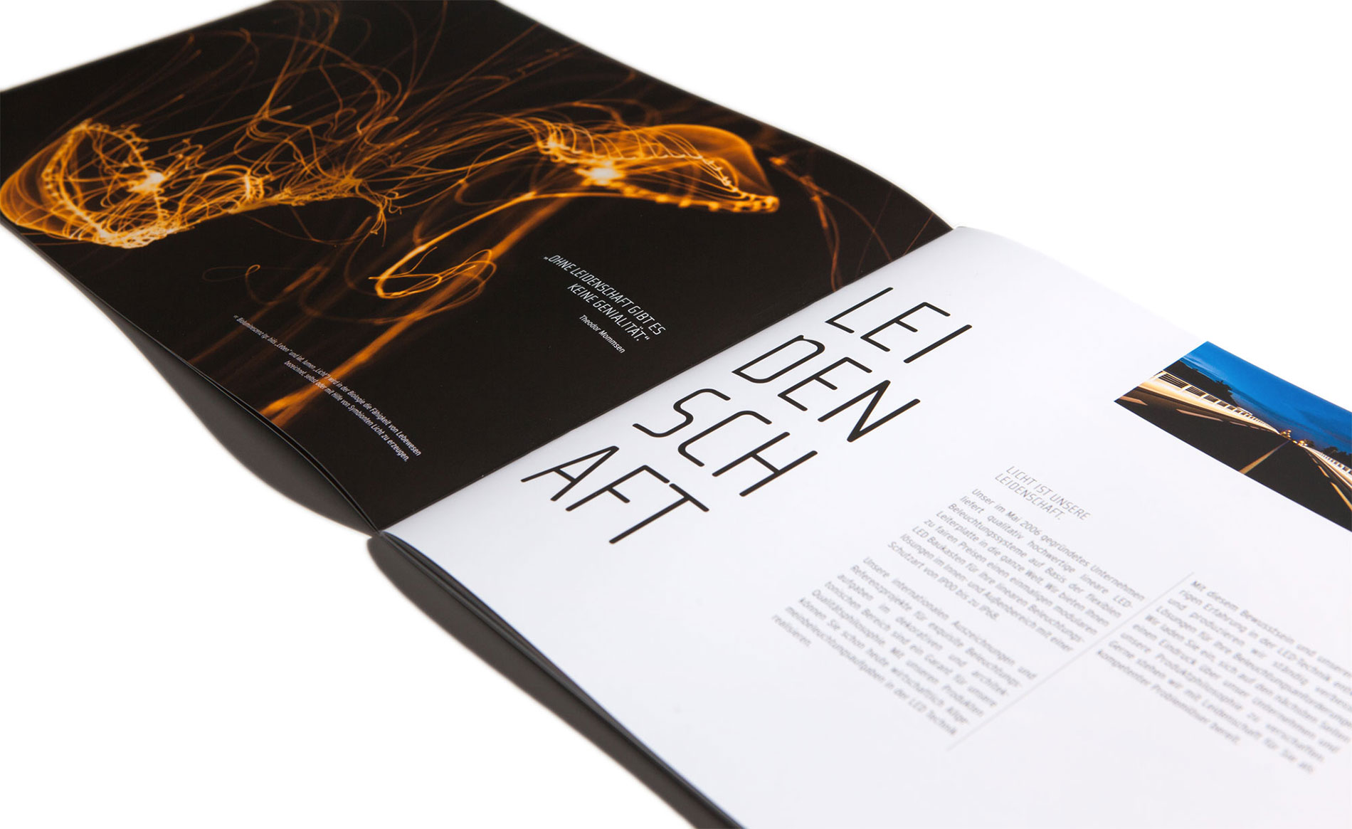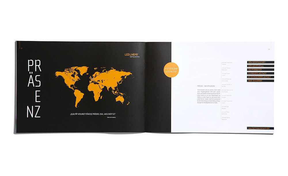 „Licht ins Dunkel bringen, die Unternehmenswerte in den Fokus stellen, es repräsentativ in den Scheinwerferkegel stellen und mit all seinen Facetten beleuchten – das war die Aufgabe für die Broschüre des mehrfach preisgekrönten Leuchtenherstellers LED Linear™. Gelebte Werte auf 36 Seiten in Bild und Text, Grafik und Typo, Papier und drucktechnischer Veredelung.