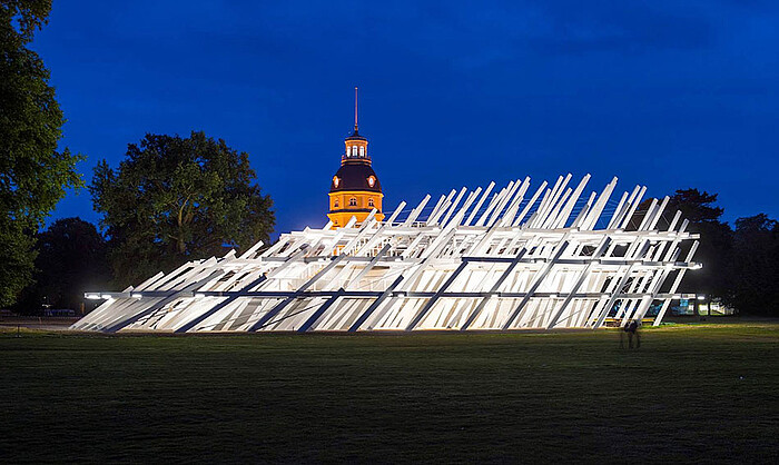 Strahlende Gesichter, anerkennendes Kopfnicken, begeisterte Menschen und jede Menge Applaus, so lässt sich am besten die Gemütslage der 40.000 Besucher der großen Eröffnungsshow zum Karlsruher Stadtgeburtstag am Samstag, den 20.06.2015, beschreiben. Wie bei der Stadtgründung vor 300 Jahren stand das Schloss bei den Feierlichkeiten im Mittelpunkt. Neu und revolutionär ist das im Schlossgarten gelegene „Herzstück“ des Festivalsommers: ein eigens für den Geburtstag entworfener Pavillon. Dieser bildet mit seiner innovativen Formensprache einen reizvollen Kontrast zur historischen Kulisse des Schlosses.