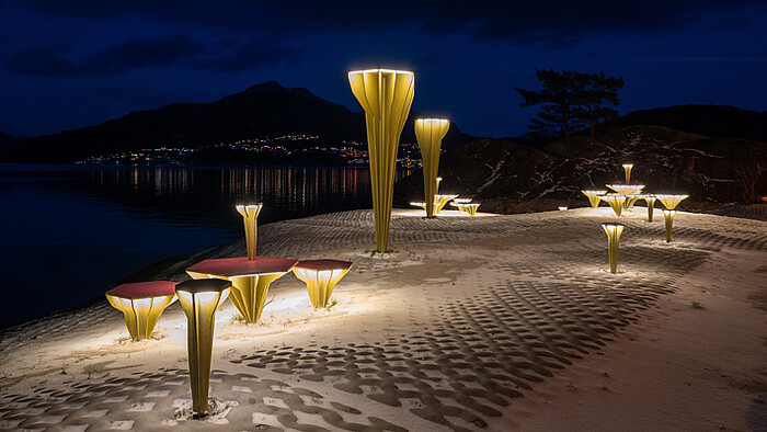 2021 wurden kleine und große Möbelelemente wie Hocker und Tische aus Materialien recycelter Plastikboote von Ryfylke sowie Laternen und Leuchten gebaut. Sie stehen jetzt als Ansammlungen von künstlichen „Pilzen“ auf dem Rastplatz. In den Abendstunden verwandelt sich der Platz und die Pilze beginnen zu leuchten, fast zu schweben. Der Effekt wurde mit der Lichtlinie VarioLED™ Flex IP67 erzielt, welche indirekt die Unterseiten der Recycling-Objekte beleuchtet.
