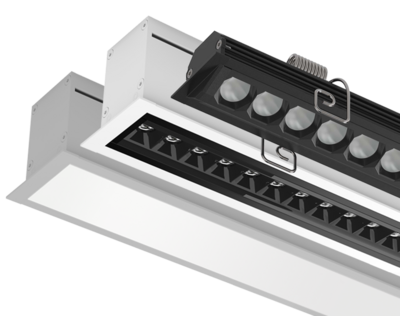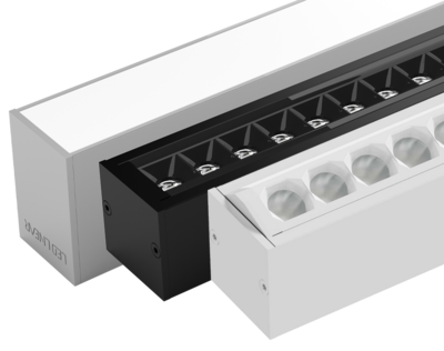Leuchte mit kleinem Formfaktor, aber dennoch modular; mit einstellbarem Leuchtenkopf und spiegelnden Reflektoren mit herausragender Entblendung.