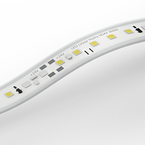 Besonders innovativ: Der IP67-Schutz der Stecker kann ebenfalls vor Ort erfolgen. So kann diese Leuchte einfach und individuell an jede Applikation angepasst werden. Ein weißer Boden mit seitlichen Stegen und reflektierender Oberfläche sorgt zudem für hohe Lumenströme von bis zu 1.650 lm/m. Die vergossenen Lichtlinien sind leistungsstark und zeugen von handwerklicher Qualitätsarbeit. Mit HYDRALUX gibt es keine störenden Lichtfugen dank der Möglichkeit, separate Einheiten aneinander stoßen zu lassen. Das verwendete Polyurethan weist im für LED-Anwendungen relevanten Temperaturbereich (-50°C bis +80°C) eine fünffach höhere chemische Beständigkeit und eine zehnfach geringere Wasseraufnahme gegenüber vergleichbaren Silikonen auf. Auch in schwierigen Applikationen, wo z. B. Platzmangel herrscht, ist Verlass auf HYDRALUX. Das durchdachte Konzept, der minimale Biegeradius von nur 30 mm und der geringe Querschnitt von 12,5 mm x 3,5 mm (B x H) ermöglichen nahezu überall den Einsatz – für Vouten, Konturen, Möbel, Shops und architektonische Details.