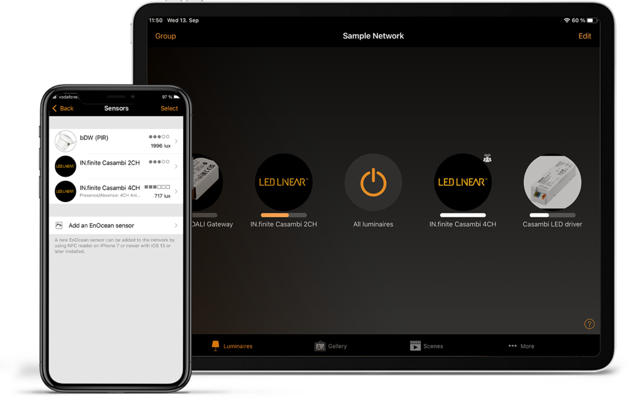 Einfache Inbetriebnahme für kleine Projekte via Smartphone und der CASAMBI App oder mit der CASAMBI PRO App für Windows® und iPad®.