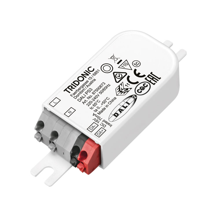 DALI 2® Bus Stromversorgung mit max. 70 mA für bis zu 35 LED Treibern mit einer typischen Leistungsaufnahme von 2 mA. 2 x 17000083 in einem DALI® Netzwerk kombinierbar.