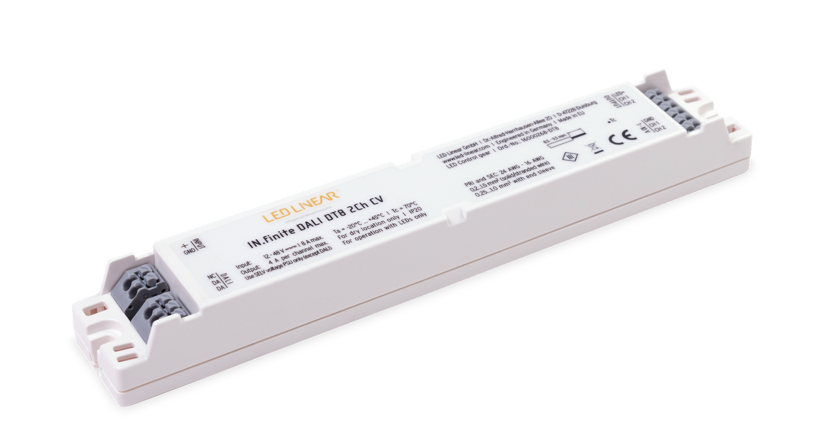 Die 2CH IN.finite™ DALI® DT8 ist DALI® DT8 kompatibel und für konstantspannungsbetriebene LED-Leuchten und -Bändern mit bis zu zwei Kanälen geeignet.