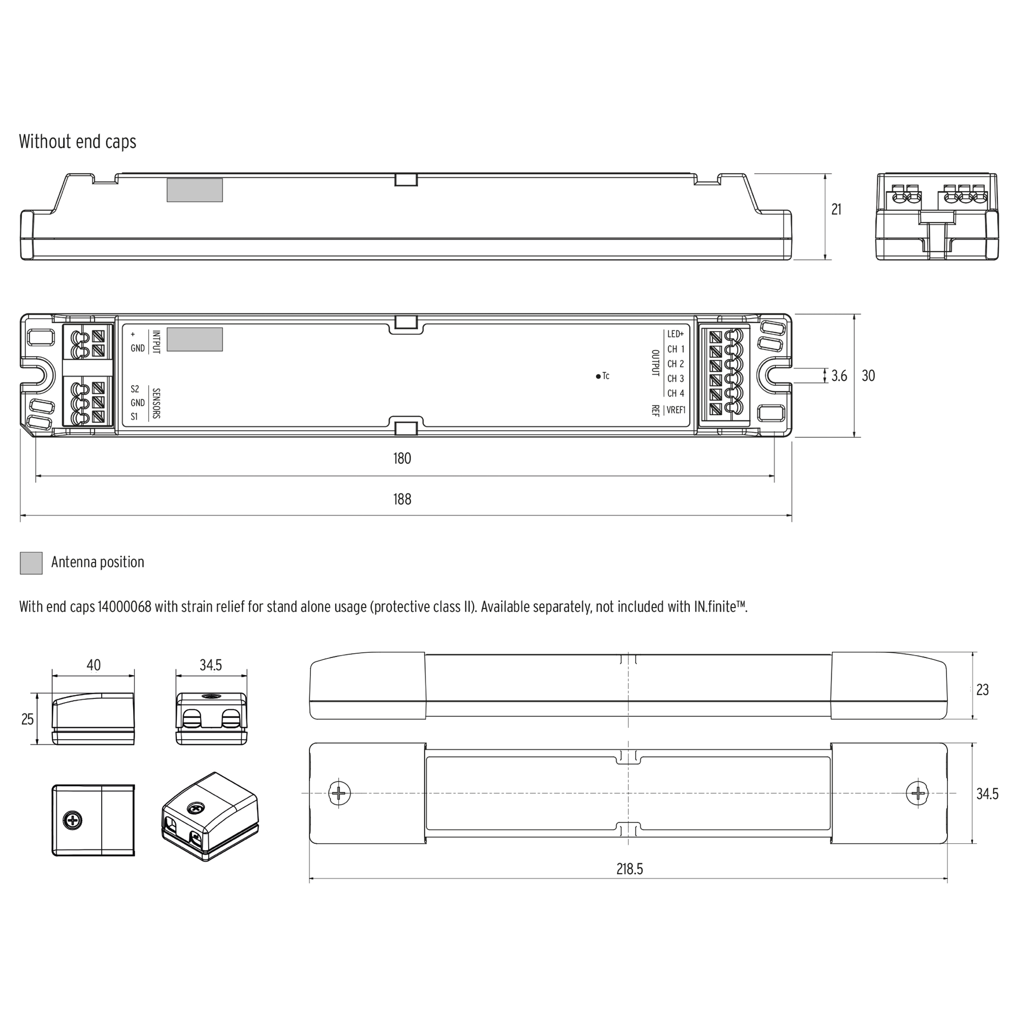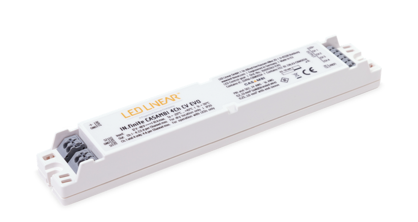 Die 4CH IN.finite™ CASAMBI nutzt die bewährte CASAMBI BLE Funktechnologie zur Ansteuerung von konstantspannungsbetriebenen LED-Leuchten und -Bändern mit bis zu vier Kanälen. Der geringe Standbyverbrauch und die direkte Kombinationsmöglichkeit mit Sensorik und Schaltern ermöglicht eine nachhaltige und bedarfsorientierte Steuerung der angeschlossenen Leuchten.