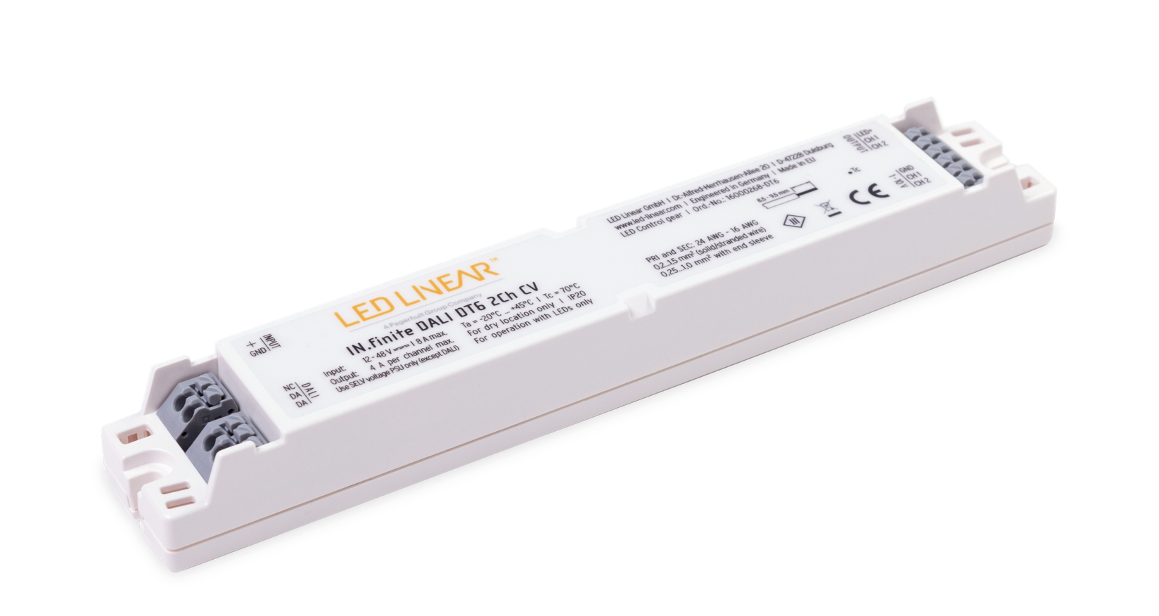 LED Linear™ bietet diese beiden meistgenutzten DALI®-Steuerungsmöglichkeiten mit unseren selbst entwickelten IN.finite™ DALI® DT6- und DT8-Produkten, die in Kombination mit allen konstantspannungsbetriebenen Leuchten und LED-Bändern von LED Linear™ verwendet werden können. Es ist ebenfalls Zubehör (Sensoren, Controller etc.) erhältlich, welches mit der IN.finite™ DALI®-Serie kompatibel ist oder Produkte, die bereits mit integrierter DALI®-Steuerung oder Sensorik ausgestattet sind.