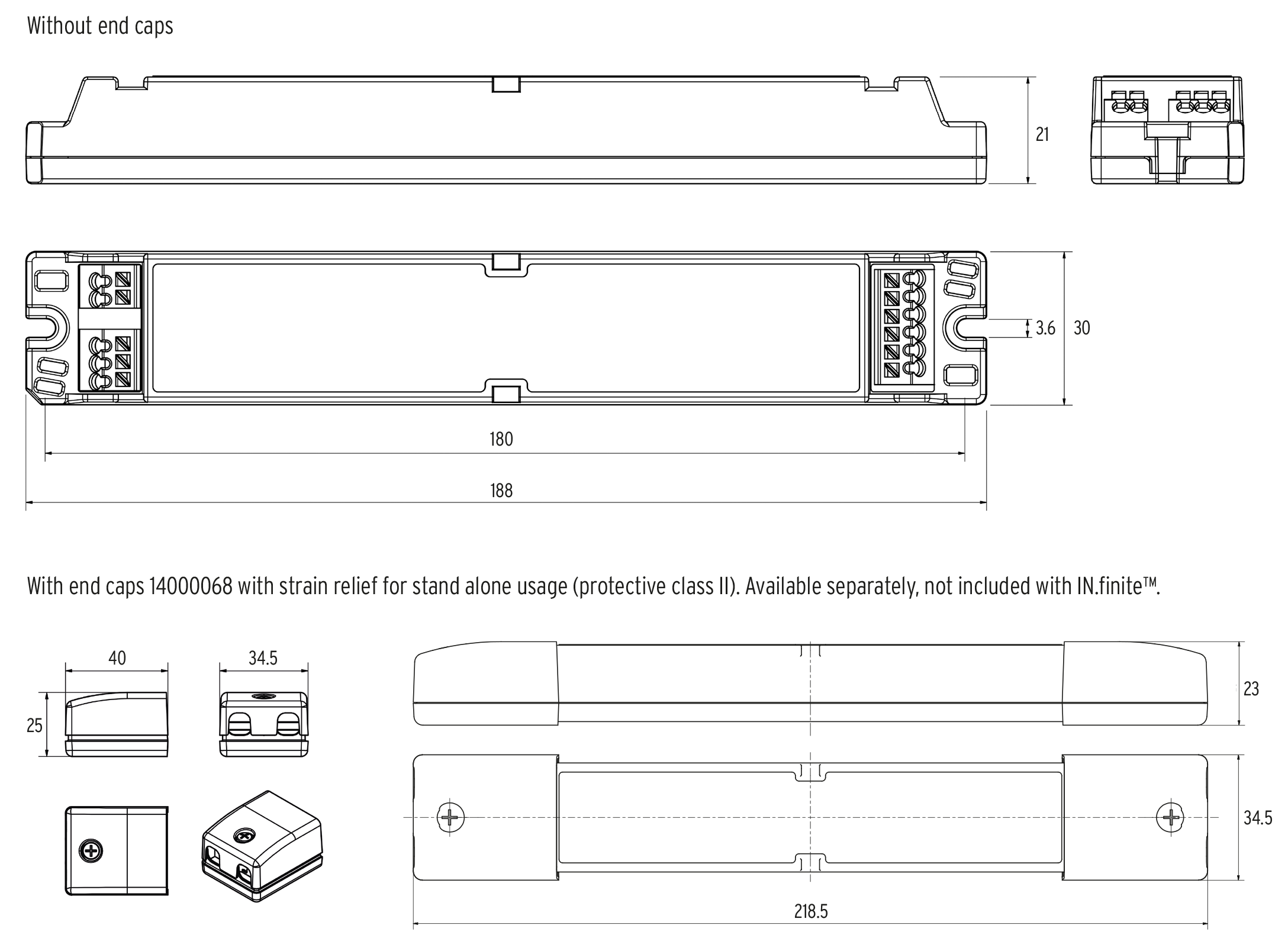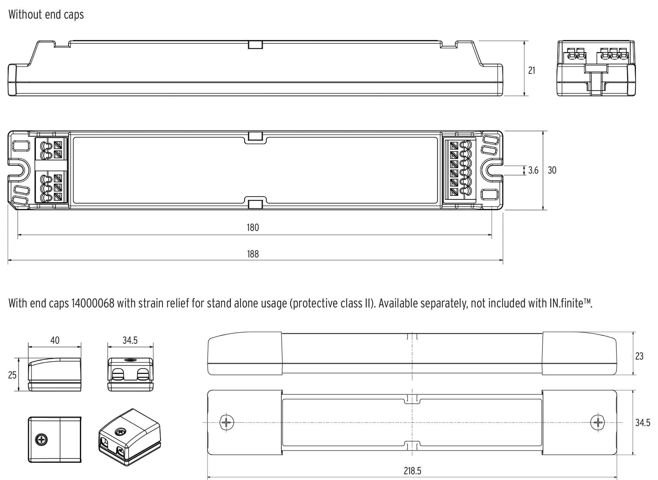 Schlanke Bauform mit nur 30 mm Breite, 188 mm Länge und 21 mm Höhe ist die IN.finite™ CASAMBI vielseitig einsetzbar. Durch optional erhältliche Endkappen kann die Schutzklasse 2 erreicht werden.