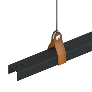 Die eleganten braunen Lederschlaufen mit einer Niete fügen sich perfekt in den Materialmix der Leuchte ein.