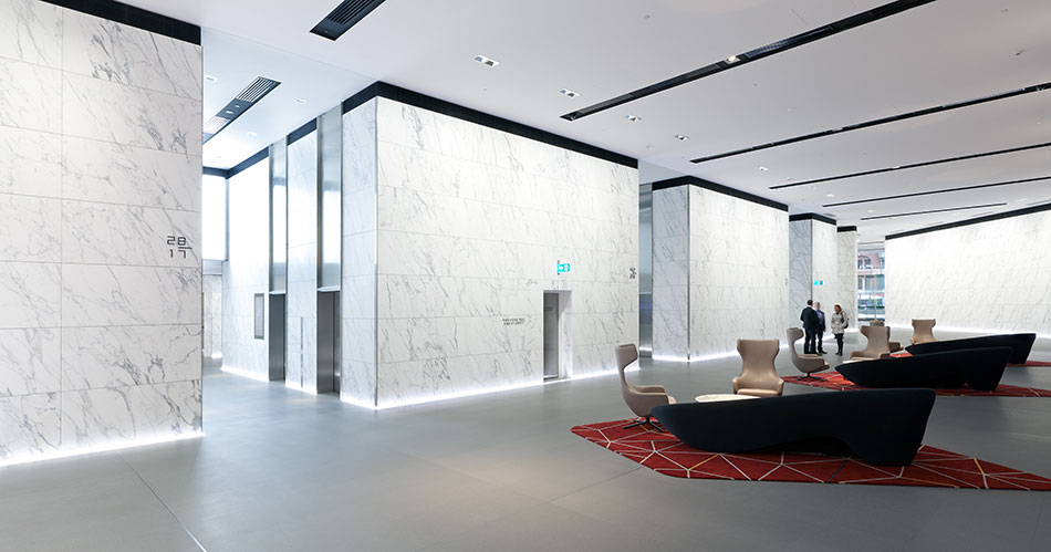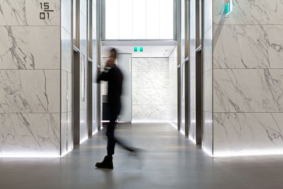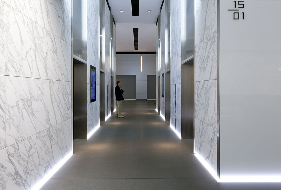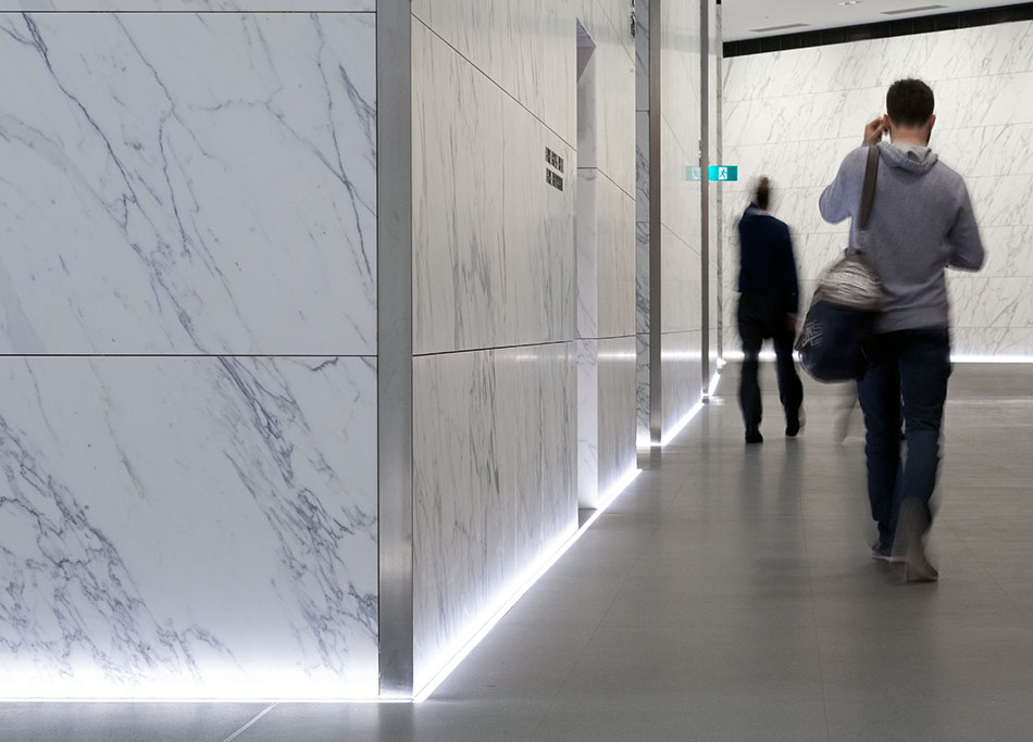 Das gemischt genutzte Gebäude beherbergt neben Büros aber auch Food, Retail und Fitness Flächen. Der großzügige und helle Eingangsbereich wurde mit linearen Beleuchtungslösungen von LED Linear ausgestattet. In der Schnittstelle von Boden und Wand wurde dazu die XOOLUM HYDRA HD6 IP67 in W835 installiert. Die IK10 geprüfte Leuchte emittiert aufgrund ihrer opalen Lichtaustrittsfläche absolut homogenes und punktfreies Licht. Die Aufenthaltsbereiche und Gänge werden so angenehm und gleichmäßig erhellt. Die Beleuchtung setzt ansprechende Akzente und unterstreicht die gehobene Ausstattung, gleichzeitig erleichtert sie zudem die Orientierung im Gebäude.