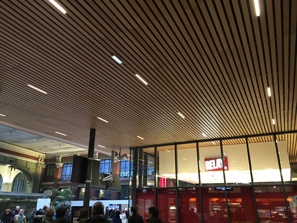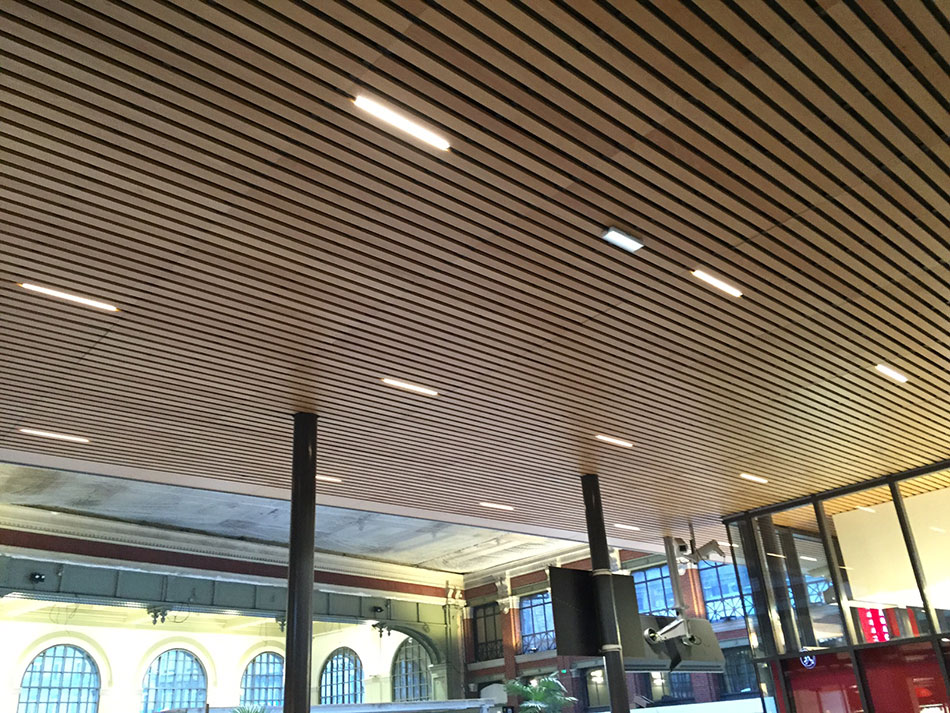 Der Bahnhof Lille-Flandres ist ein Kopfbahnhof der SNCF in der nordfranzösischen Stadt Lille. Im Zuge der Sanierung des Bahnhofs wurde im Bereich des Zugang zu den Bahngleisen eine neue Beleuchtung installiert. Insgesamt 109 Leuchten der XOOLUM™ R HYDRA LD25 in W830 wurden in die neu geschaffene Holzdecke integriert. Die Leuchten sind ca. 50 cm lang und setzen daher ansprechende dekorative Akzente. Aus funktionaler Sicht ist durch die verwendete hochwertige Reflektor-Optik und das starke LED-Band eine optimale Allgemeinbeleuchtung garantiert.