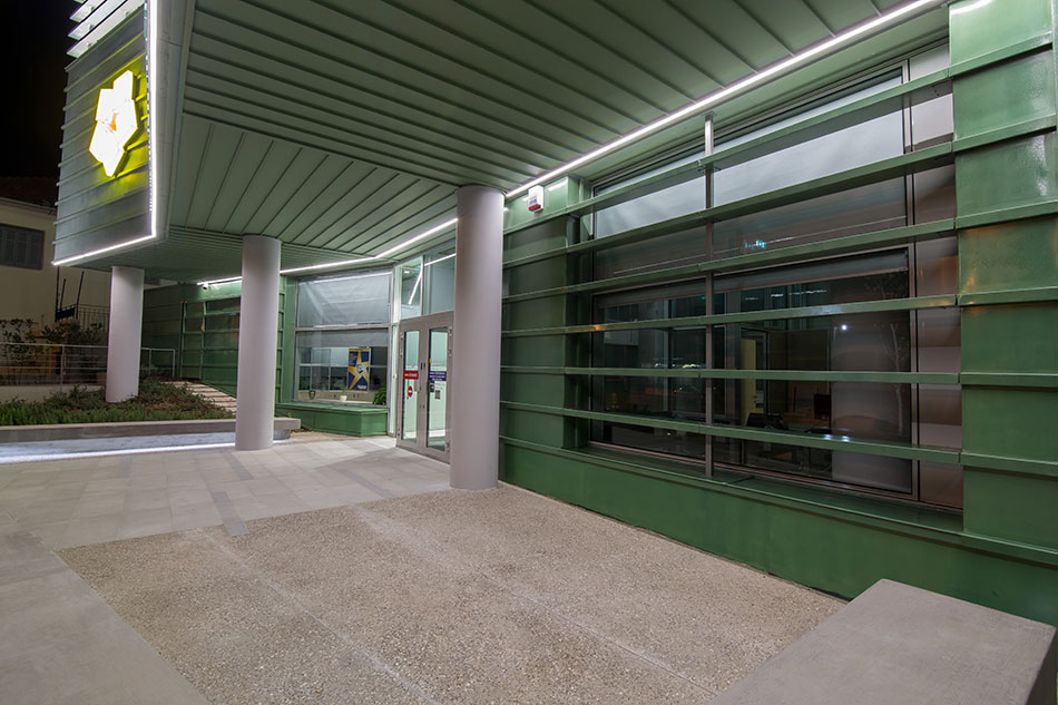 Durch ein im Kern liegendes Atrium mit einer gläsernen Dachkonstruktion kann Tageslicht vertikal in das gesamte Gebäude eindringen. Dies bietet die Möglichkeit, einer "internen" natürlichen Beleuchtung für die Räume des öffentlichen Dienstes im Erdgeschoss und die Büroflächen in den oberen Etagen. Die künstliche Beleuchtung des Gebäudes basiert auf der Verwendung von LED-Lampen mit 4.000 K (Tageslicht) für maximale Energieeinsparung, visuellen Komfort, optimale Farbwiedergabe und Hervorhebung der Beschaffenheit der Materialien. Die Außenbeleuchtung des Gebäudes wurde mit der IP67 geschützten LED-Leuchte HYDRALUX™ realisiert. Diese wurde vollständig in die architektonischen Elemente des Gebäudes eingebettet, um die Plastizität der Fassade in der Nacht zu betonen.