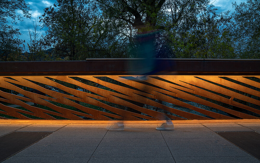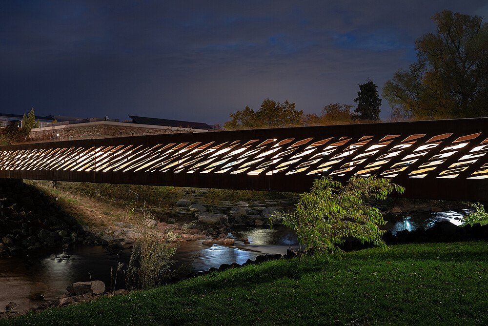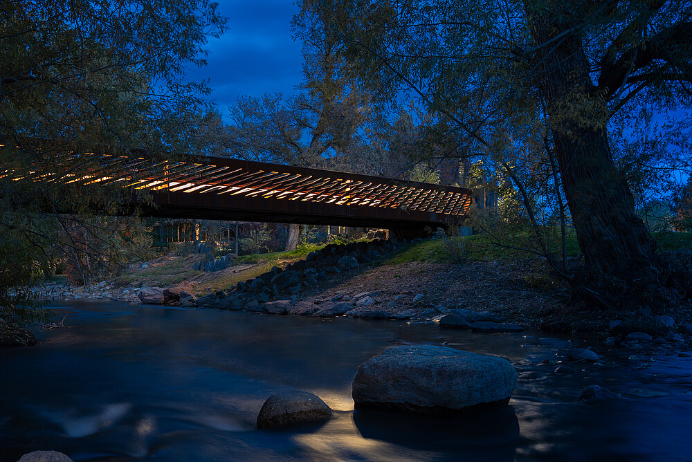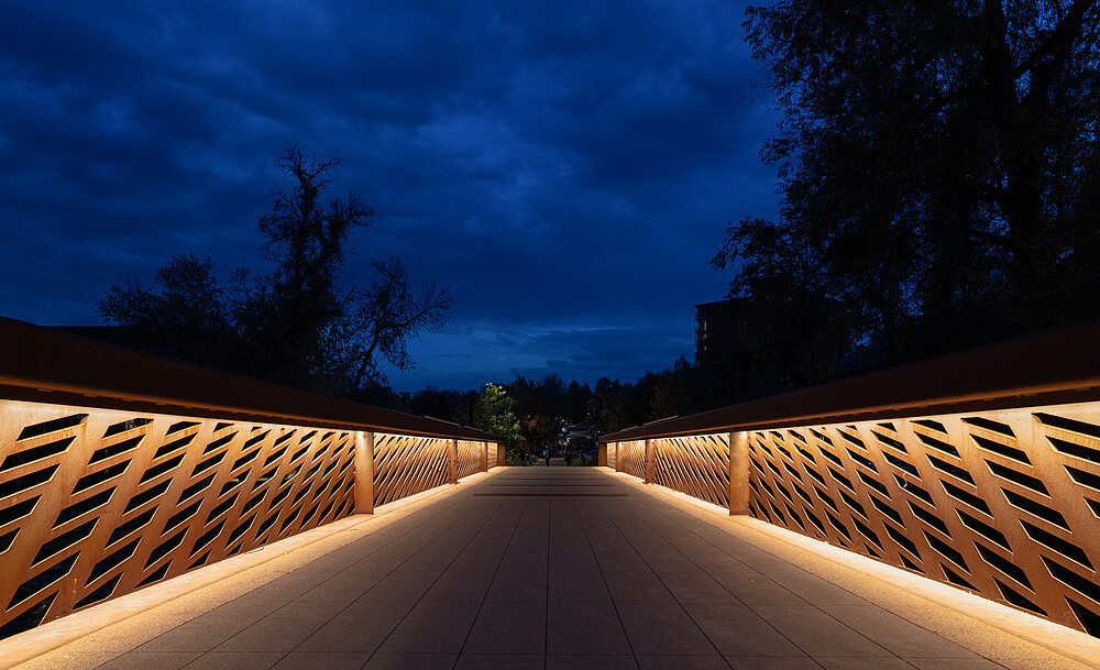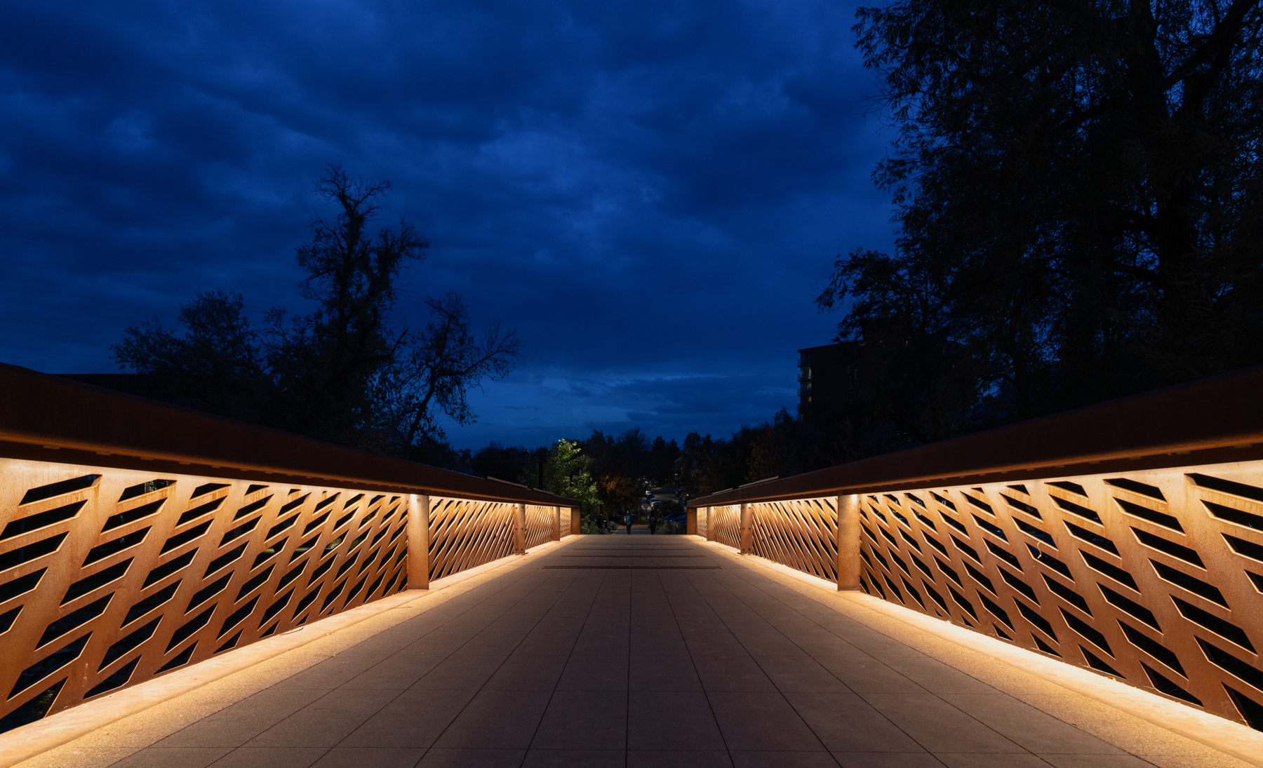 Diese Fußgängerbrücke in Boulder, Colorado, wurde mit der Außenleuchte KALYPSO IP67 beleuchtet. Durch die Montage unterhalb des Geländers strahlt das Licht gezielt nach unten auf den Gehweg und verleiht die notwendige Orientierung in den Abendstunden.