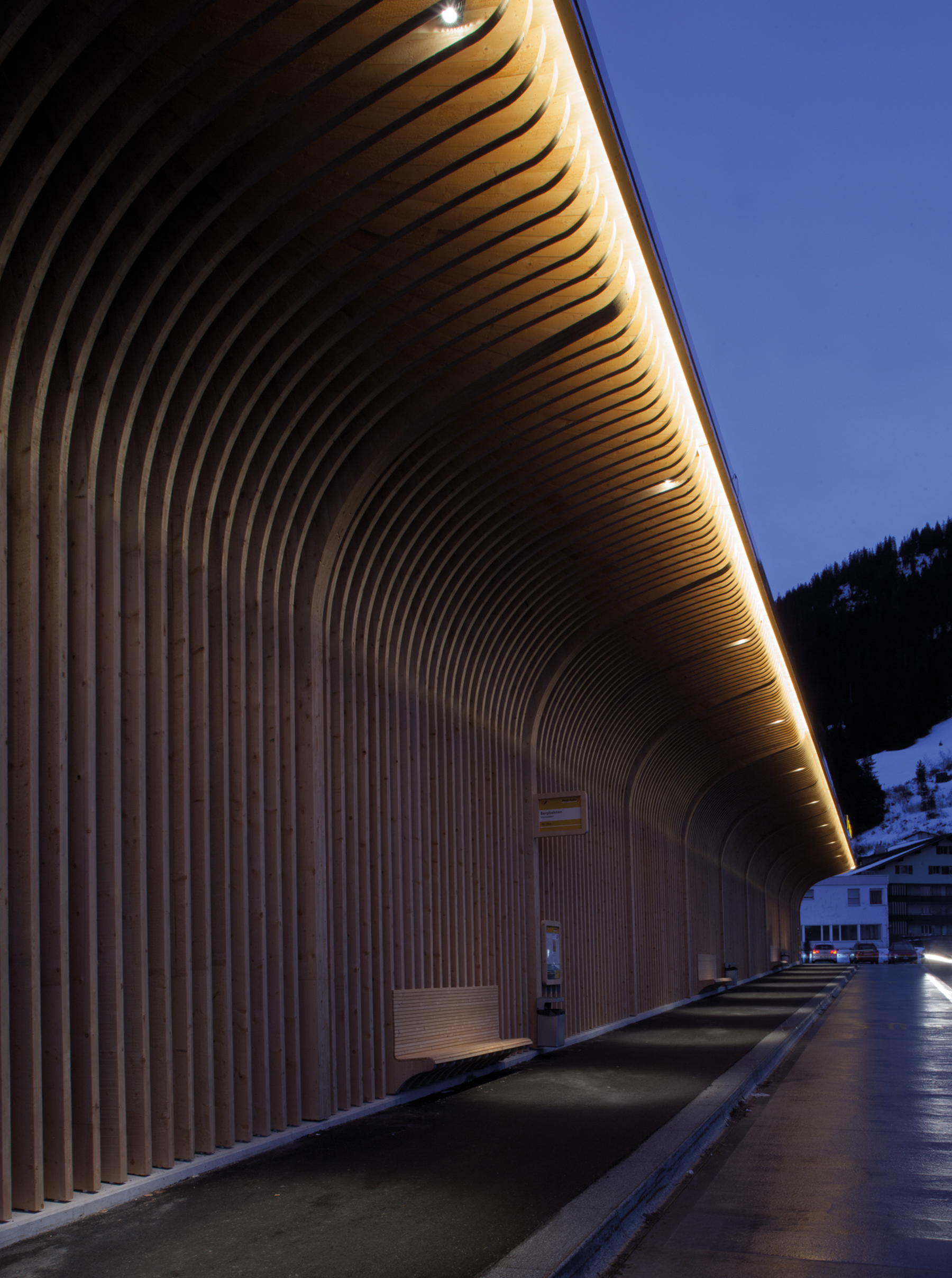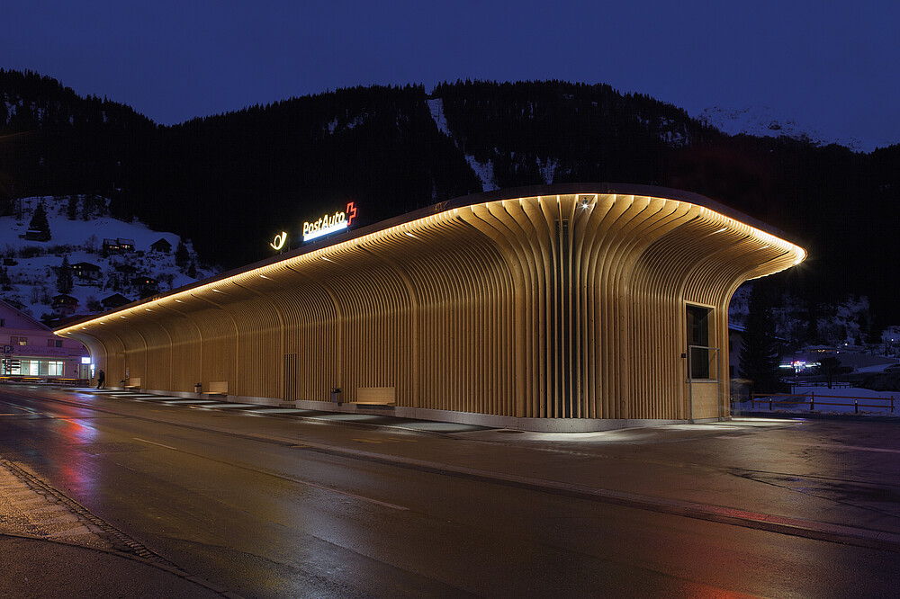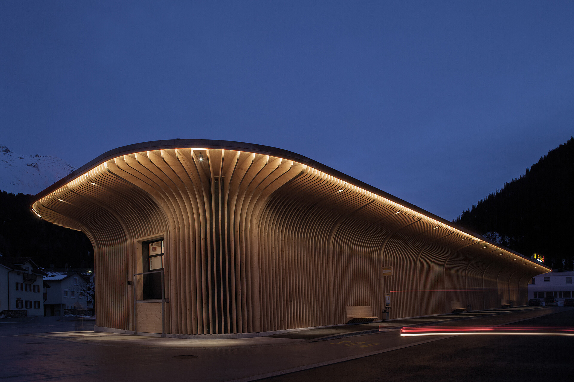 Der neue Busterminal Churwalden besticht durch seine einzigartige, dynamische Holzkonstruktion in Kombination mit einer funktionellen Doppelnutzung: Während der Außenbereich als modernes Terminal für den regionalen Busverkehr dient, wird der Innenraum für eine Migros Filiale genutzt. Charakteristika des Busterminals sind senkrecht positionierte Holzlamellen, die sich entlang der Fassade nach oben wölben und die Architektur elegant und plastisch wirken lassen.