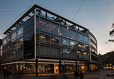 Ein Spiel mit Licht und Schatten bot sich für LIGHT ON bei diesem Entwurf geradezu an: Das Beleuchtungskonzept setzt das Gebäude wie einen leicht schwebenden Körper in Szene, der aus jedem Blickwinkel anders erscheint. Durch das Spiel des Lichtes mit den Holzlamellen verändern sich beim Vorbeiflanieren oder -fahren ständig Bild und Dimension des Gebäudes. Realisiert wurde diese imposante Applikation mit dem LED Band VarioLED™ Flex HYDRA LD15.