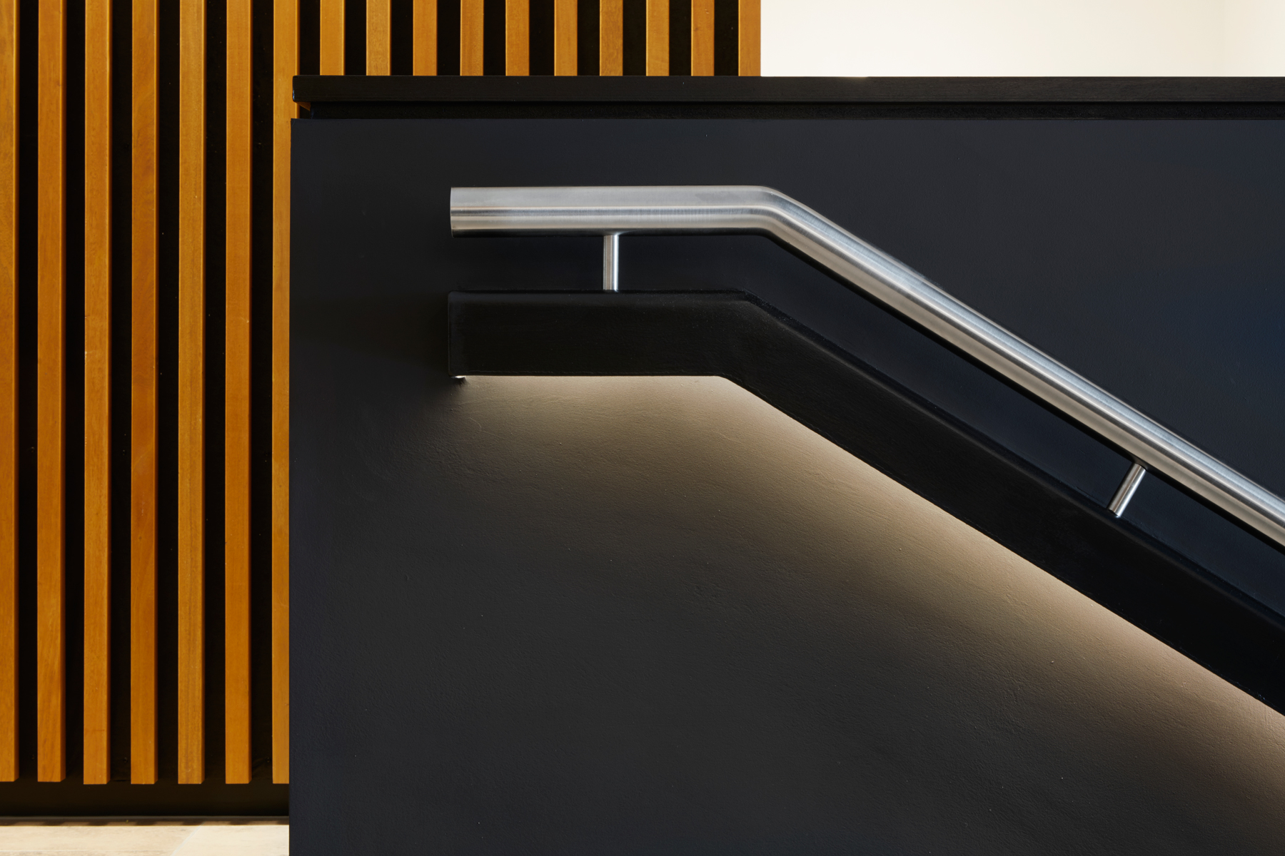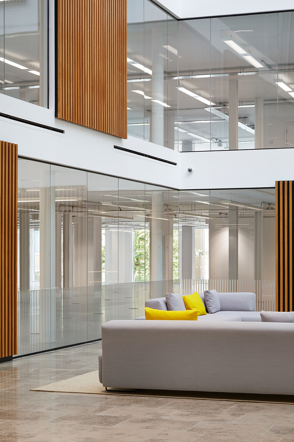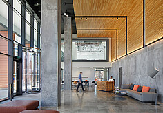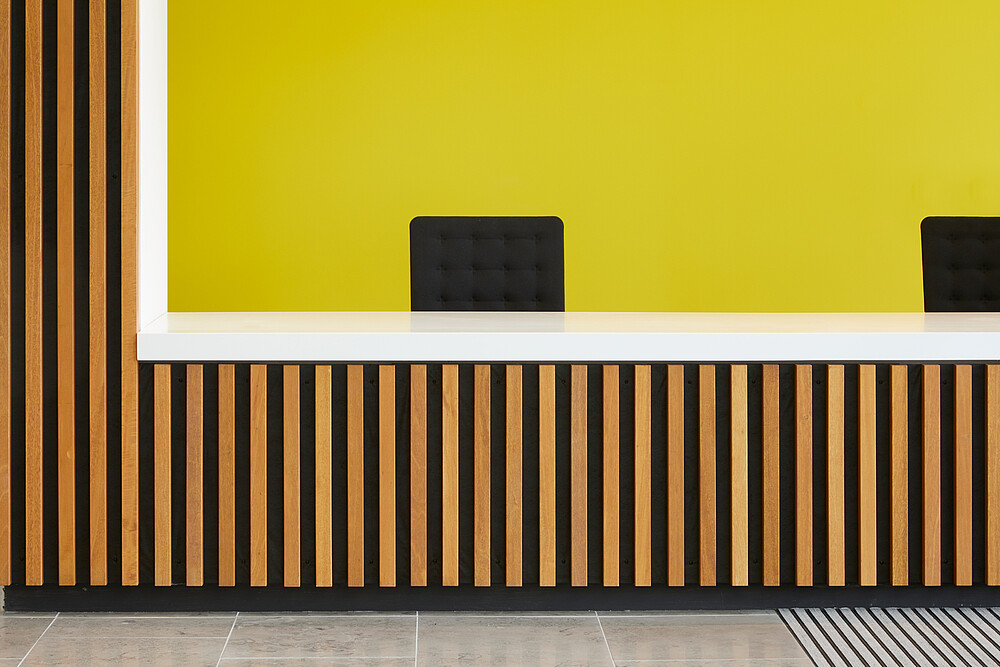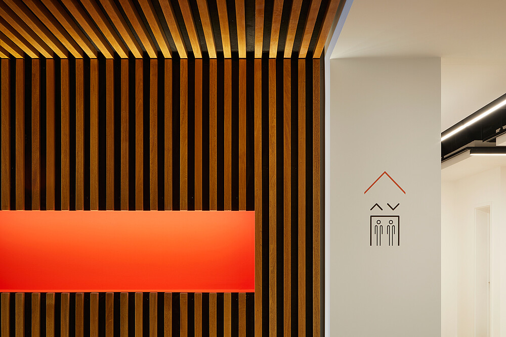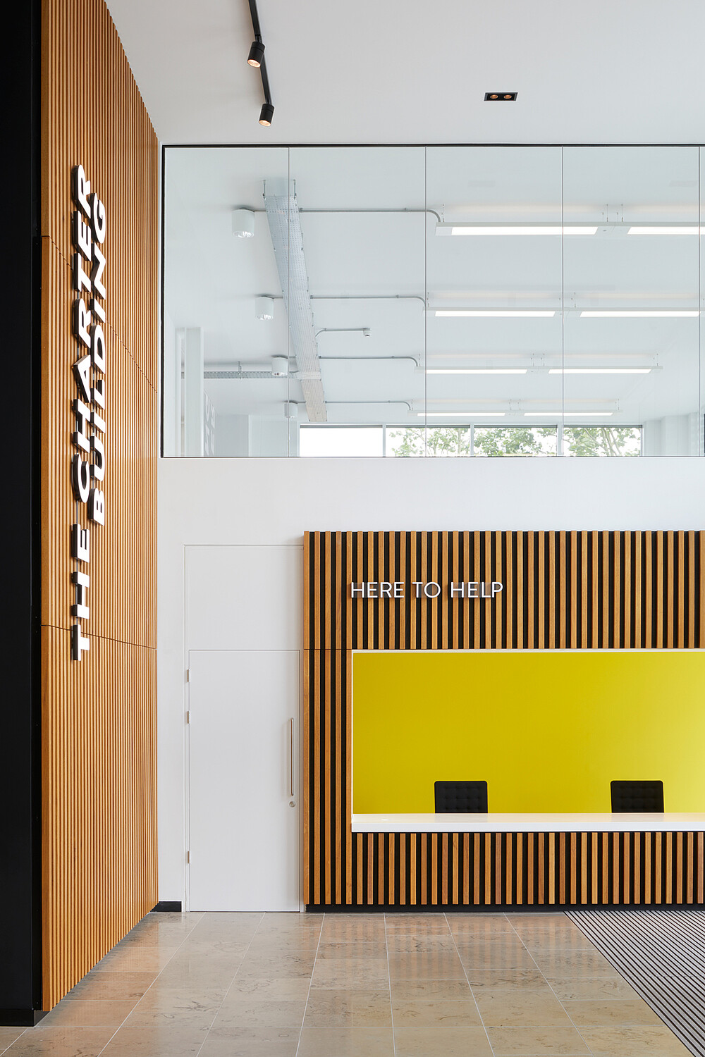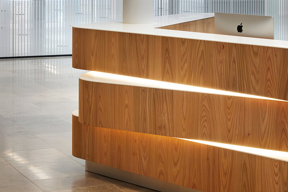 Mit dem „Charter Building“ nahm das Architektenteam sich eines 1980er-Jahre-Grundrisses an, einer „vollverglasten Box“, die einst der Hauptsitz von Coca-Cola in Großbritannien war. Ihre architektonische Verjüngung haucht dem Bürogebäude neues Leben ein. Die architektonischen Lösungen sahen die Einführung einer 100 Meter langen „Straße“ im Herzen des Gebäudes vor, die durch die Umfassung des bestehenden Atriums gebildet wurde. Indem sie die Deckenhöhen variierten und Platz für Warte- oder Besprechungsräume bieten, haben sie sowohl Annehmlichkeit als auch neue Anreize geschaffen. Büroflächen bieten zeitgemäße Arbeitsumgebungen, die Bewegung und Flexibilität fördern, und neue Bereiche schaffen, die für Zusammenarbeit, Kommunikation und Kreativität sorgen. So entsteht ein moderner Firmenlook, der auch im Eingangsbereich spürbar ist. Die Lobby wurde als kollaborativer Arbeitsbereich konzipiert und bietet zudem Platz für Rezeption und Concierge-Service. Ein Betonfliesenboden, Holzvertäfelung an den Wänden sowie ein außergewöhnlicher Empfangstisch aus 3 Lagen Holz in Fünfeckform bieten einen atmosphärischen Empfang. In der Rezeption wurde die VarioLED™ Flex VENUS TV W825 in indirekten Nischen installiert, die der Krümmung des Pultes folgen. Das indirekte, warme und punktfreie Licht ist ein angenehmer Empfang für die Besucher und verleiht der Konstruktion etwas Organisches. XOOLINE™ HD15 W830 wurde im Handlauf installiert und unterstützt die Besucher in ihrer räumlichen Orientierung. An der südlichen Eingangshalle wurde die MARS LD10 W830 im oberen Teil der Decke eingelassen. In der Wandnische wurde die VarioLED™ Flex HYDRA HD10 in einem 45°-Profil verdeckt an der Oberseite der Nische installiert.