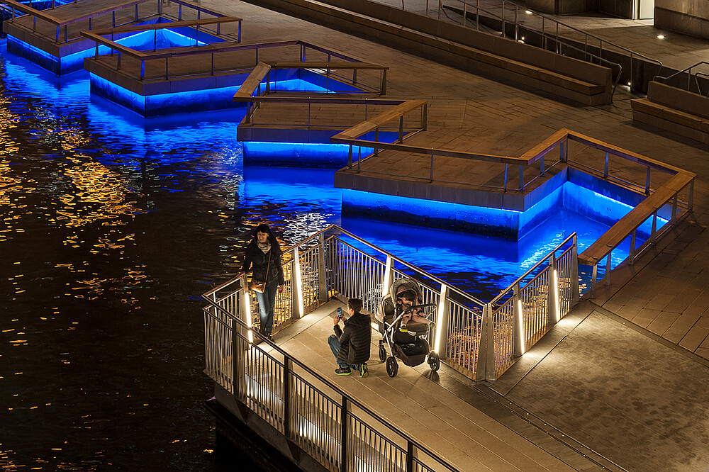 Die Beleuchtung für den neu gestalteten Riverwalk wurde entworfen, um spielerisch, einladend und interaktiv zu sein – eine drastische Abkehr von der starken, sicherheitstechnischen Beleuchtung der Vergangenheit. In der Anlegestelle „The Jetty“ kam die VarioLED™ Flex VENUS TV RGB oder die „Fischleuchten“ zum Einsatz, so nannten die Architekten die farbverändernden LED-Leuchten an der Grenze von Wasser und Land. Die vom Designteam in diesem Projekt eingesetzten Unterwasserleuchten und Verdrahtungslösungen wurden wenige Tage nach der Eröffnung geprüft, als die Anlage komplett überflutet wurde und die Leuchten eingeschaltet blieben.
