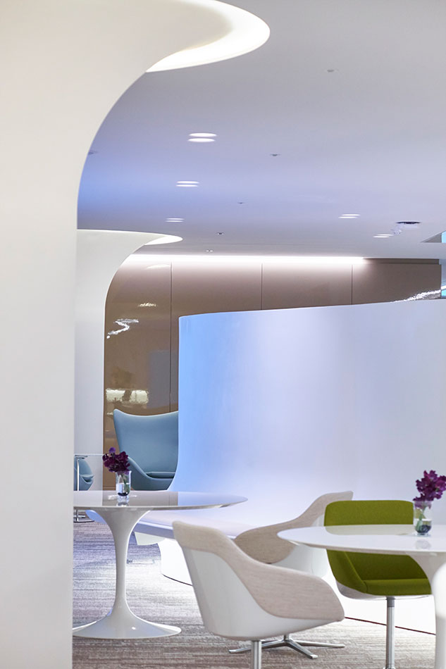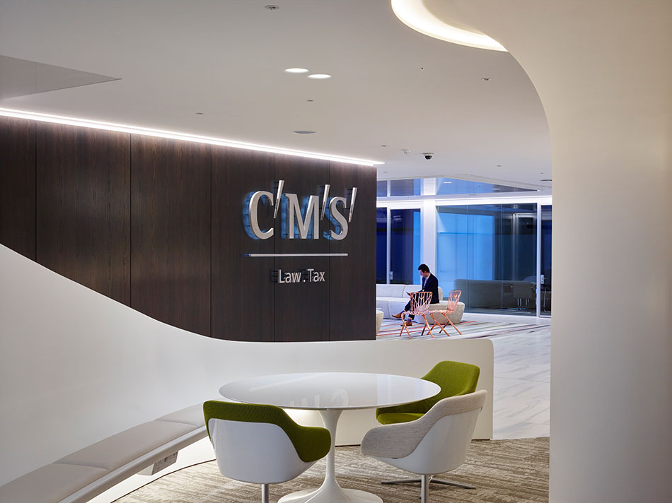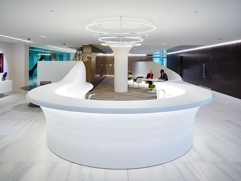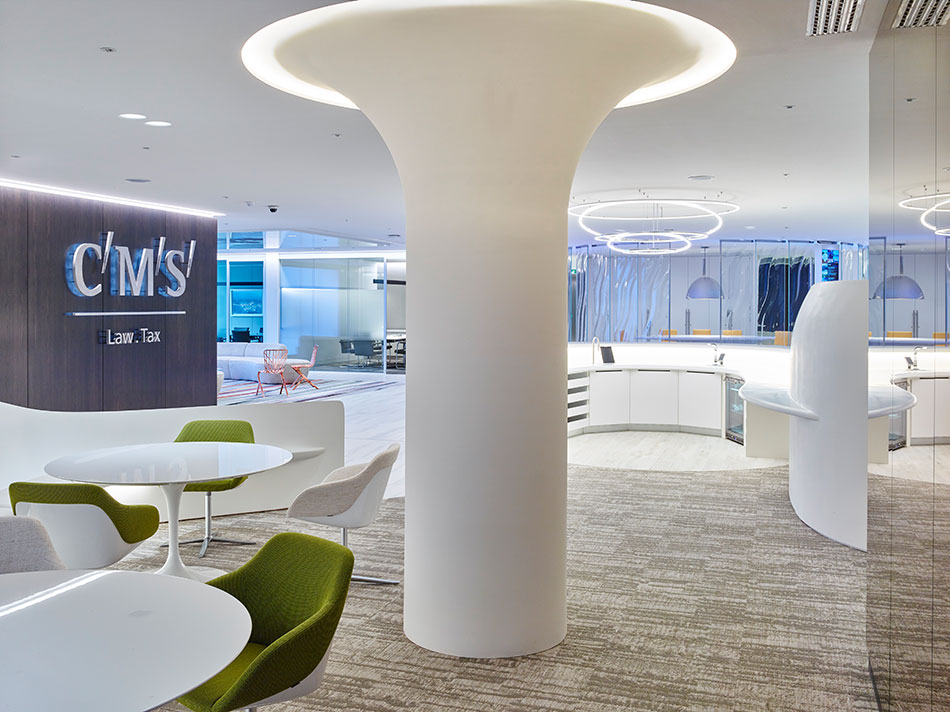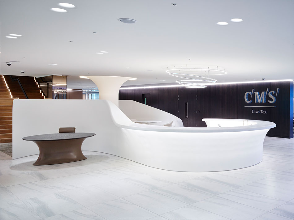 Das Bürogebäude der CMS Cameron McKenna LLP liegt zentral in London unweit der Themse. In diesem modernen Büro steht der Mensch ganz klar im Mittelpunkt, was sich in Raumgestaltung und Beleuchtungskonzept wiederspiegelt. Im Eingangsbereich werden Mitarbeiter, Kunden und Besucher von organischen Formen und sanfter indirekter Beleuchtung in Empfang genommen. Der hier entstandene Meetingbereich ist exklusiv und lädt zum Verweilen ein. Die runde Empfangstheke und die geschwungenen Sitzmöglichkeiten werden mit flexiblen Lichtlinien der VarioLED™ Flex HYDRA Serie in der Lichtfarbe 3.000 K elegant betont. Auch die Wandflutungen im Gebäude werden mit flexiblen Lichtlinien in 3.000 K realisiert.