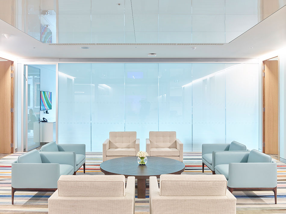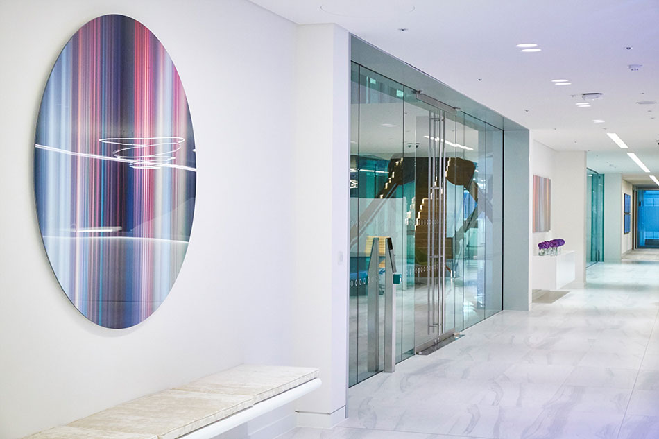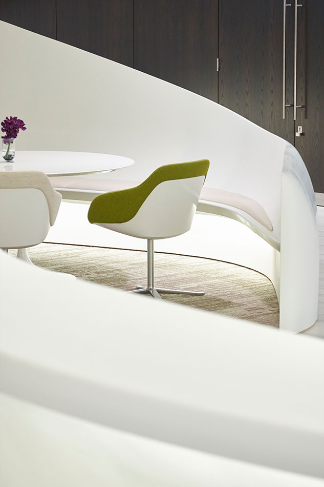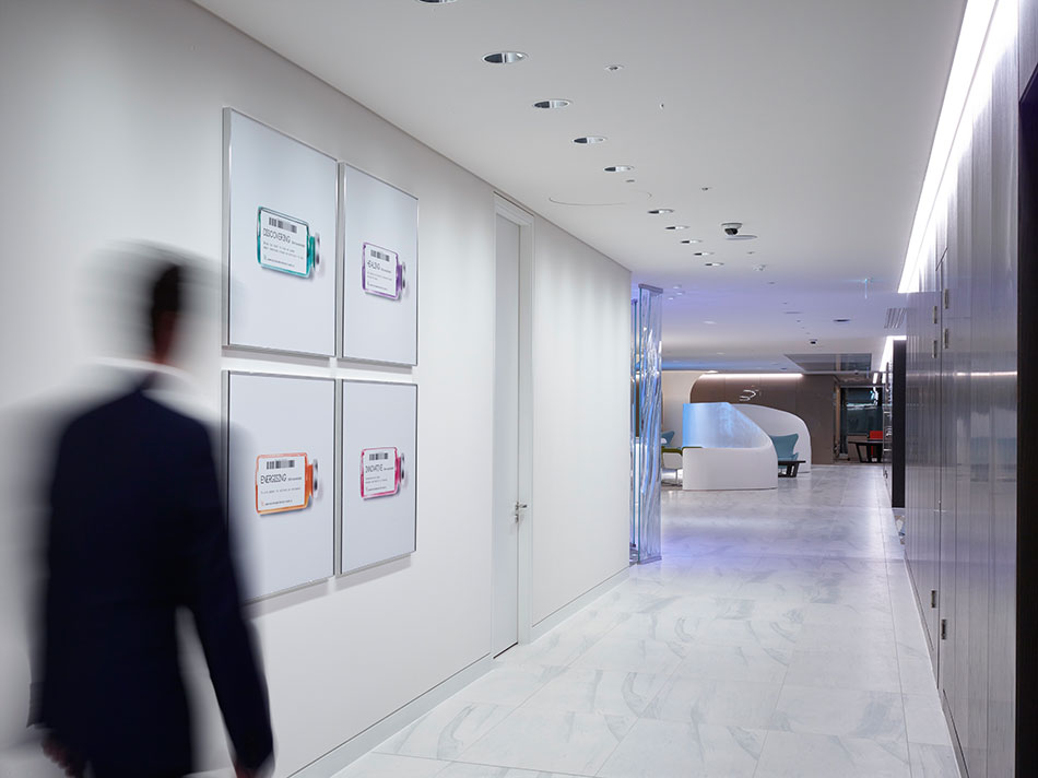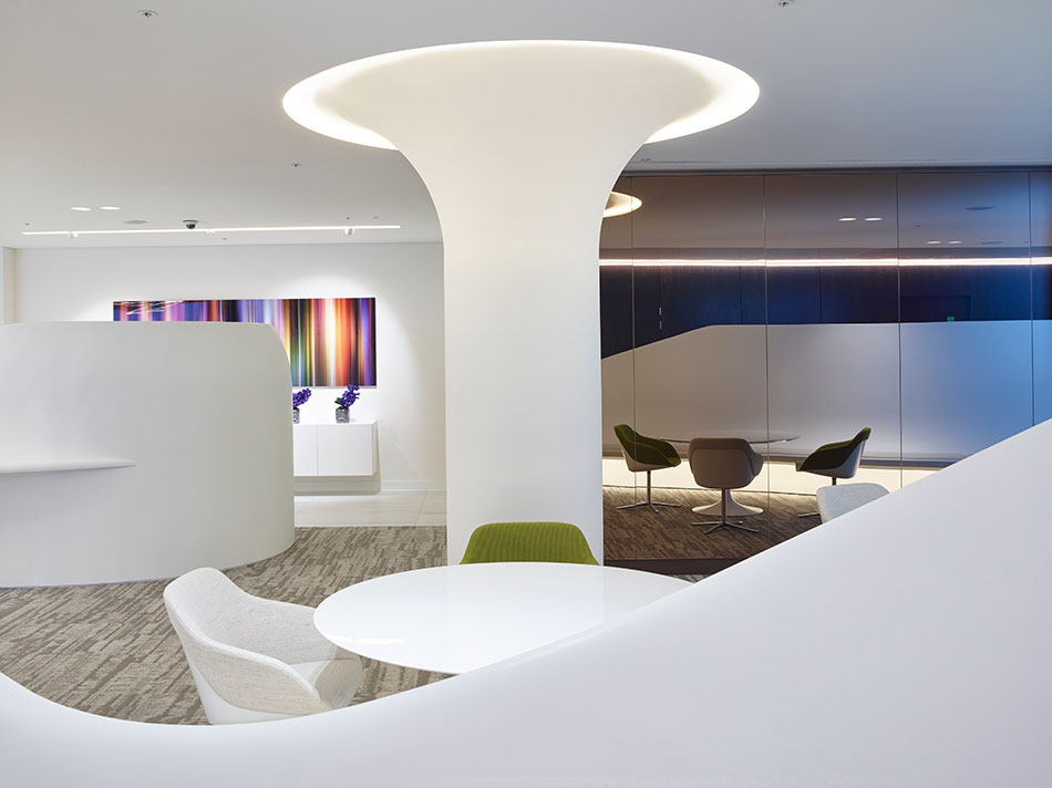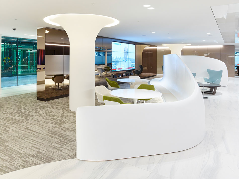 Das Bürogebäude der CMS Cameron McKenna LLP liegt zentral in London unweit der Themse. In diesem modernen Büro steht der Mensch ganz klar im Mittelpunkt, was sich in Raumgestaltung und Beleuchtungskonzept wiederspiegelt. Im Eingangsbereich werden Mitarbeiter, Kunden und Besucher von organischen Formen und sanfter indirekter Beleuchtung in Empfang genommen. Der hier entstandene Meetingbereich ist exklusiv und lädt zum Verweilen ein. Die runde Empfangstheke und die geschwungenen Sitzmöglichkeiten werden mit flexiblen Lichtlinien der VarioLED™ Flex HYDRA Serie in der Lichtfarbe 3.000 K elegant betont. Auch die Wandflutungen im Gebäude werden mit flexiblen Lichtlinien in 3.000 K realisiert.