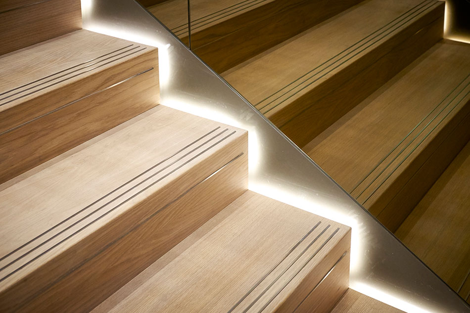 Ein optisches Highlight im Gebäude ist die mit VarioLED™ Flex HYDRA HD10 auf Contour 005 attraktiv beleuchtete Treppe. Durch die Ausleuchtung der Stufen werden die Nutzer sicher von einem ins andere Stockwerk geleitet, Kunden oder Besuchern des Gebäudes bietet die Beleuchtung zudem Orientierung.