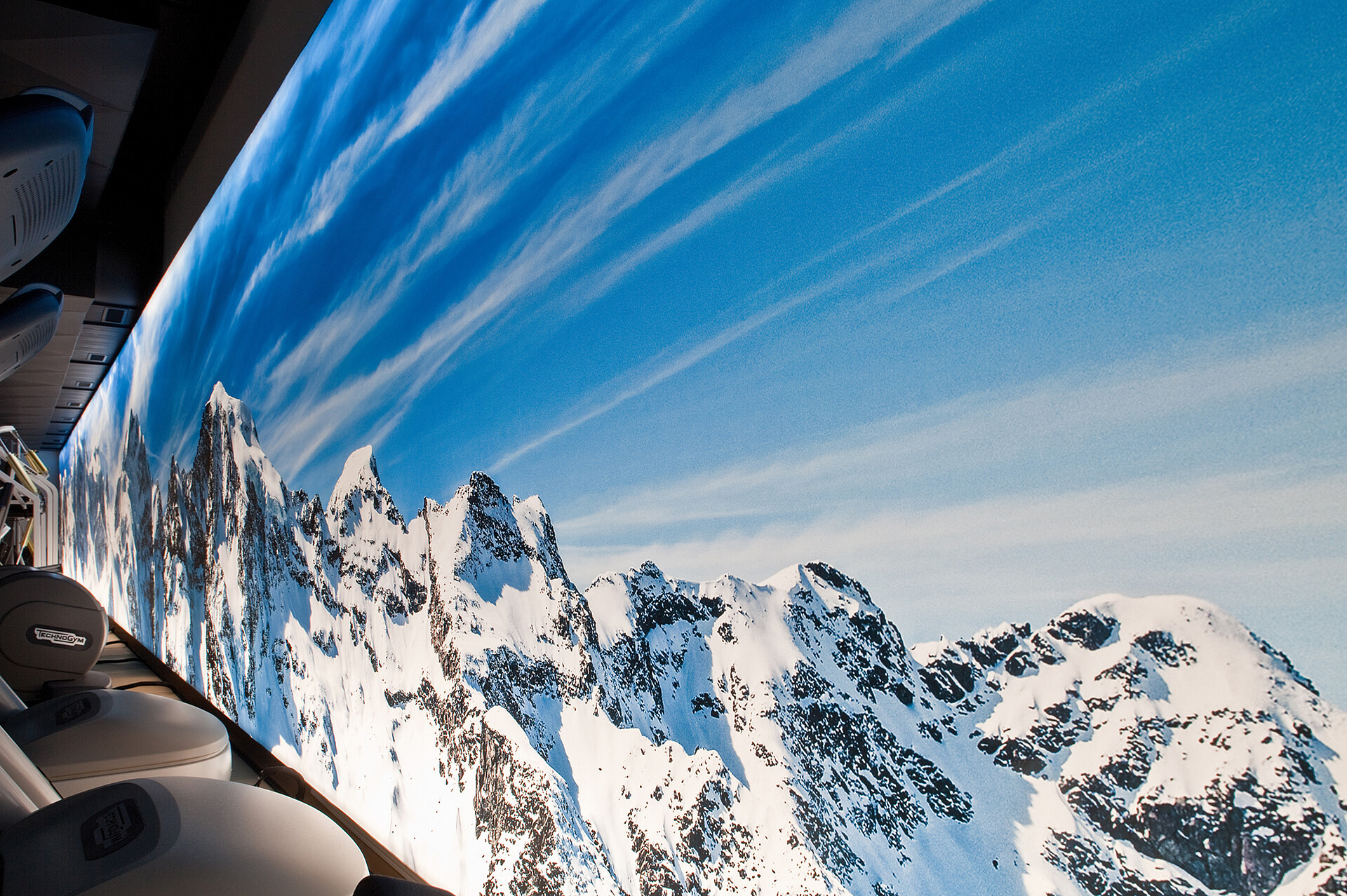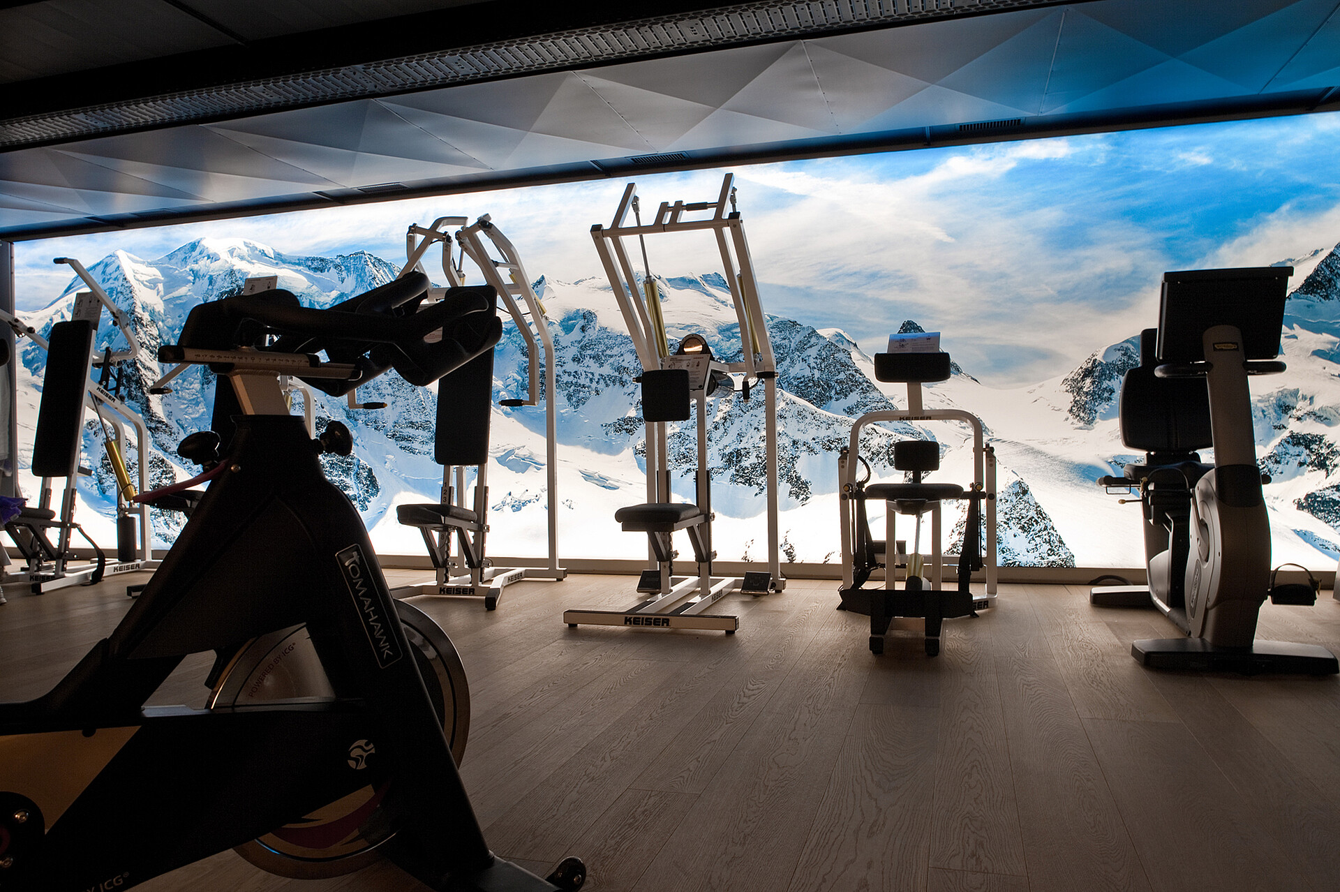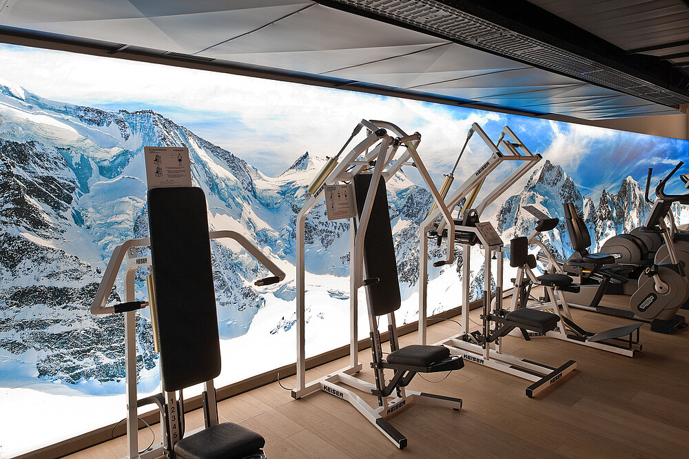 Bei der Neugestaltung des Fitnessbereichs im 4 Sterne Crystal Hotel in St. Moritz schuf LIGHT ON durch ein überdimensionales Lichtbild eine völlig neue Raumdimension. Inspiriert durch ein anderes Projekt, wünschte sich der Architekt für den Raum die Illusion eines weitschweifenden Blicks in eine Berglandschaft: Der sehr schmale, langgezogene und niedrige Raum sollte über die ganze Länge mit einem einzigen Bildmotiv erhellt werden.