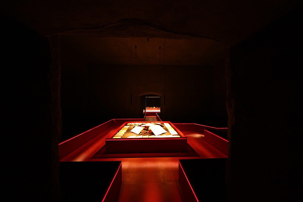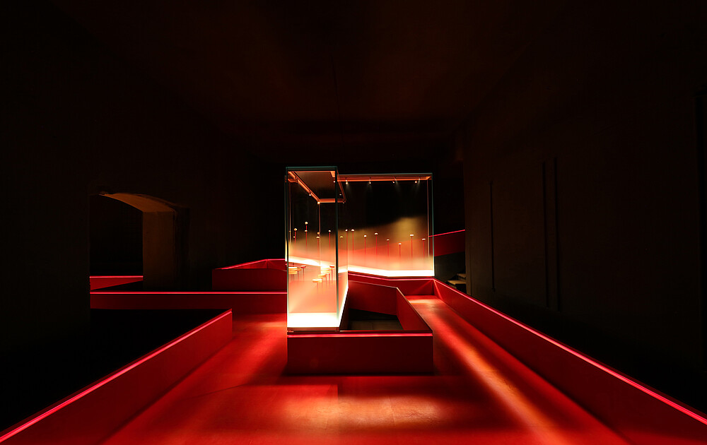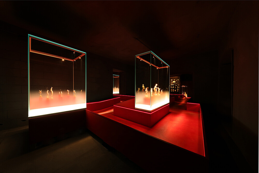 Nach der Schließung des alten Standorts zog das Deutsche Elfenbeinmuseum in bis dahin ungenutzte Nebenräume des Schlosses Erbach. Sichau & Walter Architekten planten mit roten Stegen in abgedunkelter Umgebung eine mystisch anmutende Inszenierung der alten Schnitzkunst, die durch die Licht-Expertise des Büros LichtKunstLicht komplettiert wurde. Im Folgenden erläutern die Lichtplaner Stephanie Große-Brockhoff und Andreas Schulz ihr Beleuchtungskonzept und die Intentionen dahinter.