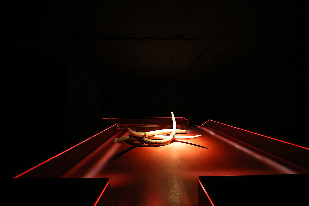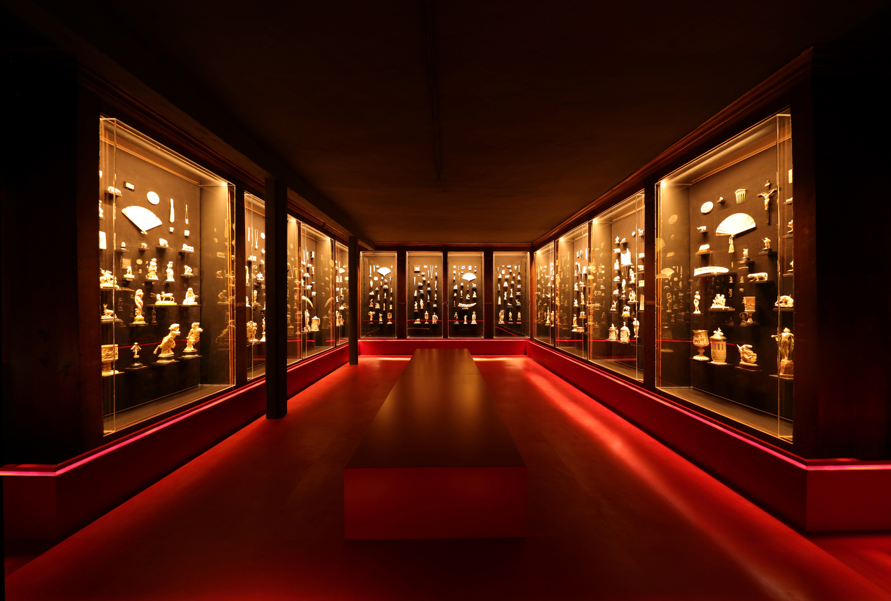 In einem Raum werden vorhandene historische Wandschränke genutzt, in denen eine Fülle von kleinen Objekten an der mit Molton bezogenen Rückwand befestigt sind. Die Exponate werden durch im Möbel verdeckt montiertes lineares Licht hervorgehoben. Die LED-Leisten sind hierfür sowohl oben durchlaufend horizontal als auch seitlich durchlaufend vertikal angeordnet. Die Verortung der Leuchten erfolgte dabei so, dass ein Optimum an Ausleuchtung mit einem Minimum an Sichtbarkeit der Lichtquellen verbunden ist. Der letzte Raum, wechselnden Ausstellungen gewidmet, verabschiedet den Besucher derzeit mit einem Blick auf noch unbearbeitete Elefanten- und Mammut-Stoßzähne und macht so auch die kontroverse Seite des Ausstellungsthemas spürbar. Die Vitrinenstrahler, das Kantenlicht, die Stegbeleuchtung und die Ausleuchtung der Bestandsschränke lässt sich vitrinen- beziehungsweise raumweise per Fernbedienung dimmen und schalten. Die Dimmwerte der einzelnen Komponenten sind dabei so eingestellt, dass inszenatorische und raumbildende Gesichtspunkte optimal berücksichtigt sind. In Anlehnung an die vorherrschenden Rottöne von Vitrinensockeln und Erschließungssteg wurde für alle Beleuchtungselemente die Lichtfarbe Warmweiß ausgewählt. Diese hebt die Exponate zusätzlich mittels Farbperspektive aus ihrem Umfeld hervor und materialisiert sie durch Focal Glow. So unterstützt LichtKunstLicht durch versteckte, gut entblendete Lichtquellen die kontrastreiche Ausstellungsdramaturgie und setzt solcherart die Kleinodien brillant in Szene.