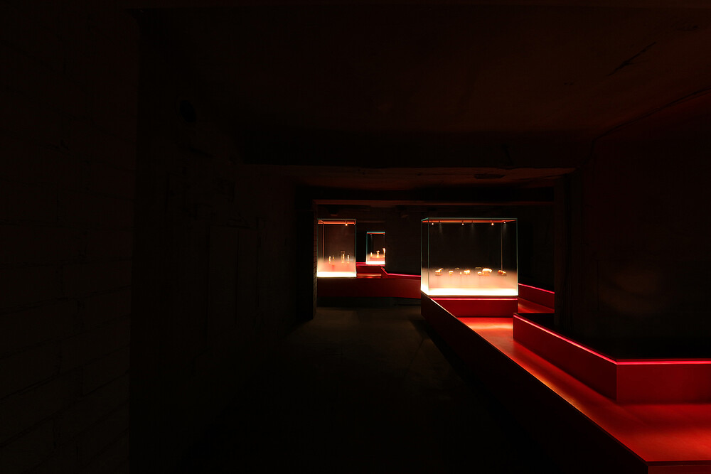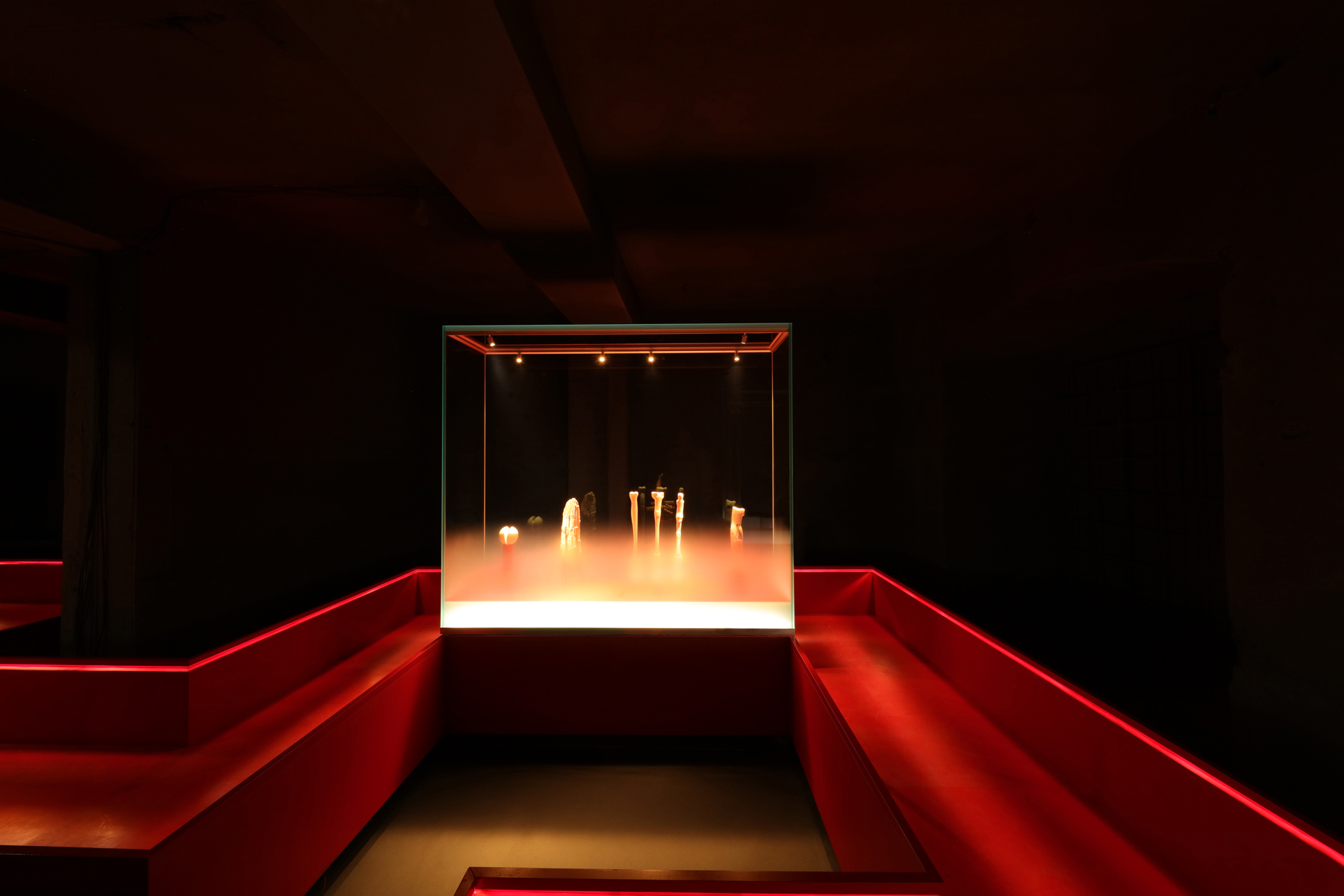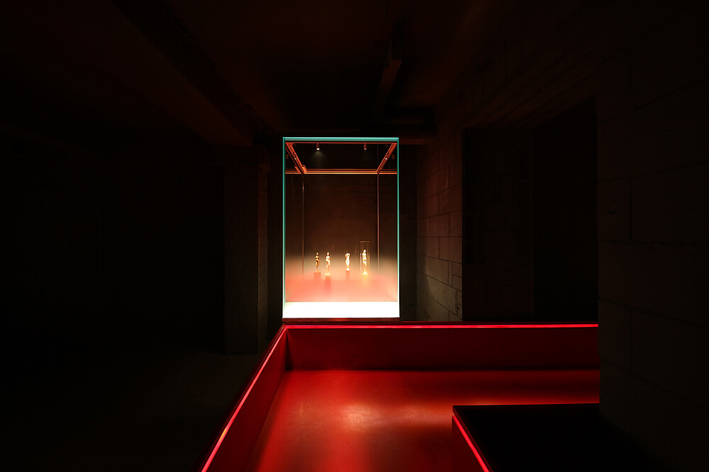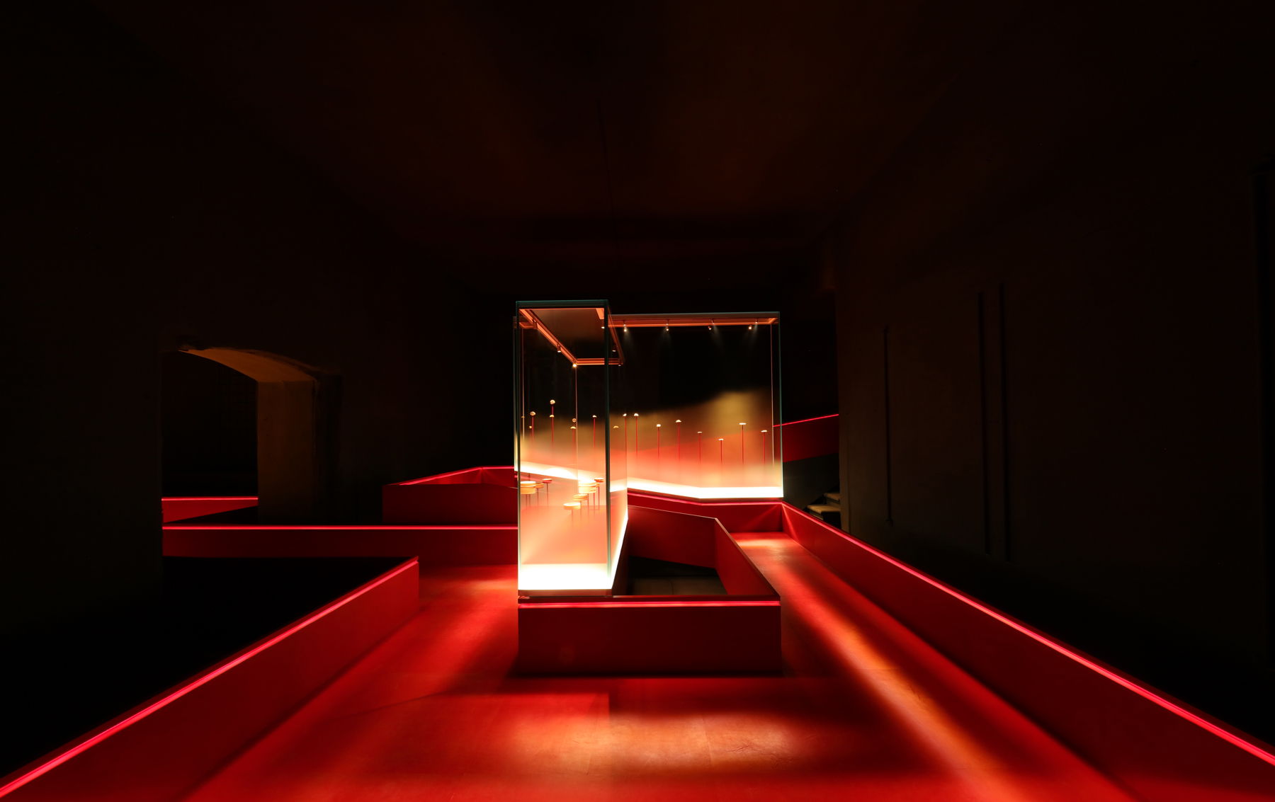 Die im unteren Drittel satinierten Vitrinengläser werden aus der Basis heraus mit Kantenlicht eingespeist. Die Satinierung löst sich in einem stufenlosen Verlauf in Klarglas auf. Durch das kanteneingespeiste Licht nimmt sie eine sanfte Helligkeit an, die – einem Dunst gleich – die Objektträger der Elfenbeinfigurinen verhüllt. So entsteht der Eindruck, die Schnitzereien würden gleichsam leuchtend aus dem Nebel aufsteigen. Die Konverter, sowohl für die Kanteneinspeisung des satinierten Glases als auch für die Miniaturstrahler befinden sich in einem zugänglichen Hohlraum im Fuß der Vitrine. Der begehbare Steg und seine niedrige Balustrade sind wiederum mit rotem Leder bezogen. Durch ein verdecktes LED-Lichtband in der Aufkantung wird die Lauffläche zum freischwebenden Pfad in einer nicht greifbaren, völlig ausgeblendeten Raumhülle. Dafür ist eine seitliche Fräsung in den oberen, innenliegenden Flanken erfolgt. Die schräg auf den Steg ausgerichteten Öffnungen nehmen LED-Lichtbänder auf, die durch Wabenraster vor Einblicken aus langen Achsen geschützt werden.