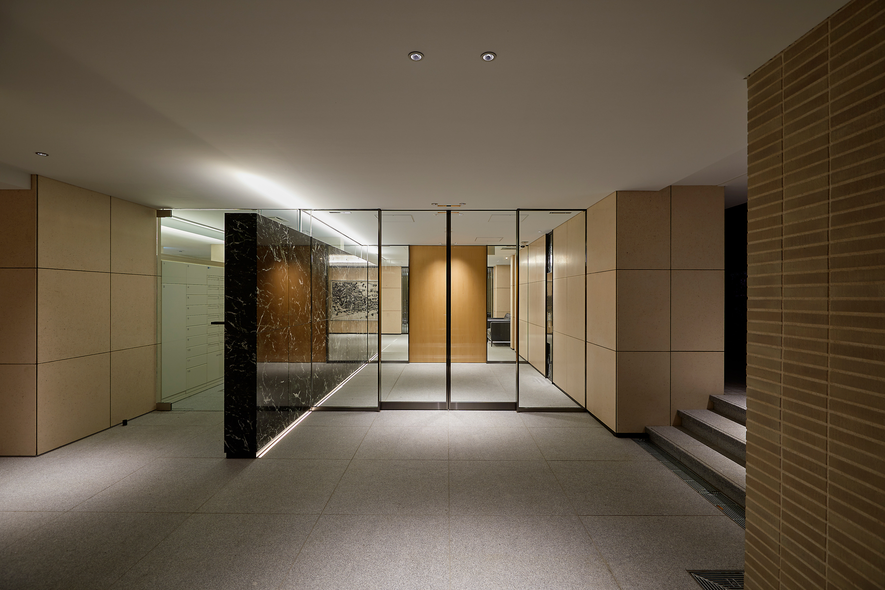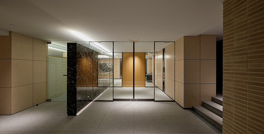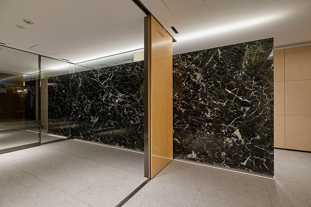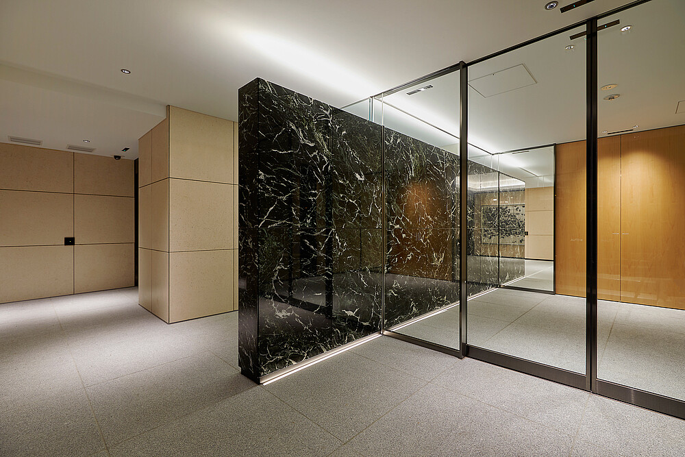 Im Eingangsbereich des Gebäudes wurde die ADONIS IP67 installiert. Durch die klaren Lichtlinien im Boden, wird Orientierung für die Besucher geschaffen. Gleichzeitig hebt sie das marmorierte Muster der Wand hervor.