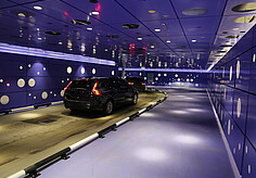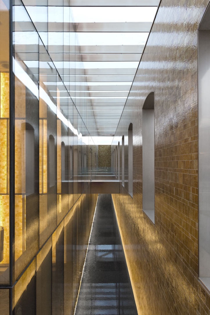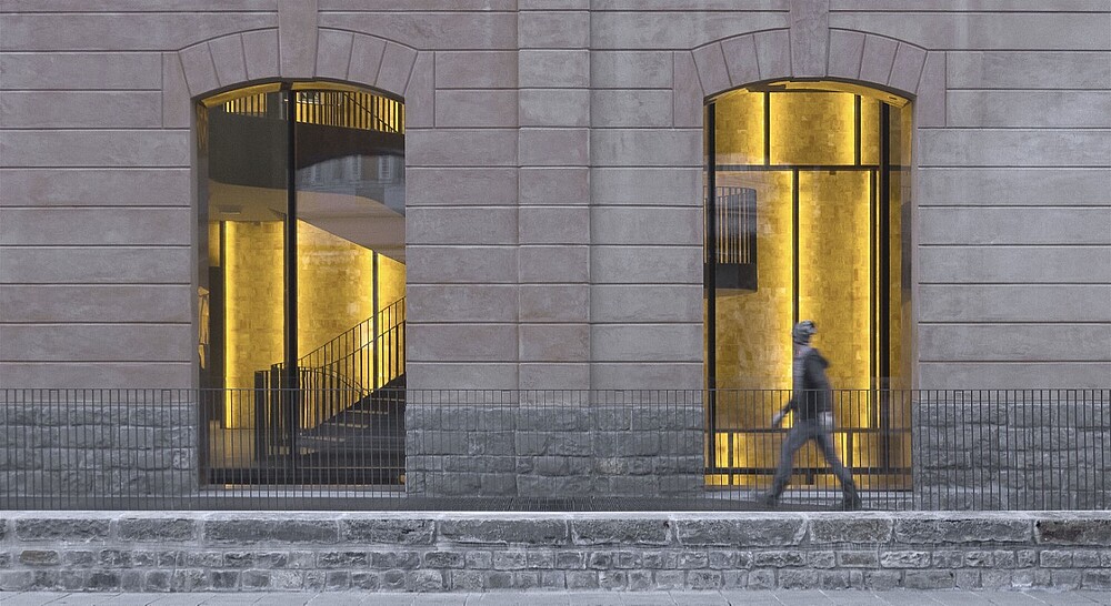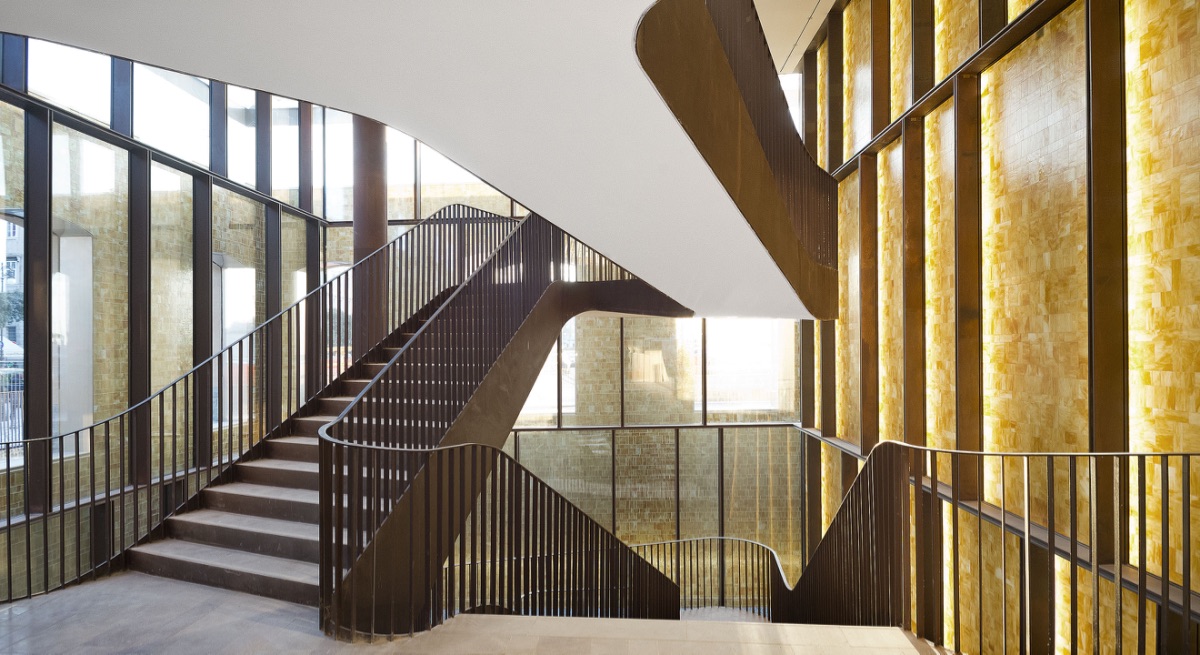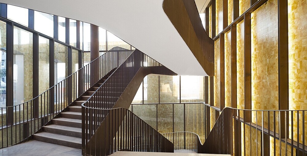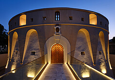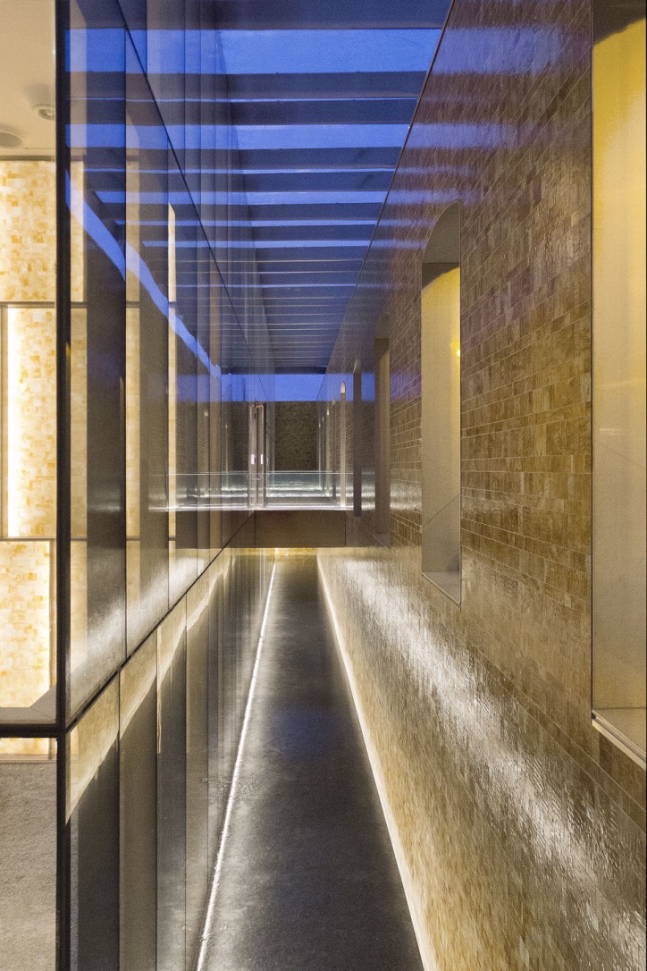 Das Atrium des Gebäudes verfügt über eine majestätische Doppeltreppe aus COR-TEN-Stahl, die an ein Theaterfoyer erinnert. Die Treppe, die die drei Verkaufsetagen miteinander verbindet, hat an ihrem Fuß zwei spektakuläre Wasserbecken. Das LED-Band VarioLED™ IP67 wurde in dieser umlaufenden Rinne bündig zum Wasser installiert. Die Beleuchtung setzt das Wasserbecken auf geschmackvolle Art und Weise in Szene. Im Atrium befindet sich außerdem eine große, mit hinterleuchteten Glasbausteinen verkleidete Wand, die in Form und Material an die Innenverkleidung der historischen Tanks erinnert, in denen früher Wein gelagert wurde. An der Rückseite der Glaswand wurde die XOOLINE™ IP20 mit einer linearen Linse installiert. Dadurch bietet sich dem Besucher eine stimmungsvolle und beeindruckende Lichtkulisse, die schon von außen durch die großen Fenster nicht zu übersehen ist. Die ADONIS IP67 wurde hinter dem umliegenden Zaun des Gebäudes installiert und ist Dank ihres miniaturisierten Designs von außen kaum sichtbar.