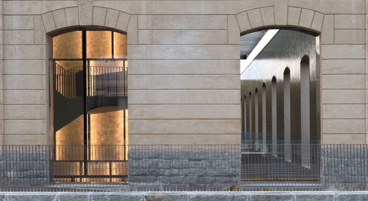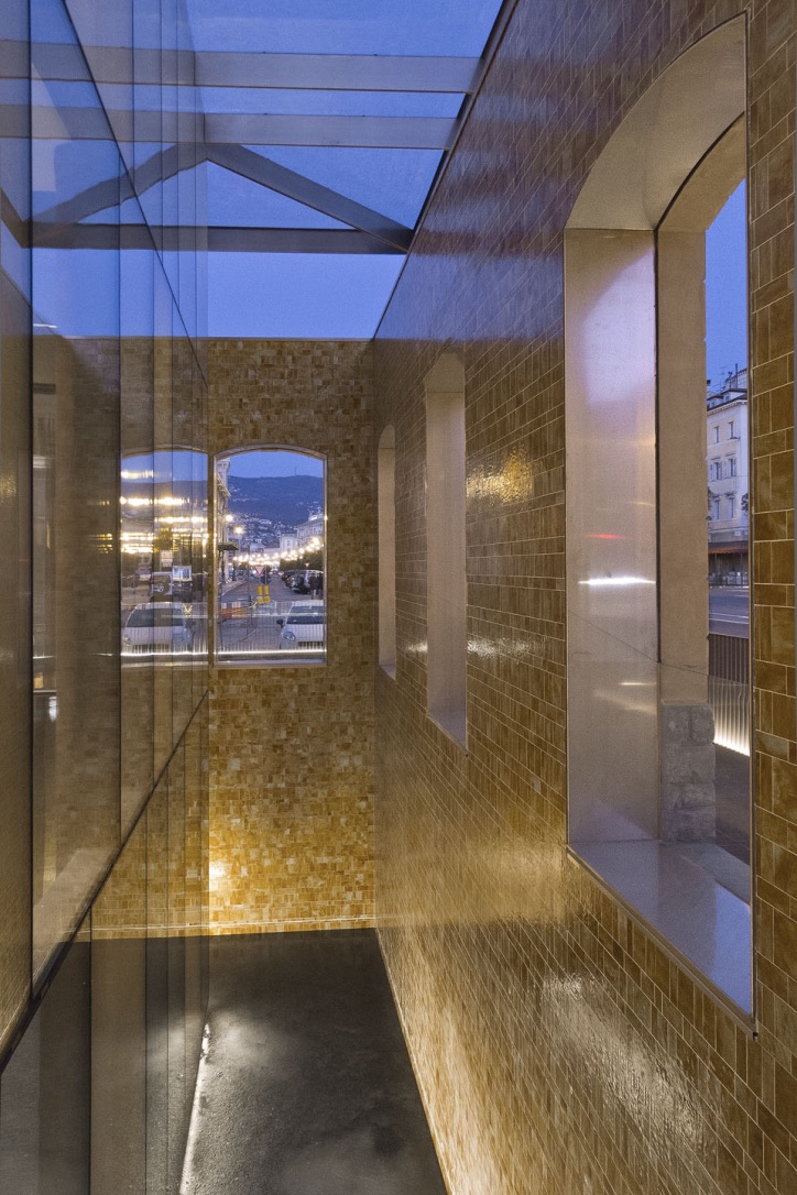Das Glas, das die innere Hülle verschließt, spiegelt die Konturen der Wände des Lagers und seiner Öffnungen wider und ermöglicht die Sicht auf die Aktivitäten, die im Inneren stattfinden. Die ursprüngliche Struktur des Gebäudes wurde beibehalten und die Glasstruktur, die es noch eindrucksvoller und heller macht, erlaubt es, den Hafen und die wunderschöne Landschaft des Golfes zu bewundern.