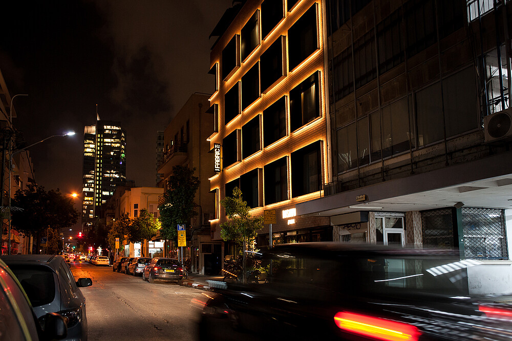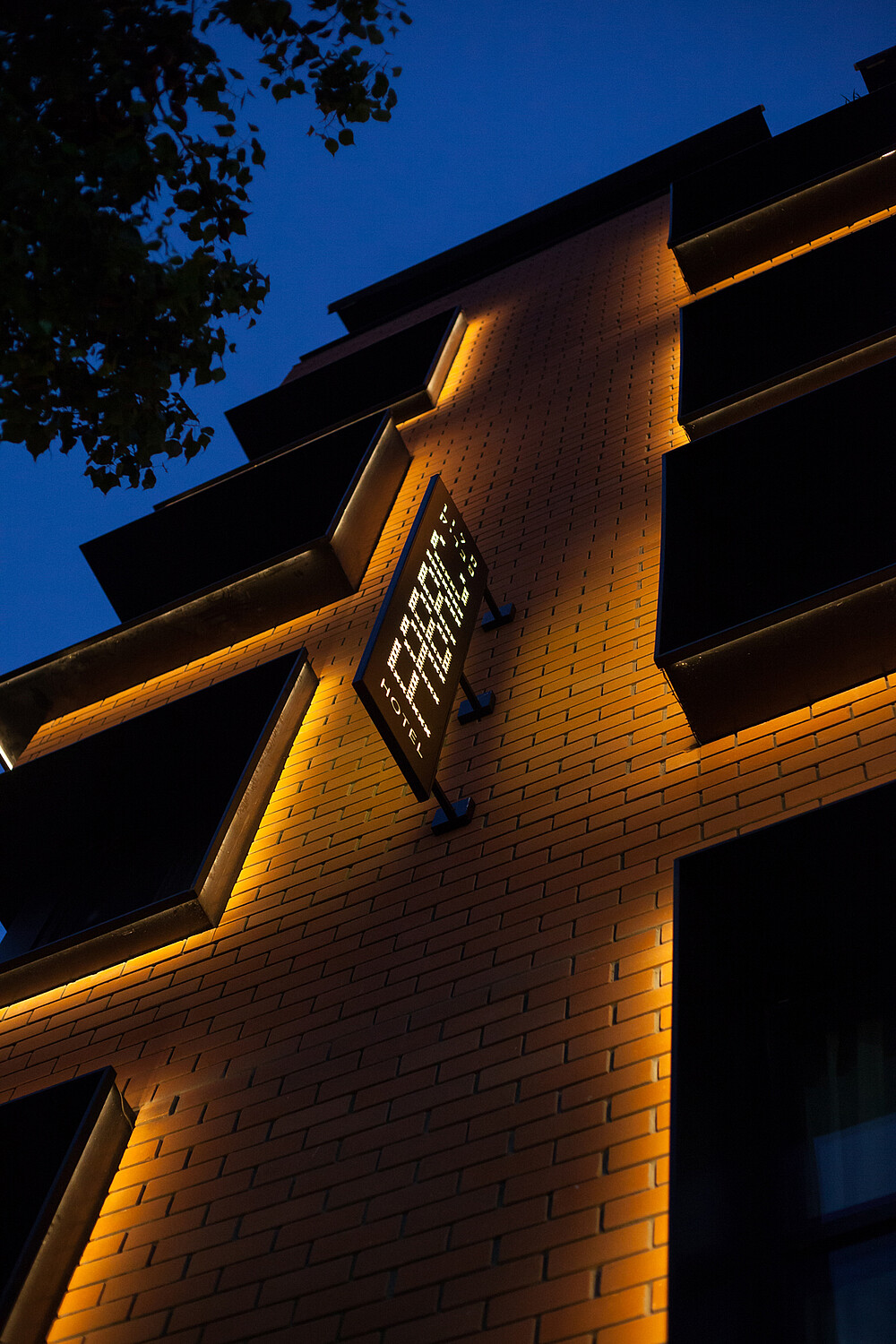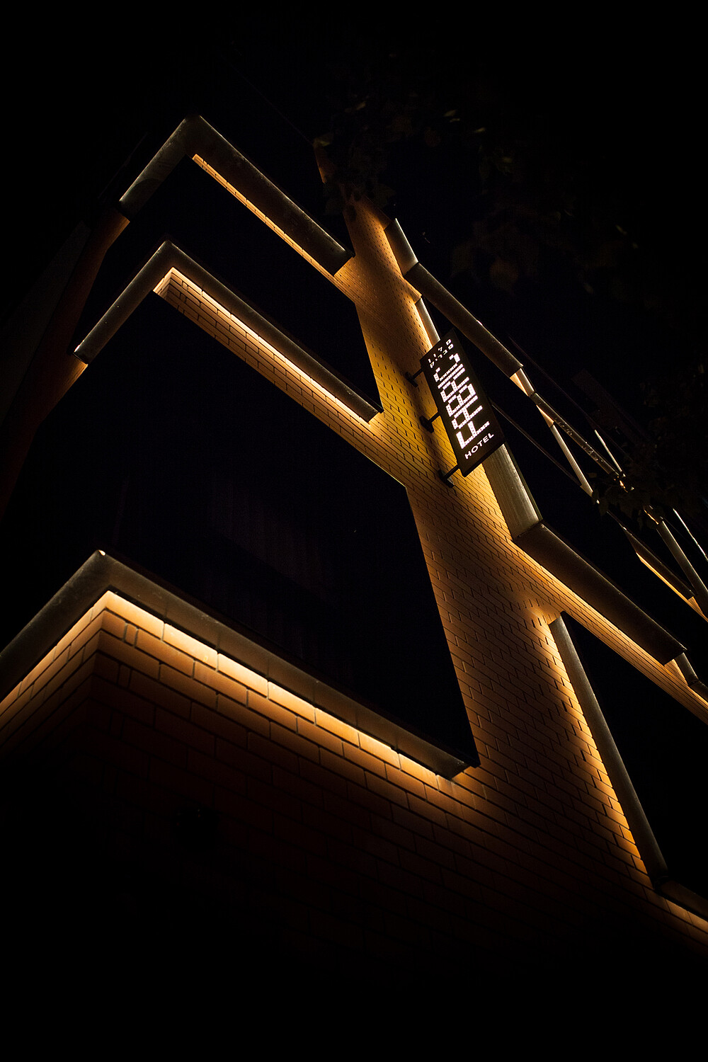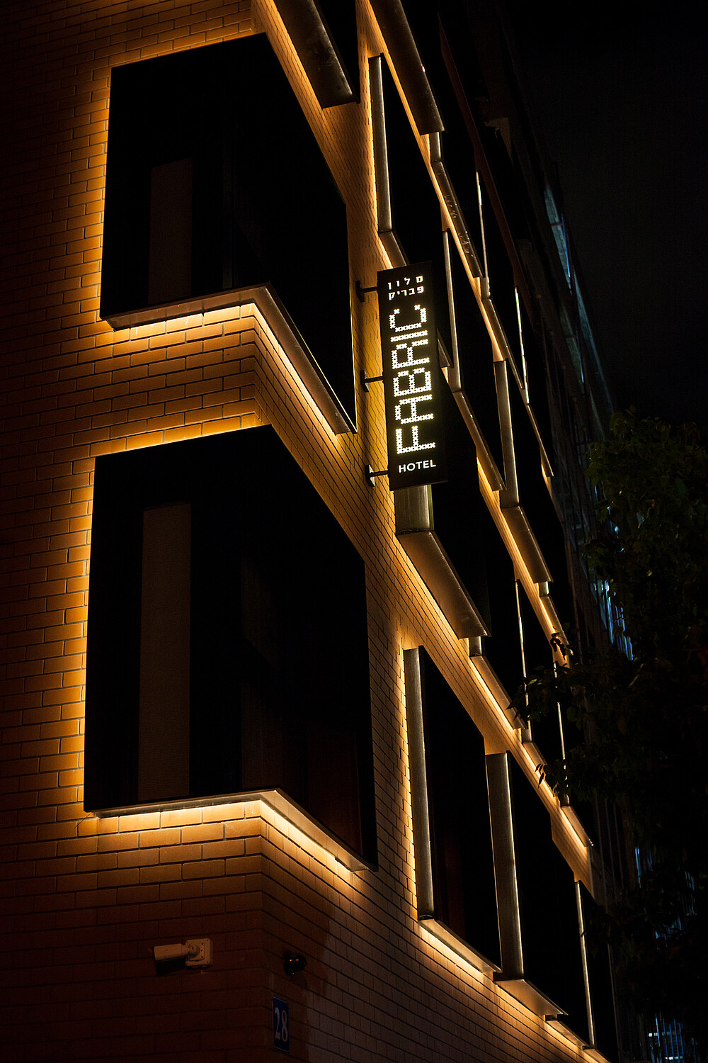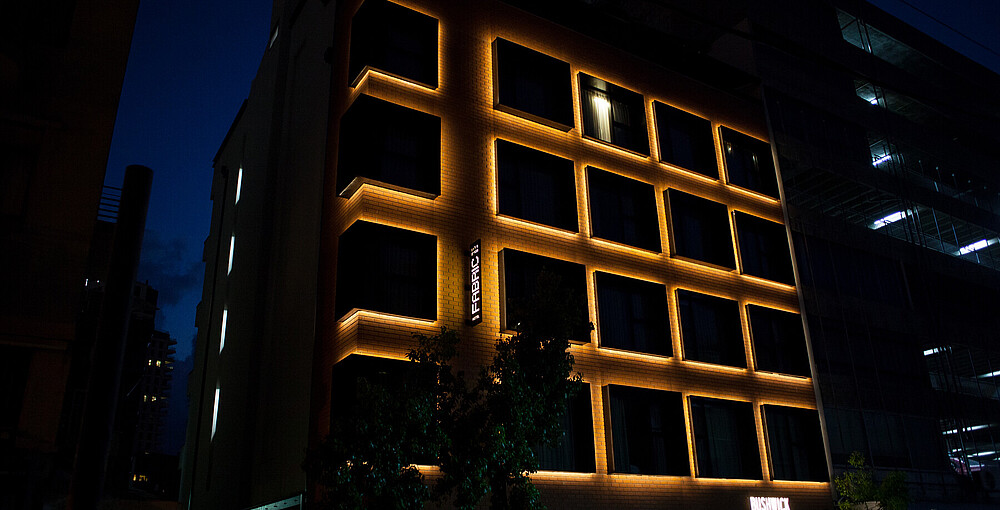Das Fabric Hotel in Tel Aviv, eine ehemalige Näherei, die in ein Boutique-Hotel mit 43 Zimmern umgewandelt wurde, kombiniert raues Industriedesign mit farbenfroher, warmer Kunst. Die Fassade des Gebäudes, die mit roten Silikatsteinen verkleidet ist, erinnert an eine alte Stofffabrik. Die Fensterrahmen aus schwarzem Stahl heben sich durch verstecktes warmweißes lineares Licht von der Mauer ab und erzeugen so eine einzigartige Farbe, die das besondere Material des Silikats betont. Für diese Außenapplikation wurde die flexible Designlichtlinine AMOR mit 2500 Kelvin verwendet.