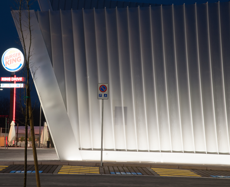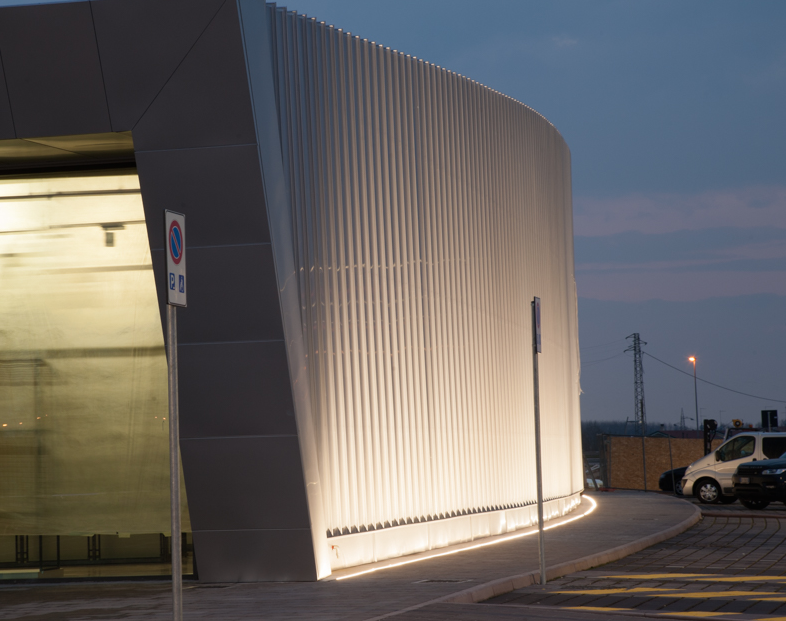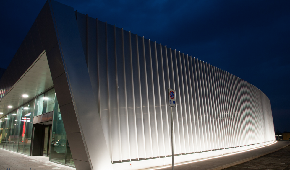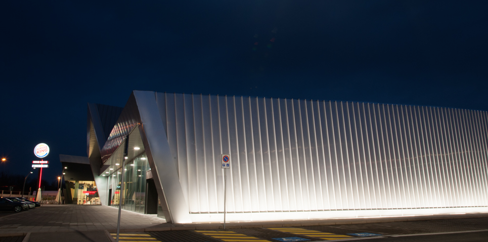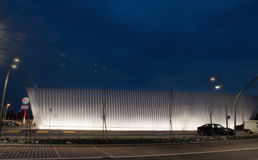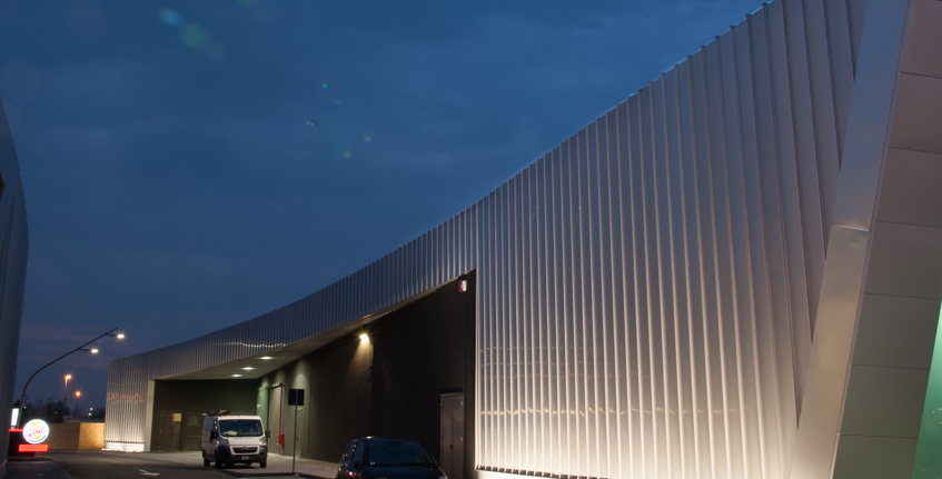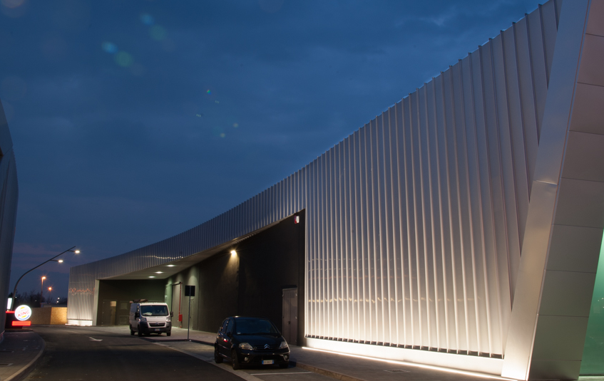 Die Außenfassade des Einkaufszentrums Pittarello in Trevsio wurde eindrucksvoll mit der Außenleuchte KALYPSO IP67 illuminiert.