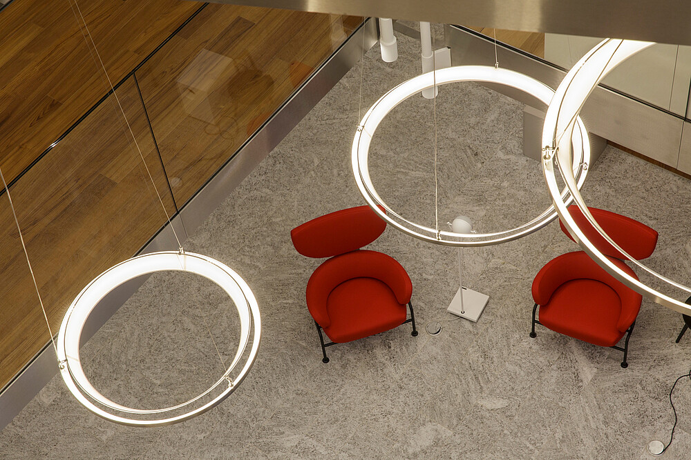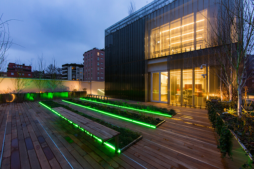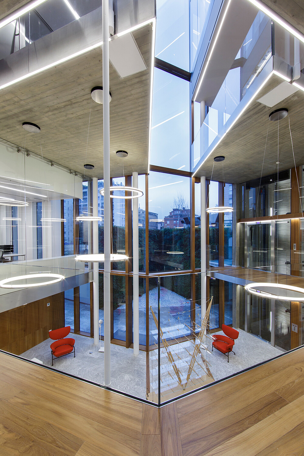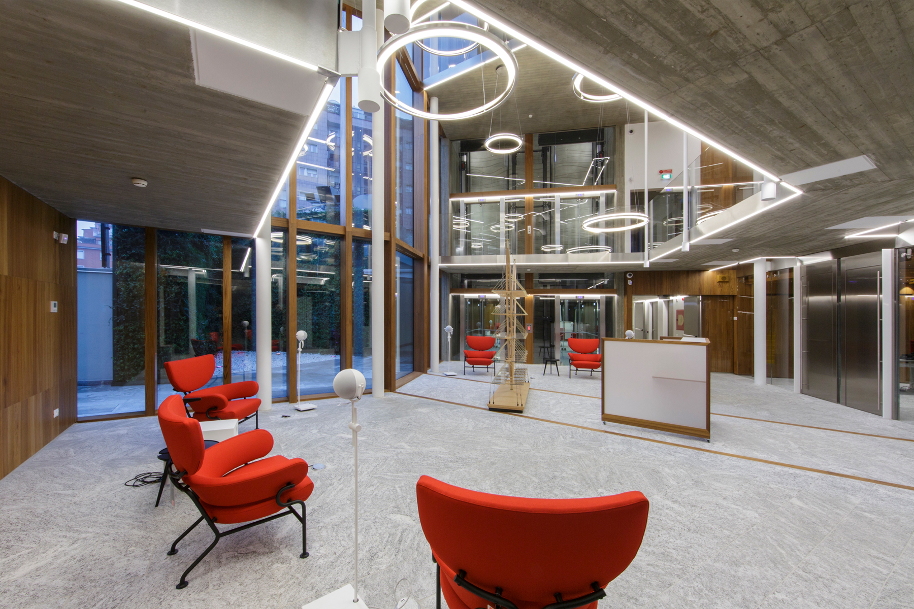 Für diesen Firmensitz des mailländischen Unternehmens wurde funktionales Licht in den Fluren, Hallen und Untergeschossen eingesetzt. In den verschiedenen Anwendungsbereichen befinden sich die Produkte XOOLINE™ HD15 mit opaler Abdeckung in 3.000 Kelvin sowie VENUS Lichtlinien in RGB.
