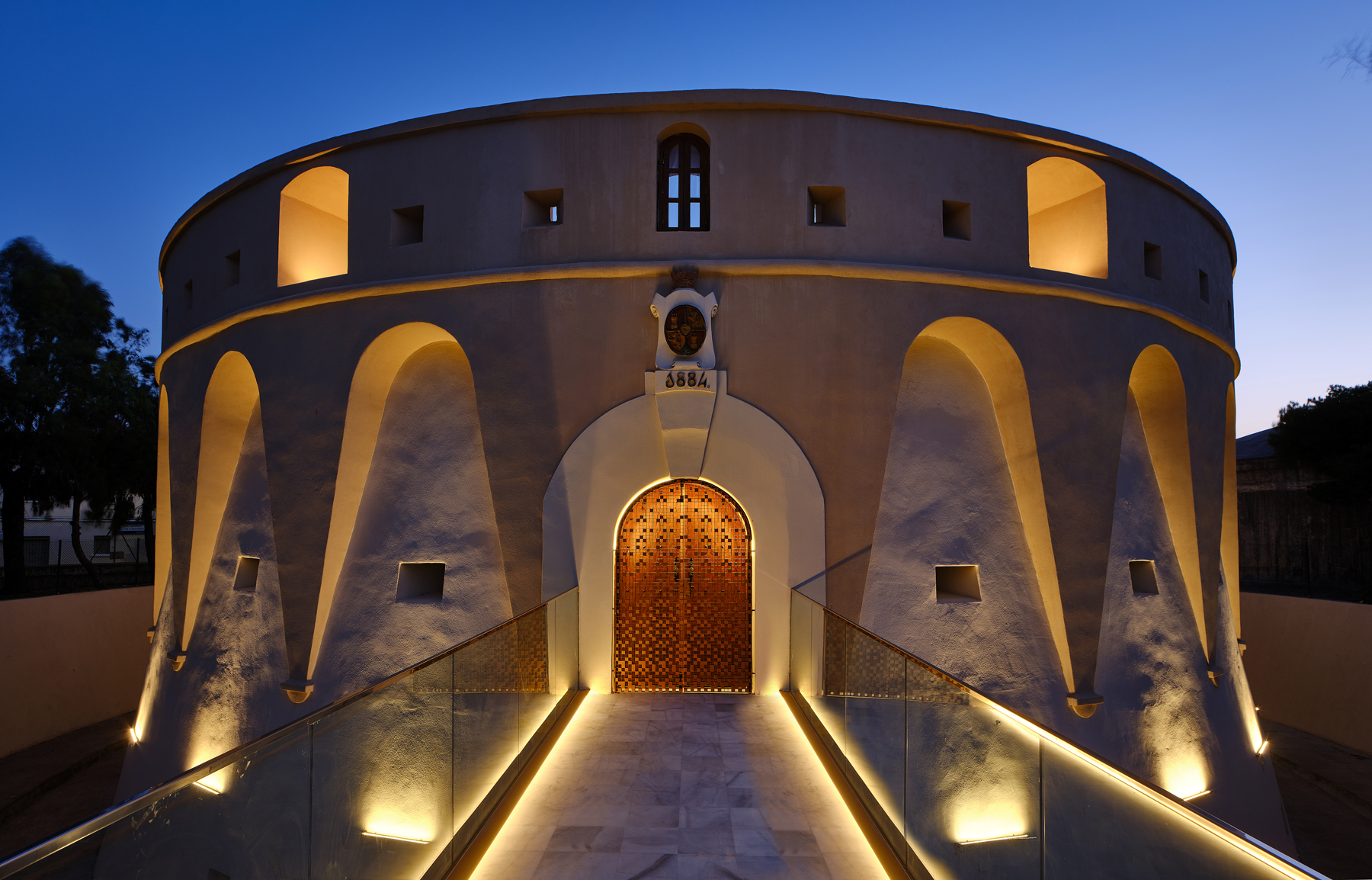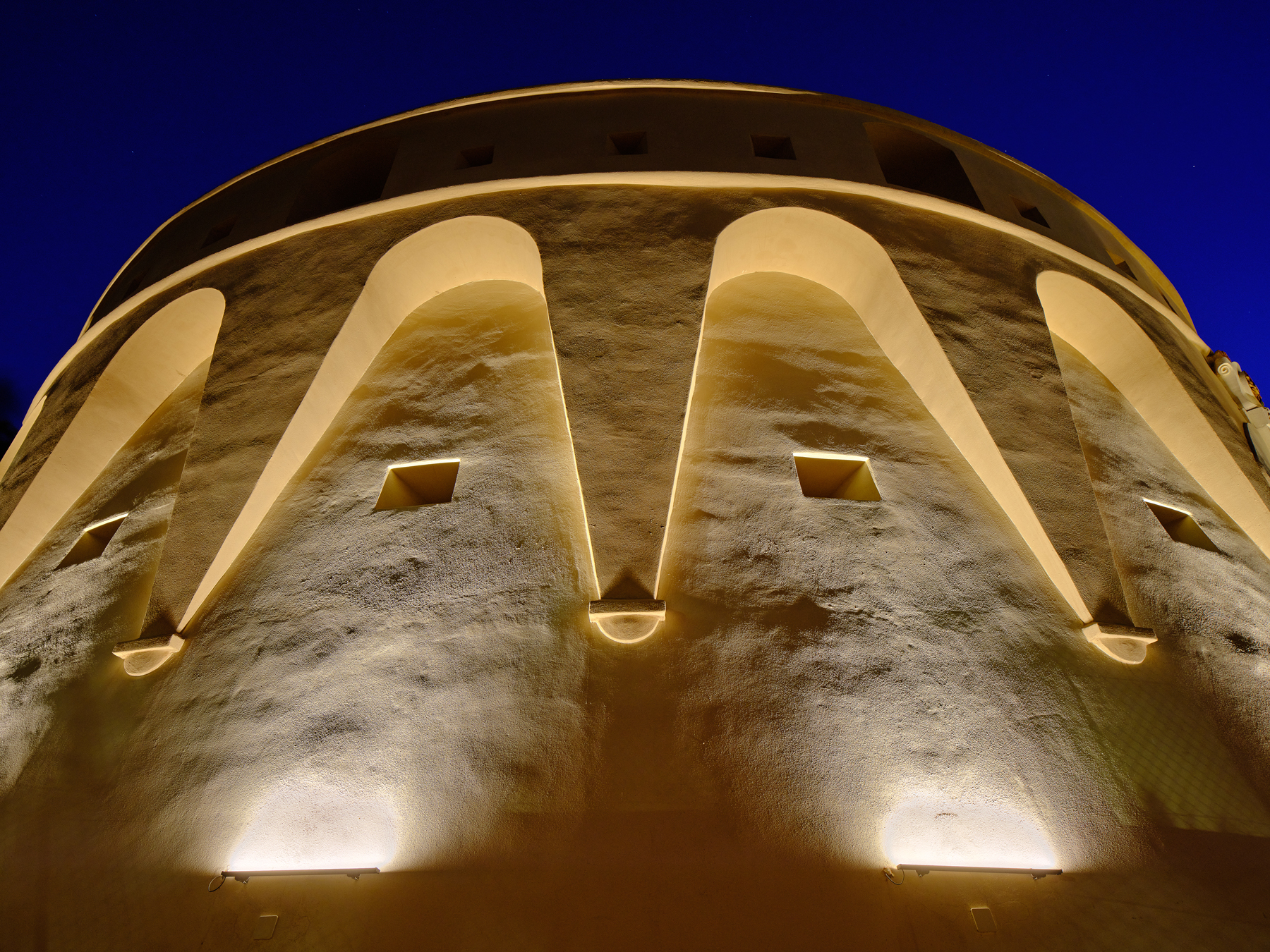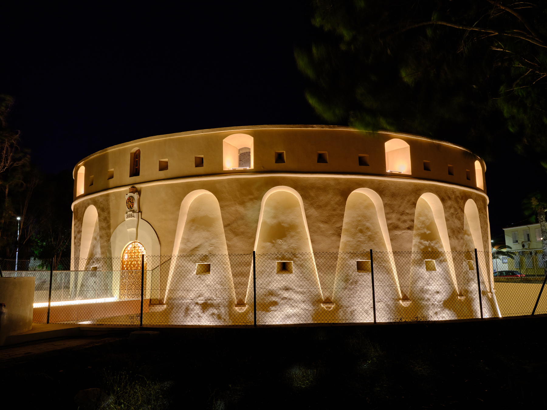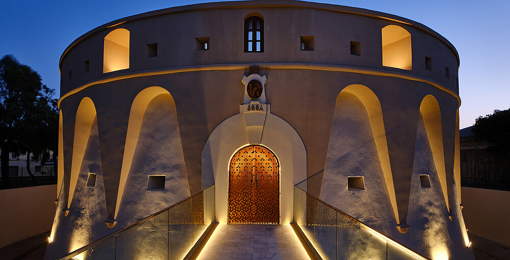 Das Architekturbüro Mnb Architecture unter der Leitung von Mohamed Najim Bourich nutzte die anstehende Renovierung des Fort Los Camellos, um den Austausch der Beleuchtungsanlage in das Projekt einzubeziehen und diese Aufgabe einem Architekturbüro für Beleuchtungsdesign anzuvertrauen, damit die neue elektrische Infrastruktur in die Architektur integriert werden konnte. Die Lichtdesigner DCI Lighting Design haben sich für ein Beleuchtungskonzept entschieden, das durch das Spiel von Licht und Schatten die wichtigsten Wahrzeichen des Baudenkmals hervorhebt und den Besuchern einen akzentuierteren und dramatischeren Anblick bietet, als er bei Tageslicht zu sehen ist. Der Einsatz der KALYPSO-Leuchten mit einer speziellen Optik von 15 x 40° für die Streifbeleuchtung wurde so geplant, dass die Lichtemission in die obere Hemisphäre so gering wie möglich ist und gleichzeitig dieses Hell-Dunkel-Spiel zwischen der Verteidigungsfront und der sie umgebenden Krone erzeugt wird. Außerdem sind die Einrichtungen mit einem CASAMBI Bluetooth-Steuerungssystem ausgestattet, das es ermöglicht, den Gesamtverbrauch der Anlage von 350 W je nach Bedarf auf ein Minimum zu reduzieren und während der Nacht wechselnde Lichtszenen zu erzeugen, die dem Raum mehr Dynamik verleihen.