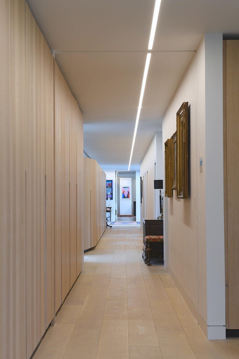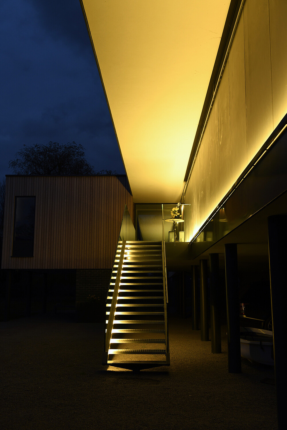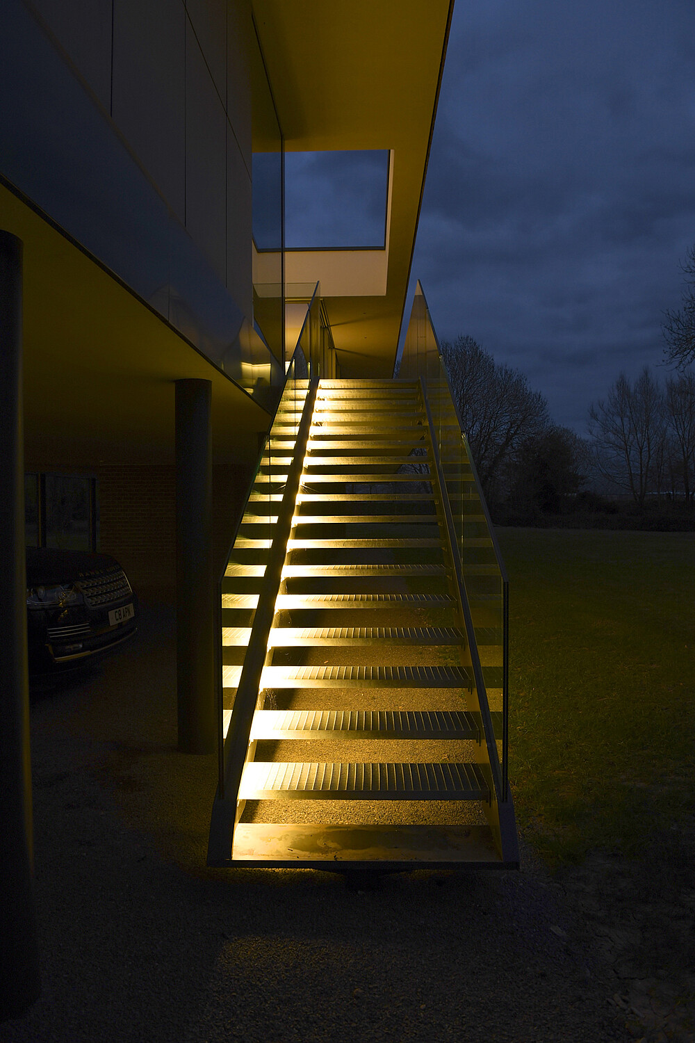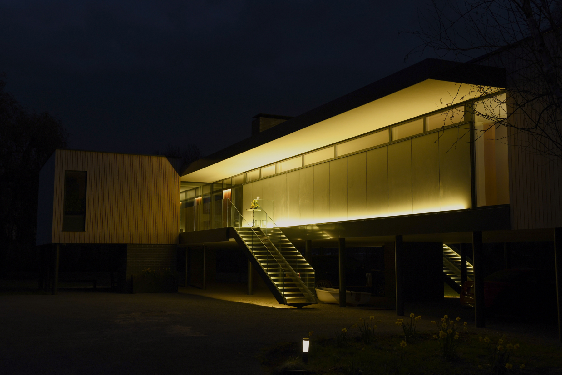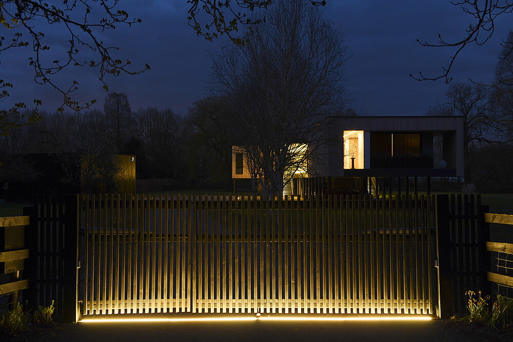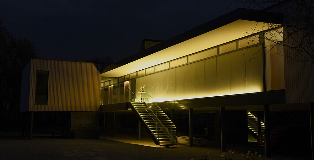 Bau eines modernen Glashauses am Ufer des Flusses Loddon. Dieses private Wohnhaus mit riesigen Fenstern wird mit LED Linear™ Leuchten im Innen- und Außenbereich perfekt hervorgehoben.Das homogene Licht am Eingang bietet eine warme und einladende Atmosphäre. Auch die Leuchten im Flur und im Bad sind perfekt aufeinander abgestimmt.