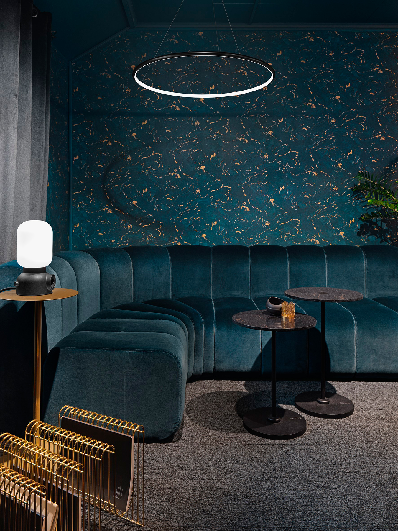 Die schöne Teestube im Gästehaus „Ahusgastis“ wurde von der talentierten Lena Nyholm dekoriert. Sie integrierte LYRA ECLIPSE in einem der gemütlichen Bereiche, um eine angenehme Atmosphäre zu schaffen.