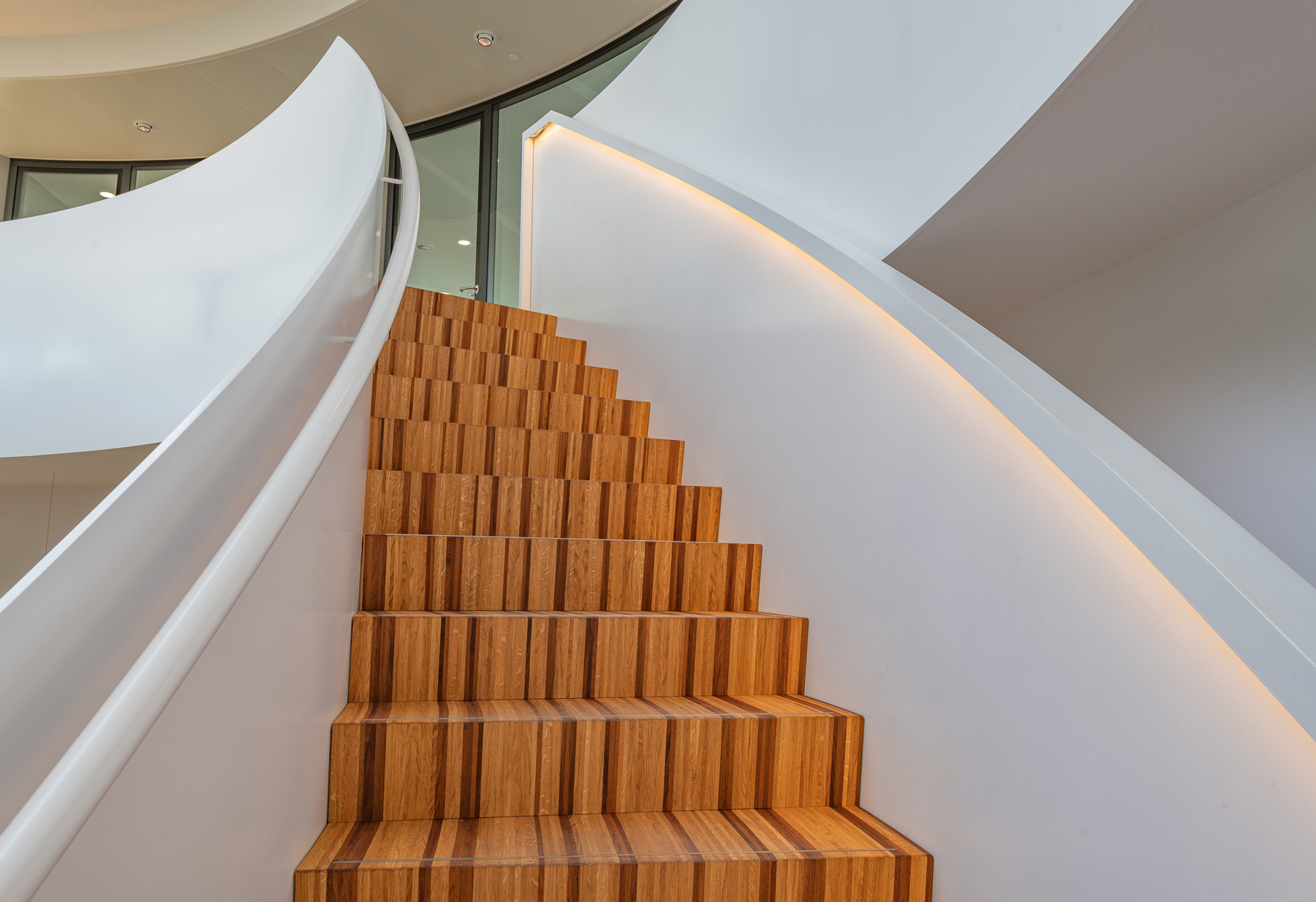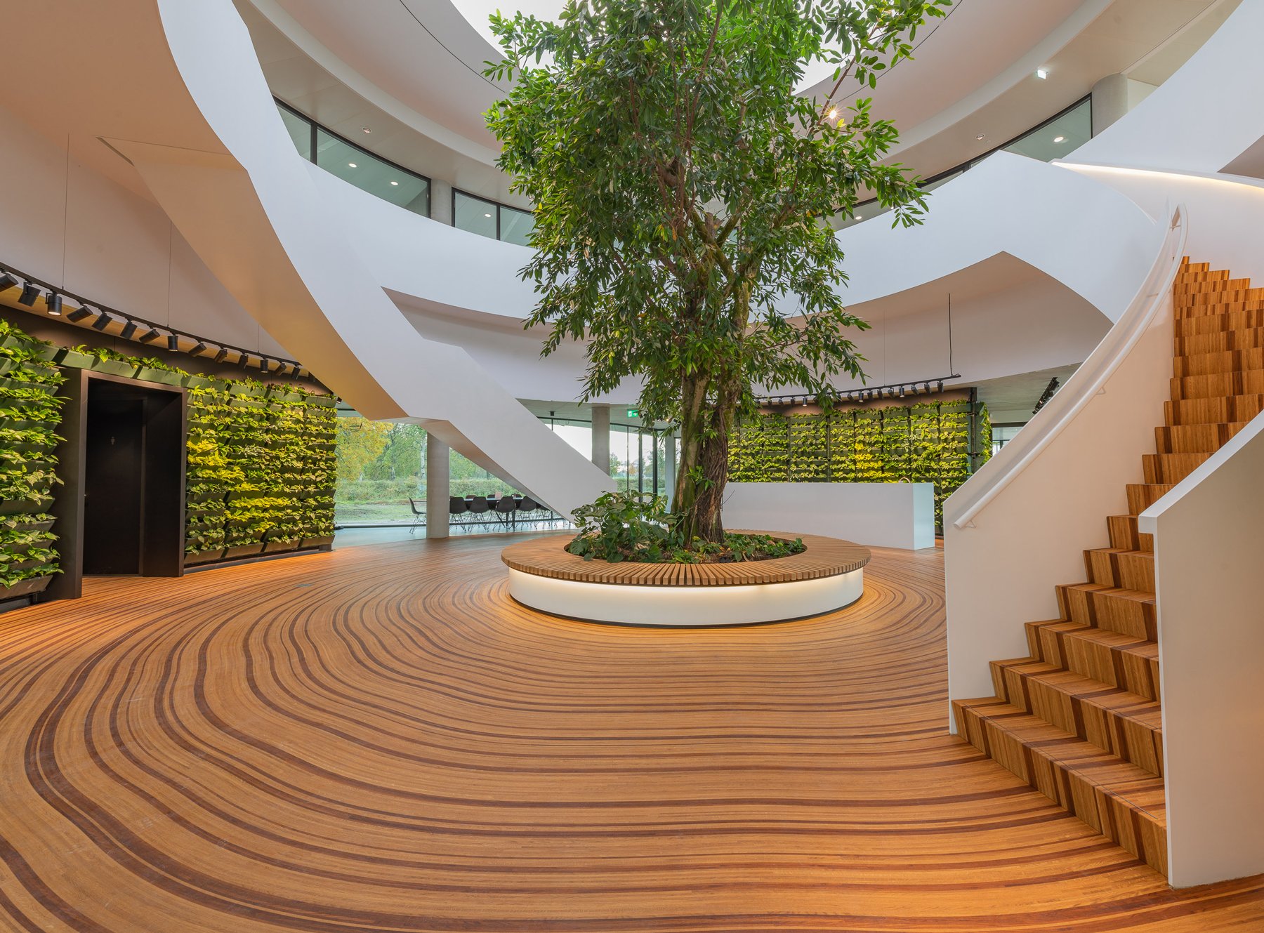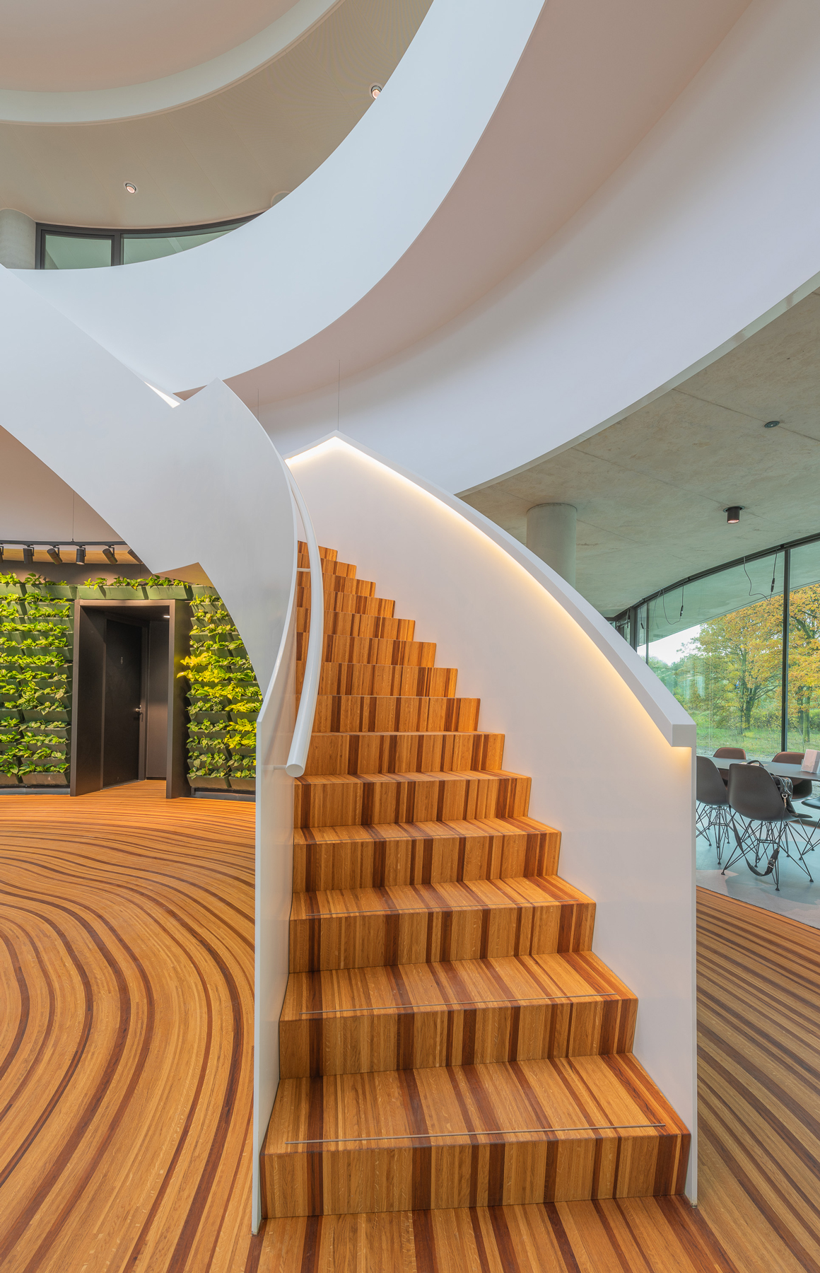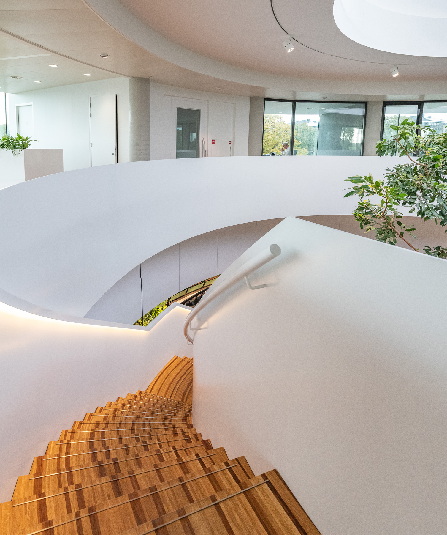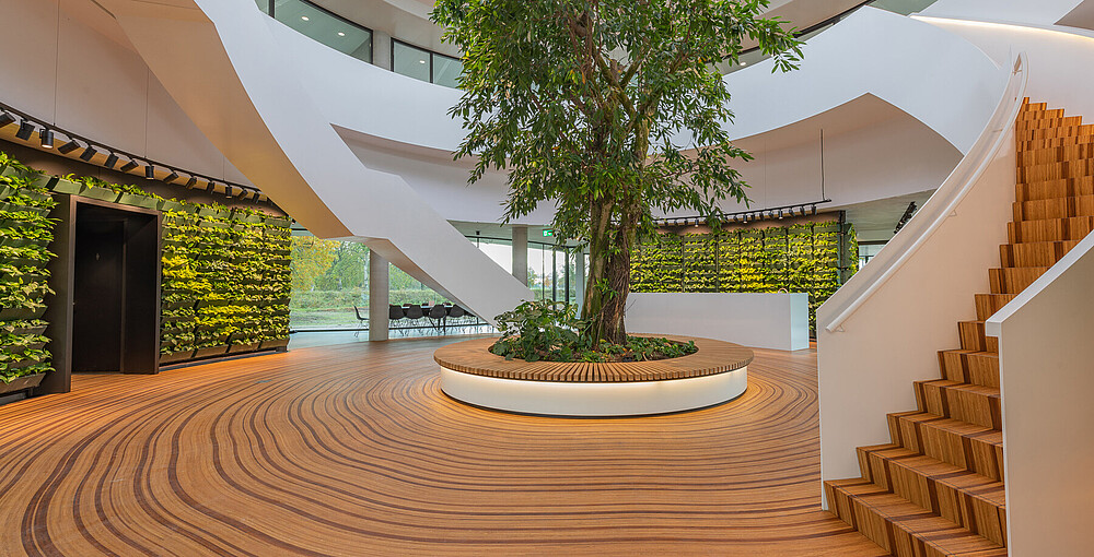 Der Hauptsitz des Landschaftsbauers Krinkels B.V. ist ein wahres Juwel. Durch viel Grün und organische Formen wurde ein Raum geschaffen, der sowohl spektakulär ist als auch sich perfekt in die Landschaft einfügt. Die Kombination des beeindruckenden Holzbodens und der Treppe ist ein charakteristischer Bestandteil des Entwurfs von Paul de Ruiter Architects. Q-CAT Lighting hat dazu beigetragen, das Design der Treppen und der Bank hervorzuheben und die Linien hervorzuheben. Dies basiert auf der Planung der Lichtdesigner von Beersnielsen. Die flexiblen Lichtlinien von LED Linear™ unter dem Handlauf der Treppe sorgen für einen raffinierten indirekten Lichteffekt und tragen auch zum Sicherheitsaspekt bei. Die in die Bank integrierte Lichtlinie setzt dieses Element frei und erhöht so die Dynamik des Raumes. VarioLED™ Flex PHOBOS Top View- und Side View in der Lichtfarbe 3.000 K und 3.300 K wurden in mehreren kundenspezifischen Längen eingesetzt.