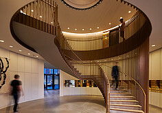 In den öffentlichen Bereichen fungiert die Dreschscheune mit ihrer hoch aufragenden Holzlamellendecke als Empfangszentrum und Ausstellungsraum. Die Apfelweinpresse, der Shop, das Apfelweinhaus, das Café und das Glashaus nutzen alle ähnliche Beleuchtungselemente für Kontinuität.