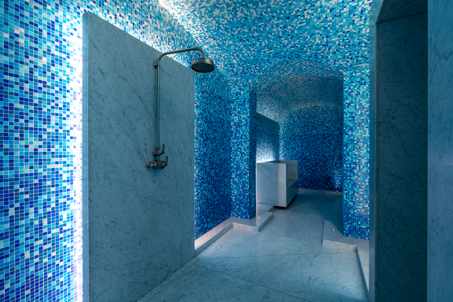 Das Lichtdesign unterstreicht die Atmosphäre des Luxus – vom atemberaubenden Pool mit seinen vielschichtigen Umgebungseffekten bis hin zu den von hinten beleuchteten Halotherapie-Salzwänden, dem indirekt beleuchteten Hammam, der Sauna, dem Dampfbad und den Behandlungsräumen.