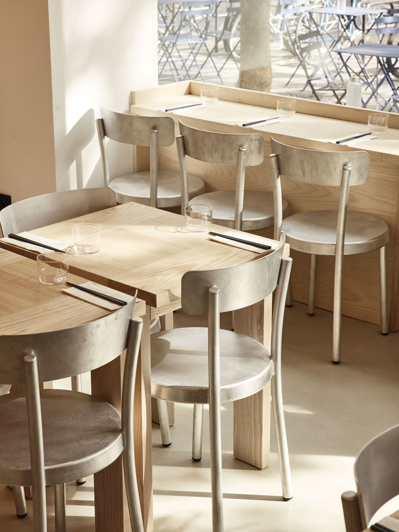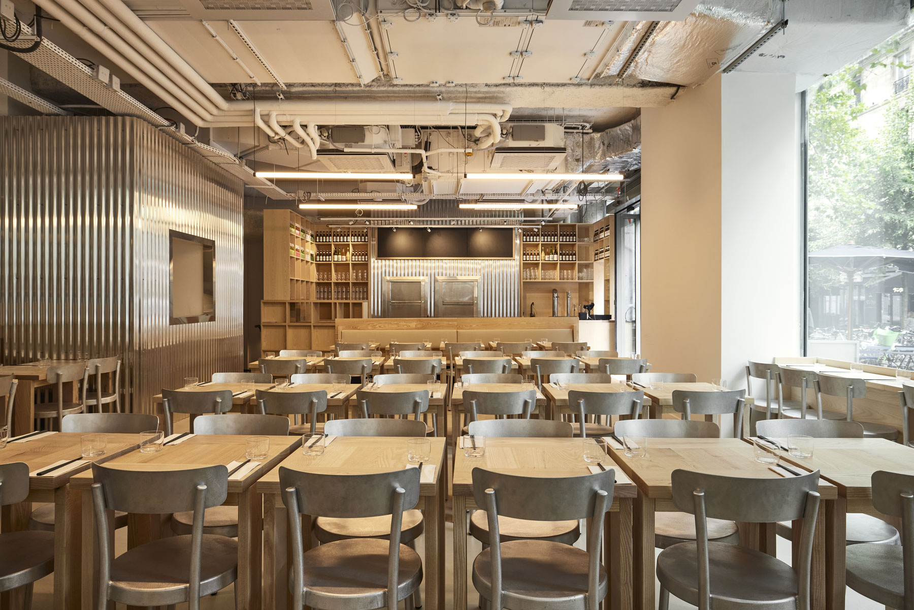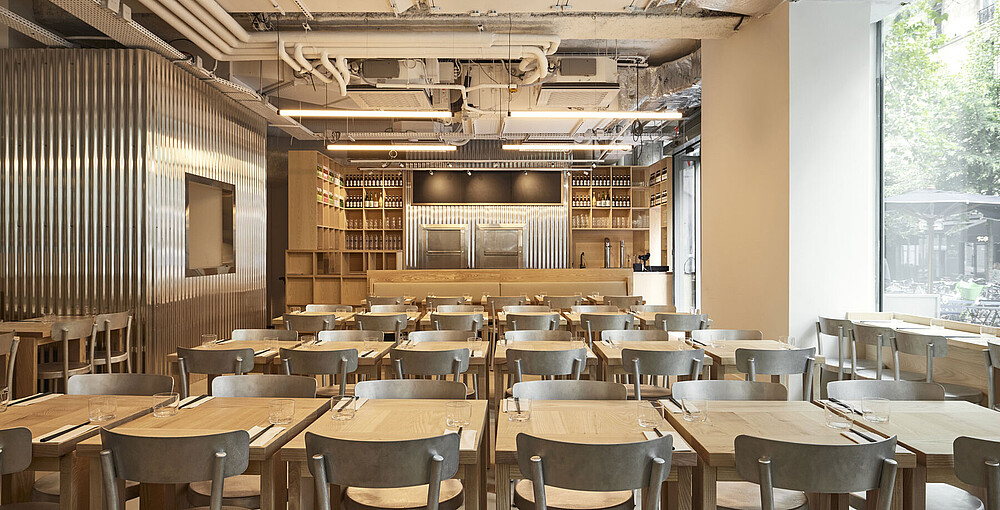 Die Architektur von iRASSHAi ist das Ergebnis einer Zusammenarbeit zwischen Hugo Haas und Yusuke Kinoshita, unterstützt von Xavier Marchand und Thierry Maincent. Gemeinsam haben sie einen zeitgemäßen Raum gestaltet, der sowohl japanische als auch Pariser Elemente miteinander verbindet. Die Herausforderung bestand darin, eine einheitliche Ästhetik zu schaffen, während jeder Bereich seine eigene Identität bewahrt. Dafür wurden dieselben Materialien verwendet: Eschen- und Kastanienholz sowie Aluminium. Die Anordnung der Räume auf dem Gelände folgt dem Wunsch nach Kohärenz. Von der SHOKUDO-Kantine bis zum KISSATEN-Café bietet iRASSHAi eine Vielfalt an Erlebnissen, aber dennoch zieht sich eine einheitliche Designsprache durch den gesamten Raum. Natürliche Materialien, sichtbare Decken und Lehmputz sind subtile Anspielungen auf zeitgenössisches japanisches Design.