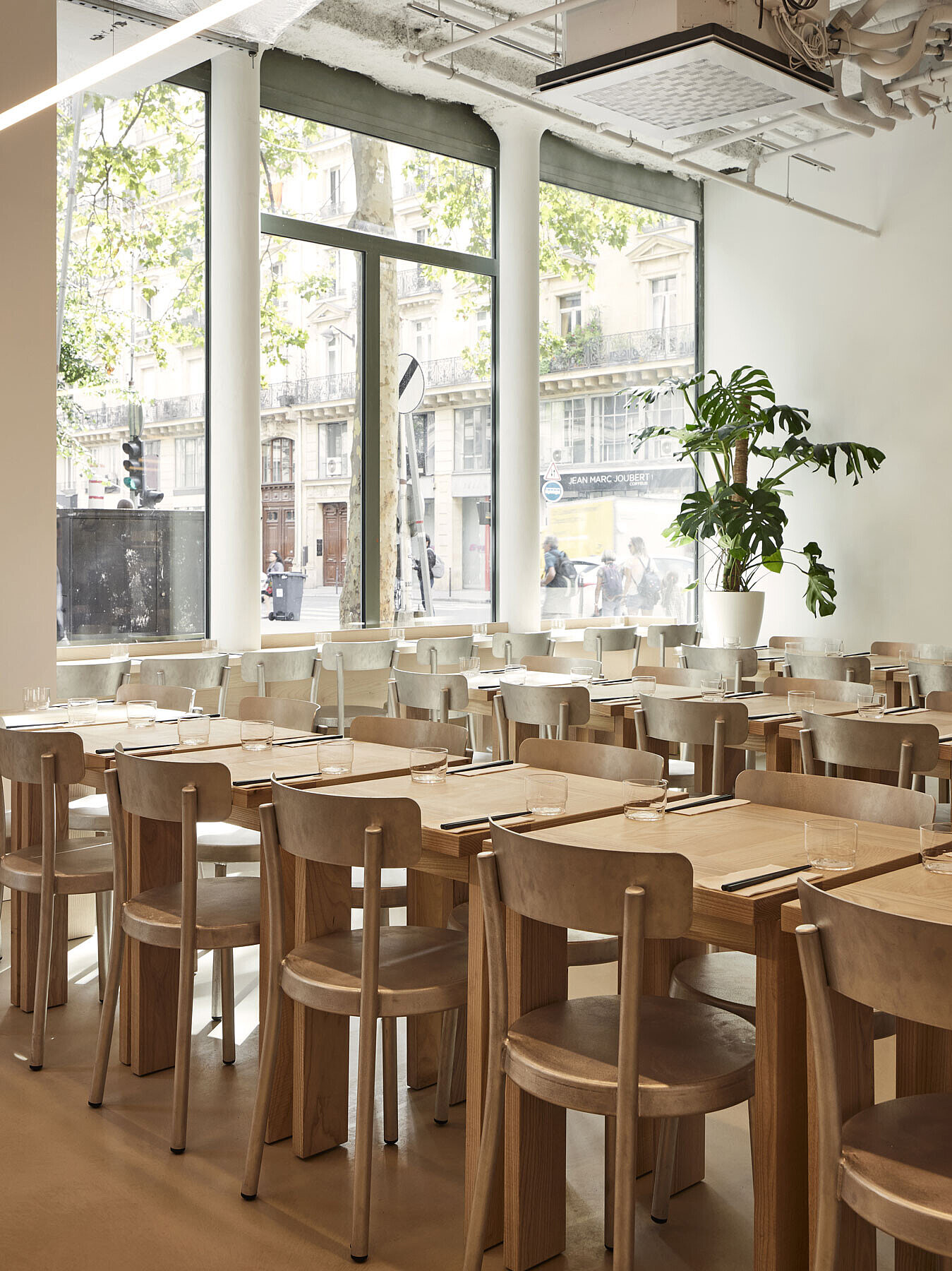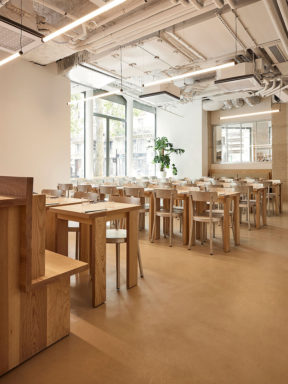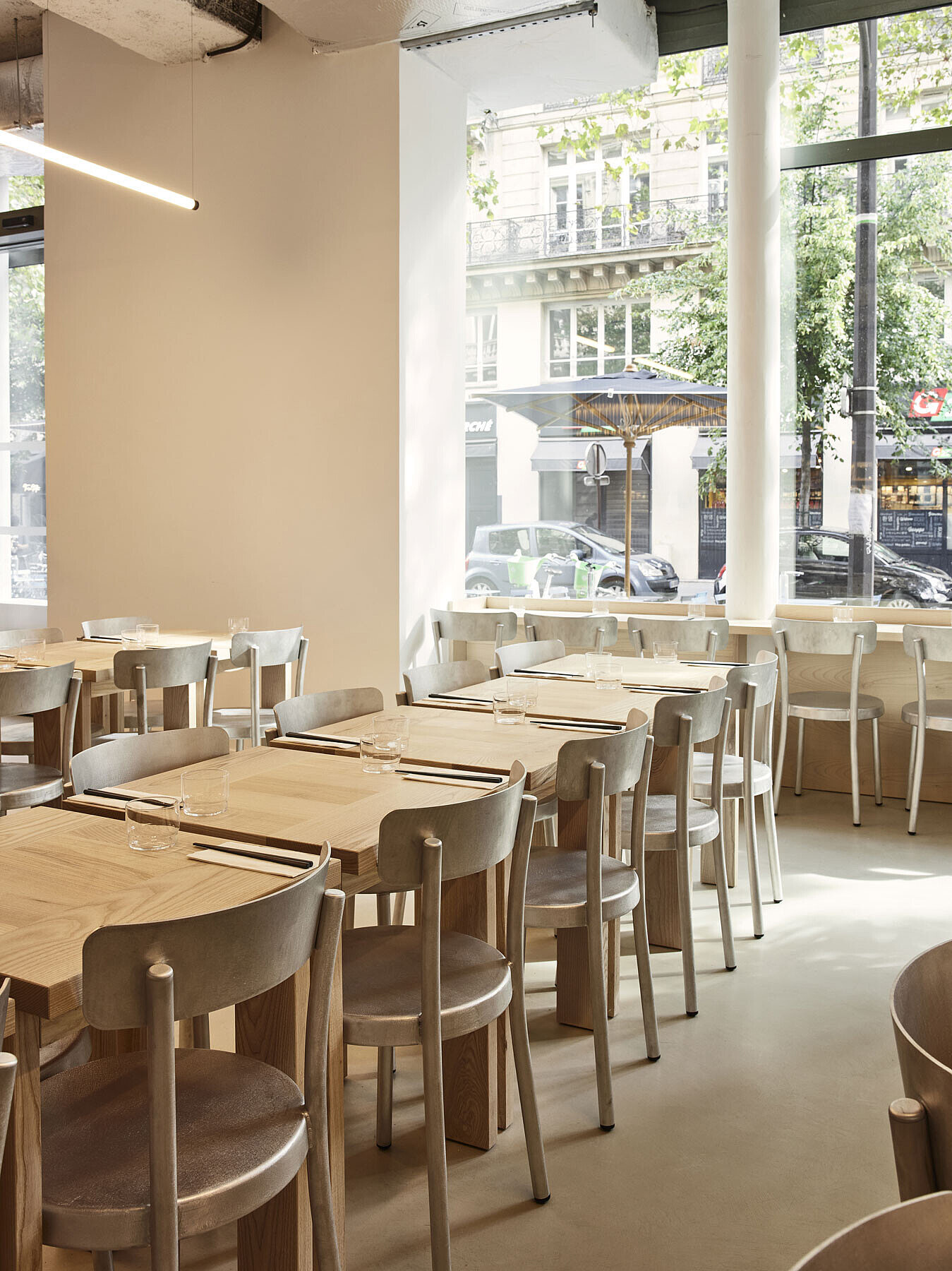 Die Architektur von iRASSHAi ist das Ergebnis einer Zusammenarbeit zwischen Hugo Haas und Yusuke Kinoshita, unterstützt von Xavier Marchand und Thierry Maincent. Gemeinsam haben sie einen zeitgemäßen Raum gestaltet, der sowohl japanische als auch Pariser Elemente miteinander verbindet. Die Herausforderung bestand darin, eine einheitliche Ästhetik zu schaffen, während jeder Bereich seine eigene Identität bewahrt. Dafür wurden dieselben Materialien verwendet: Eschen- und Kastanienholz sowie Aluminium. Die Anordnung der Räume auf dem Gelände folgt dem Wunsch nach Kohärenz. Von der SHOKUDO-Kantine bis zum KISSATEN-Café bietet iRASSHAi eine Vielfalt an Erlebnissen, aber dennoch zieht sich eine einheitliche Designsprache durch den gesamten Raum. Natürliche Materialien, sichtbare Decken und Lehmputz sind subtile Anspielungen auf zeitgenössisches japanisches Design.