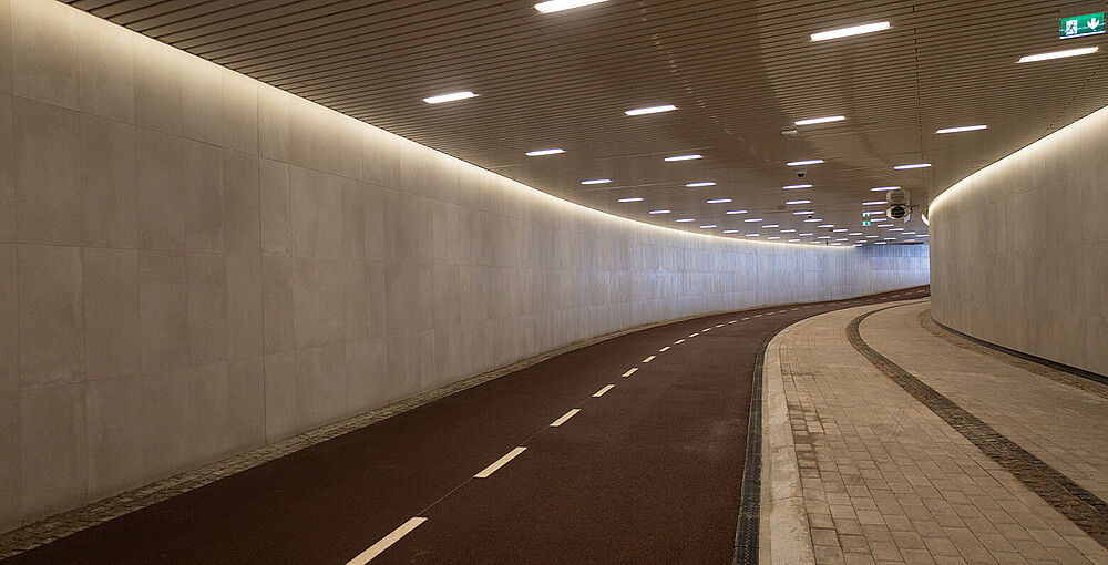 Im gebogenen Mittelteil des Tunnels wurde der Rand des Daches beleuchtet, um ein frisches und helles Aussehen zu erzeugen, das die Deckenfläche aufhellt und das Gefühl von natürlichem Licht im Untergrund vermittelt. Dafür wurde die flexible VENUS Side View IP67 ausgewählt. Heini sagt, dass bei der Beleuchtung des gebogenen Teils des Kaisantunnels eine angenehme und gleichmäßige Beleuchtung angestrebt wurde, die eine ruhige, dem natürlichen Licht ähnliche Atmosphäre schafft. Die VENUS Side View mit Opaldiffusor beleuchtet die Nische zwischen Decke und Wand und unterstreicht mit Hilfe ihrer seitlich flexiblen Form perfekt die schöne gebogene Form des Tunnels. Die Leuchten werden mit langlebigen und korrosionsbeständigen Edelstahlbügeln montiert. Die Fenster des Fahrradparks wurden mit XOOLUM IP67 hervorgehoben, was eine Schaufenster-ähnliche Atmosphäre schafft.