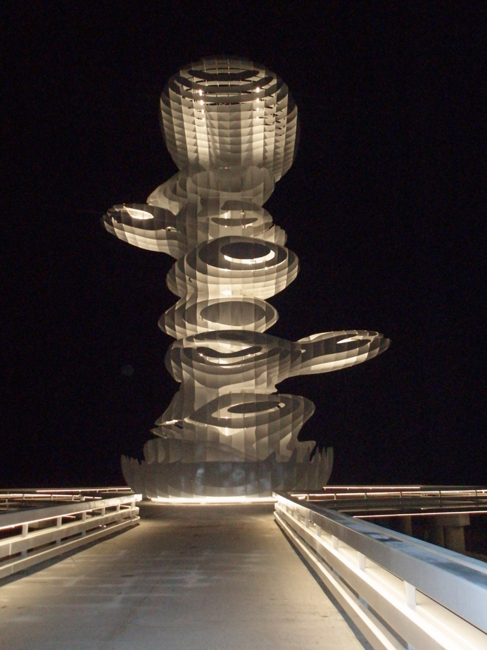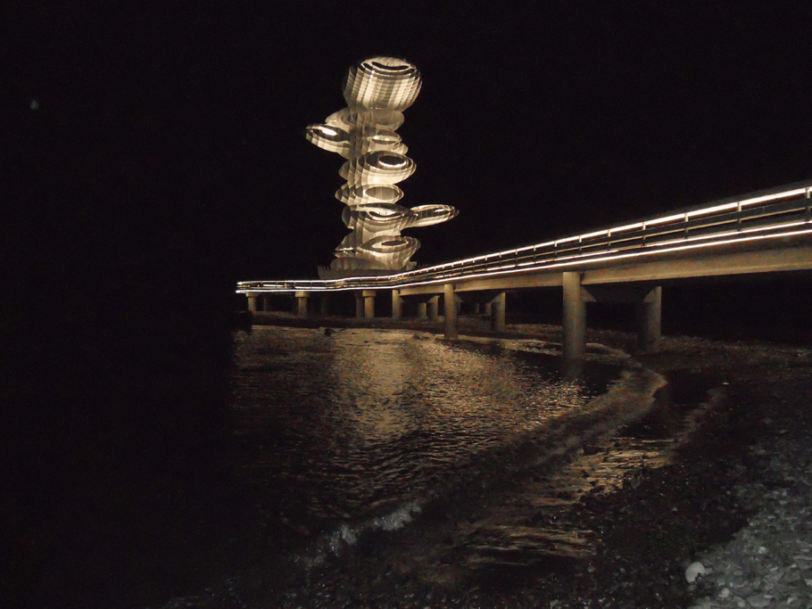 Die Bilder zeigen Jürgen Mayer H.s Skulptur in Lazika, einer geplanten Stadt in Georgien, direkt am Schwarzen Meer. Der ca. 100 Meter lange neue Pier mit der über 31 Meter hohen Stahlskulptur sollte den Baubeginn der neuen Stadt markieren. Eine dynamische, pulsierende Beleuchtung von innen und außen inszeniert die Skulptur bei Nacht als neues Wahrzeichen.