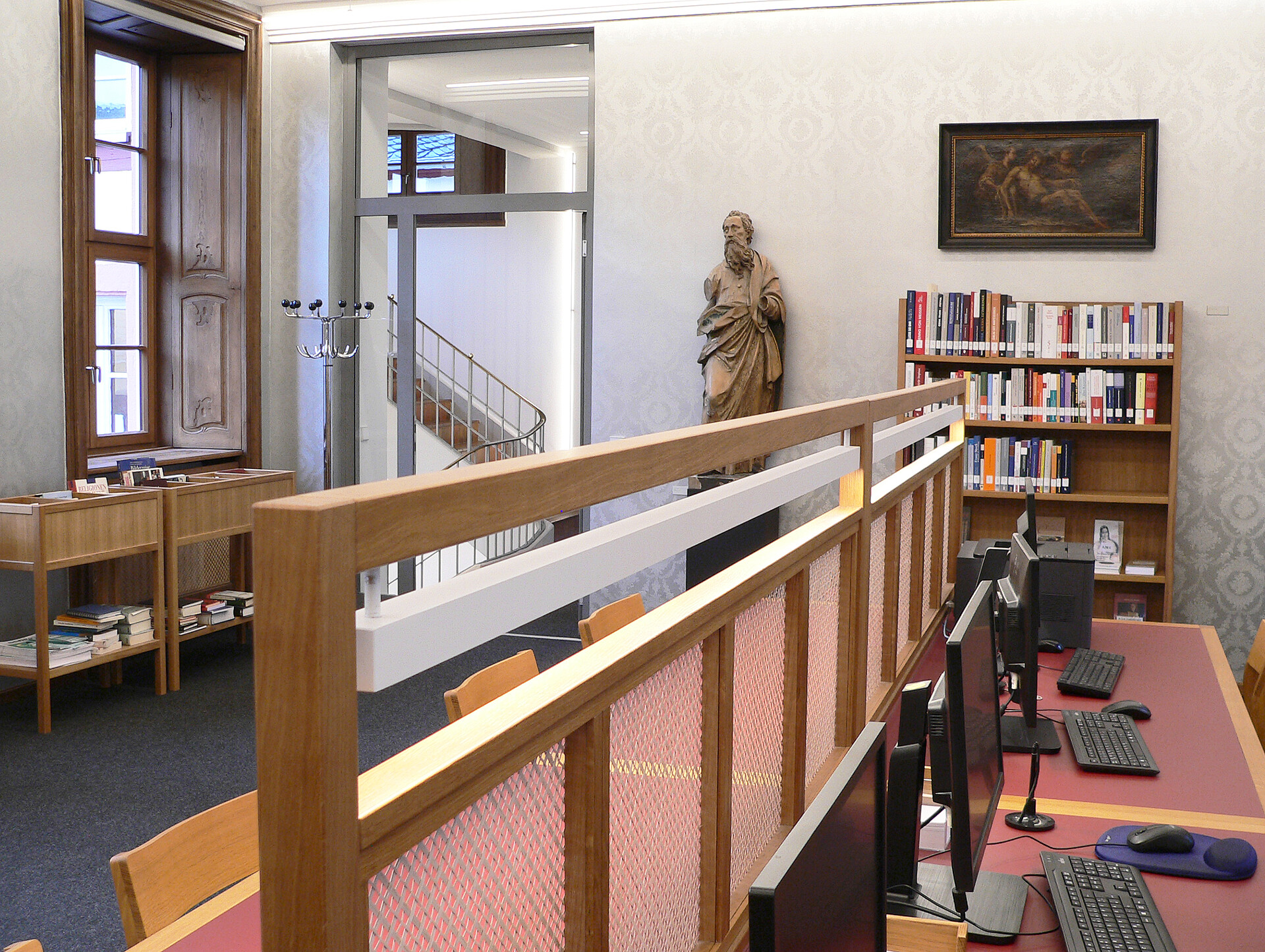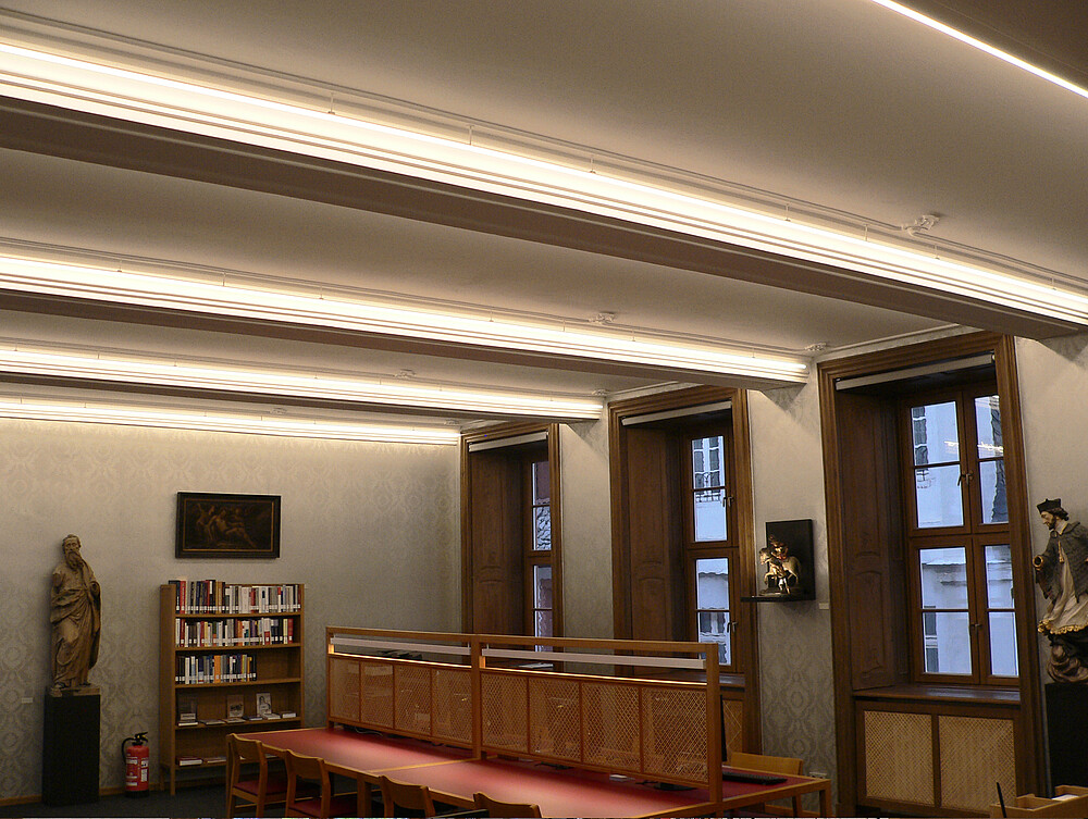 Mit einem „Tag der offenen Tür“ feierte die Mainzer Martinus-Bibliothek am 11. November 2017 ihre Wiedereröffnung. Die Bibliothek musste dringend wegen Brandschutzrichtlinien renoviert werden. Die Lichtplaner hatten unter anderem die Aufgabe, die Räumlichkeiten der Bücherausleihe sowie den Lesebereich mit gutem Licht auszustatten. Auf der mittleren Ebene des Lesebereiches wurde die Rundleuchte LYRA installiert. Diese elegante und formschöne Leuchte ist nahezu 360° schwenkbar und mit der 10° Linearoptik bestens für eine Ausleuchtung der beiden Lesetische geeignet. Ebenso wurde die LYRA in der Pendelversion als Allgemeinbeleuchtung in der Decke mit der runden opalen Optik eingesetzt.
