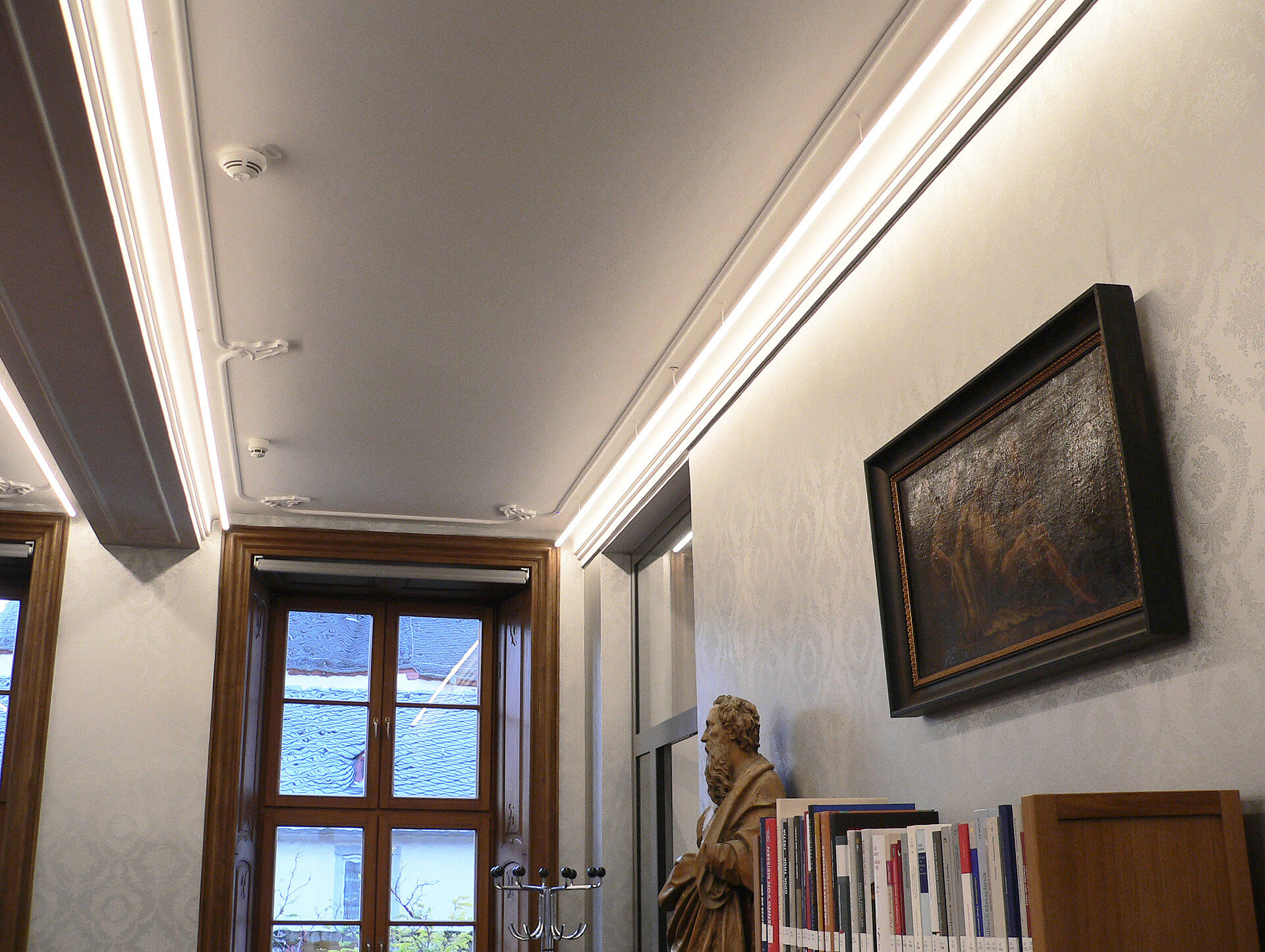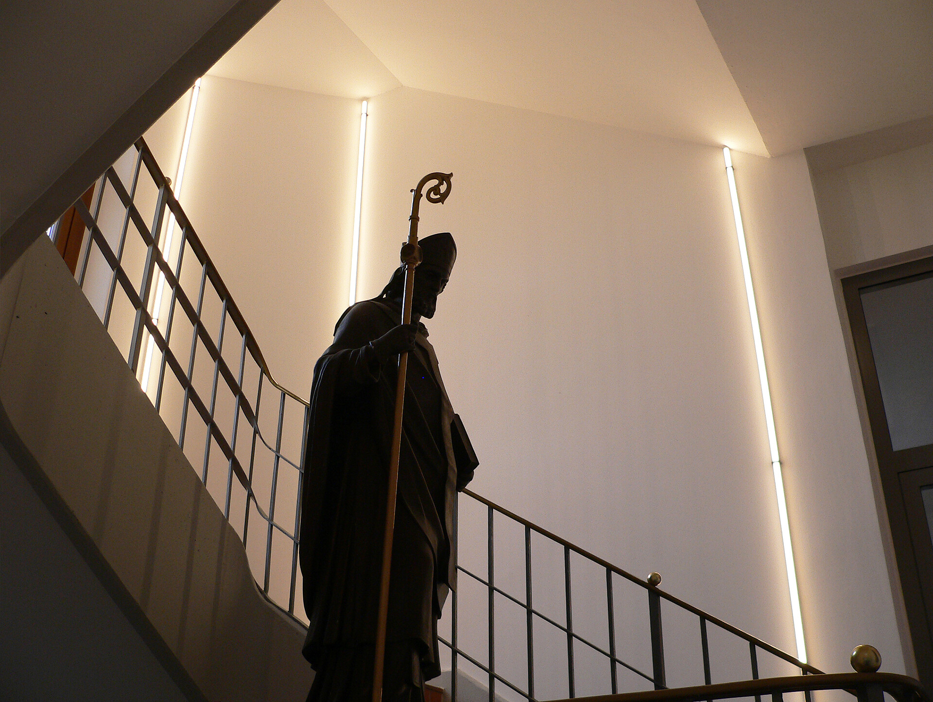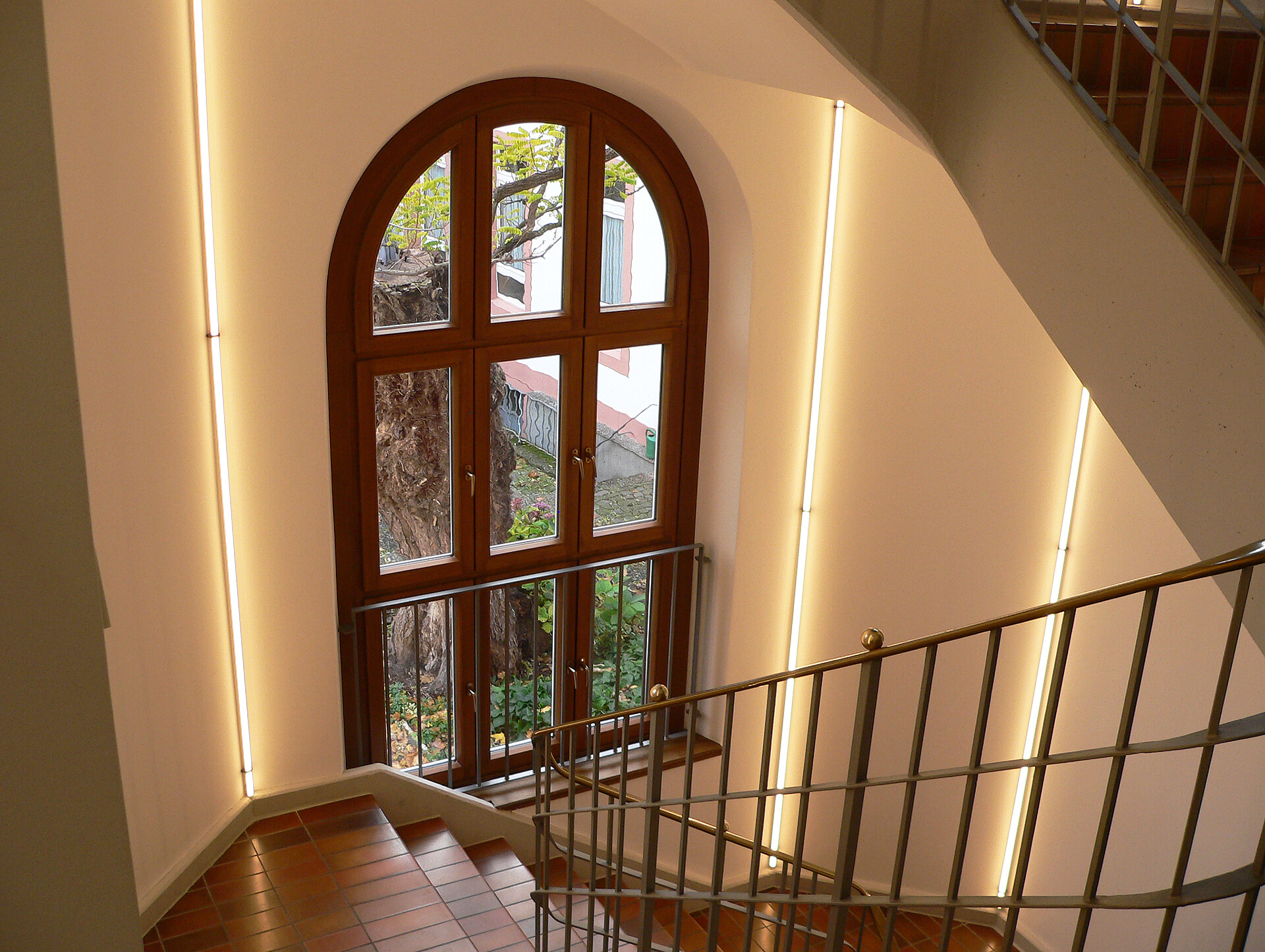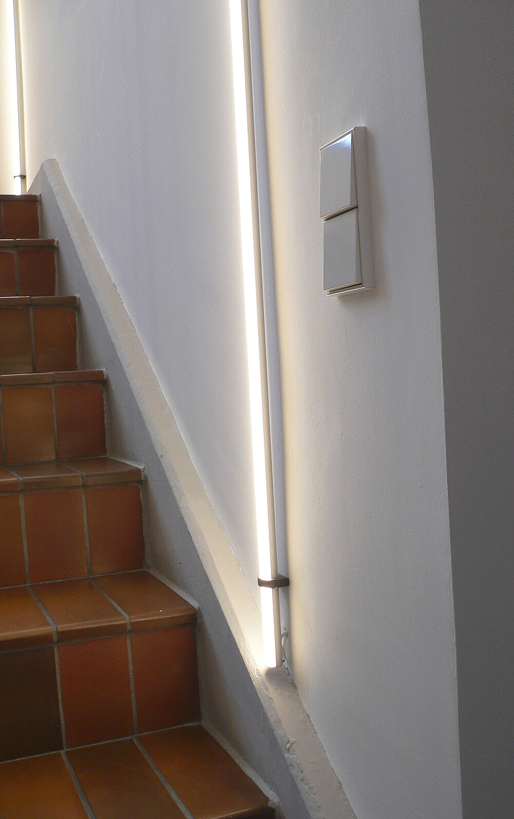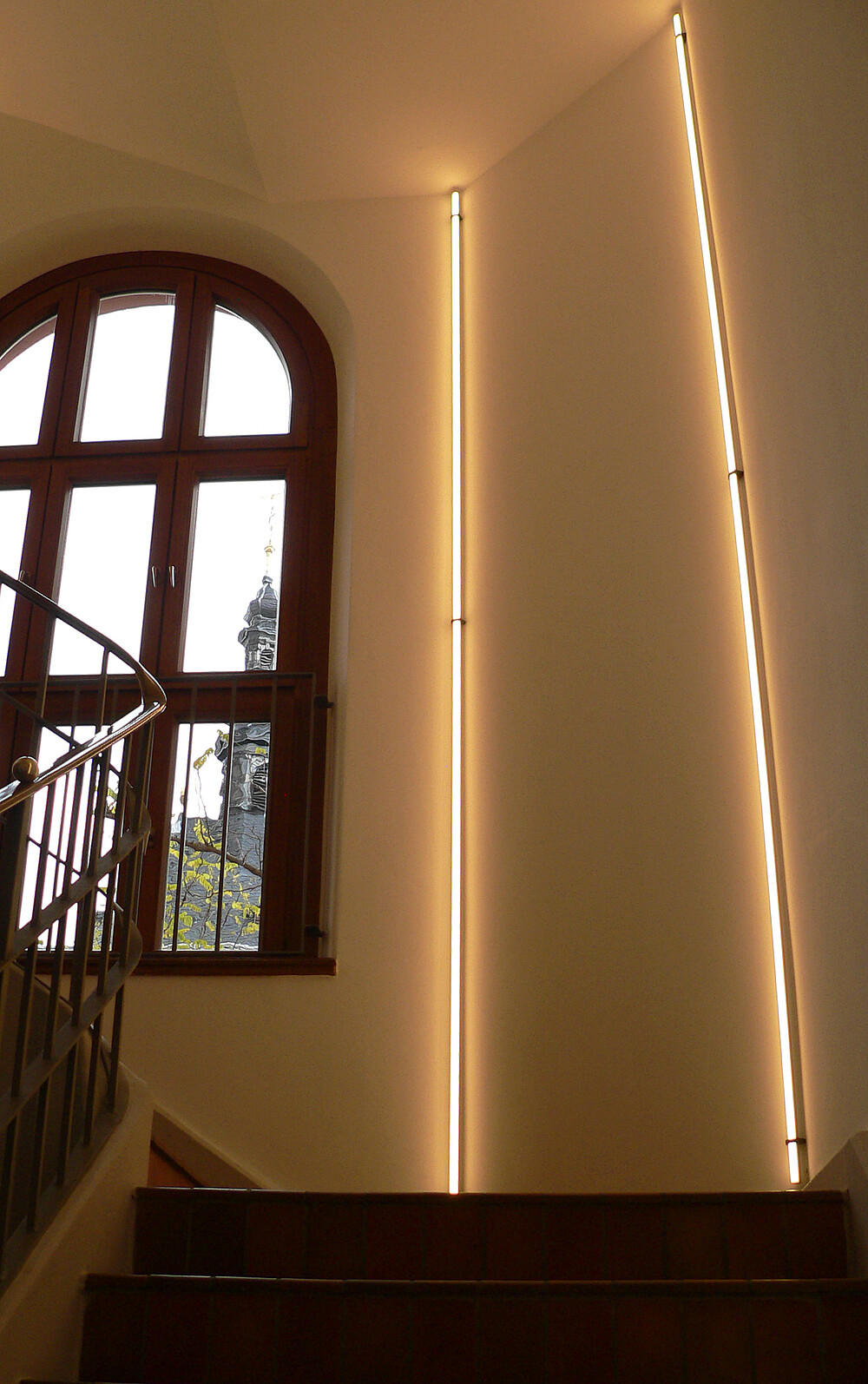 Das Treppenhaus der Bibliothek erstrahlt ebenfalls in neuem Glanz. Über alle Etagen wurde die LYRA passgenau als durchgehende Lichtlinie an der Wand angebaut. Das Lichtdesign ist nicht nur ein optischer Hingucker, es leuchtet auch die Treppe mit harmonischen 3.000 Kelvin aus.