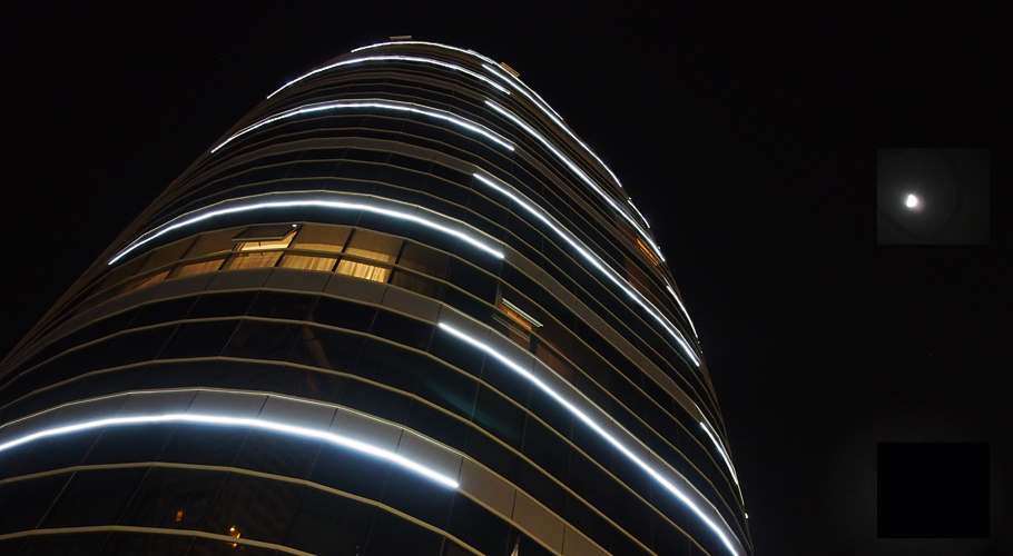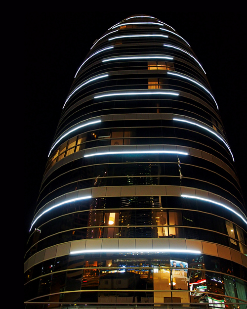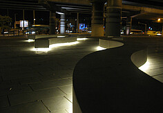 Lineare Fassadenbeleuchtung der Hotelfront im Kurvendesign.