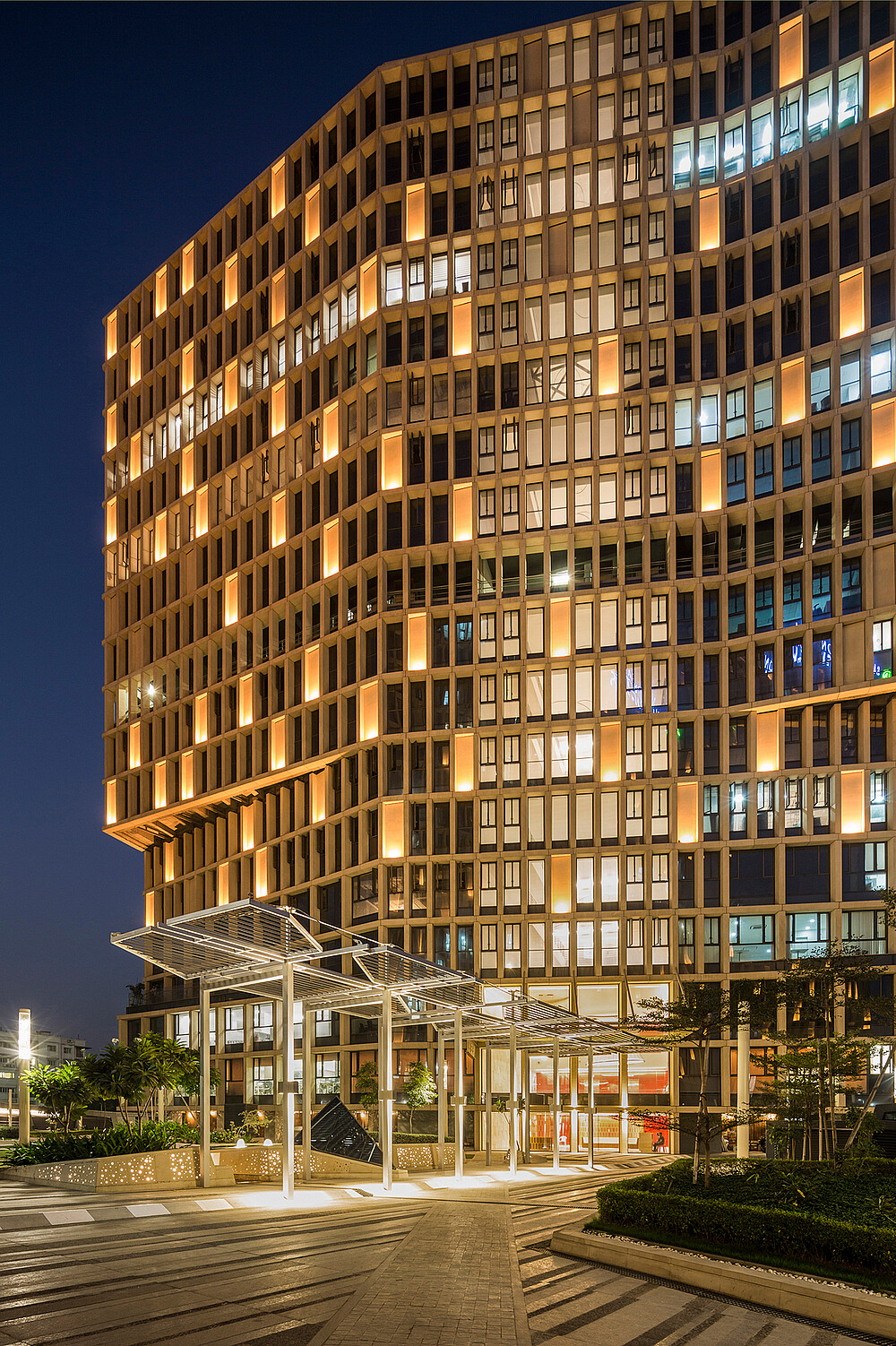 Atelier dada hat nicht nur den besten technischen Ansatz gefunden, um die Wendung mit der Optimierung der Ressourcen und der Minimierung der Lichtverschmutzung hervorzuheben, sondern auch den Auftrag durch Hinzufügen von Laserstrahlen auf den obersten Ebenen des Gebäudes vorangetrieben.