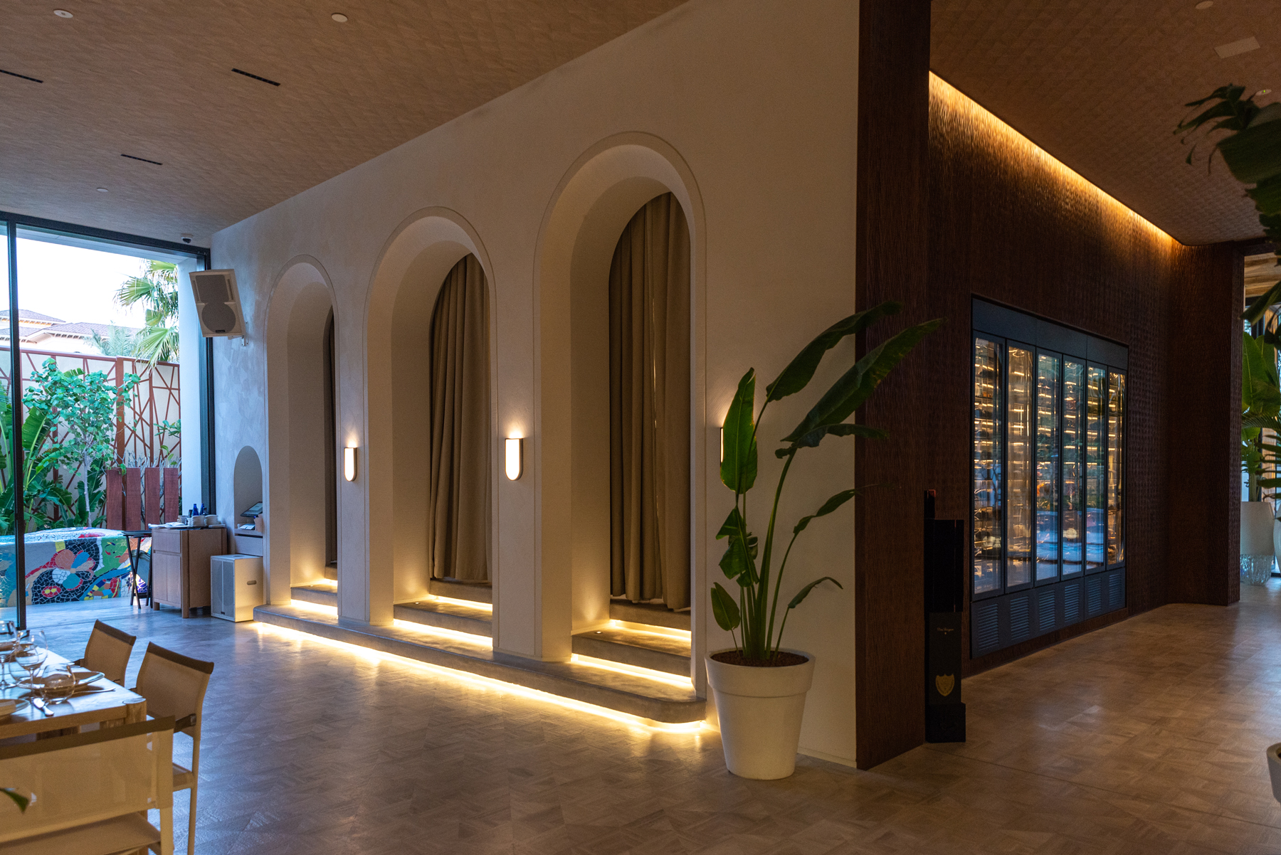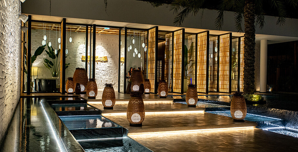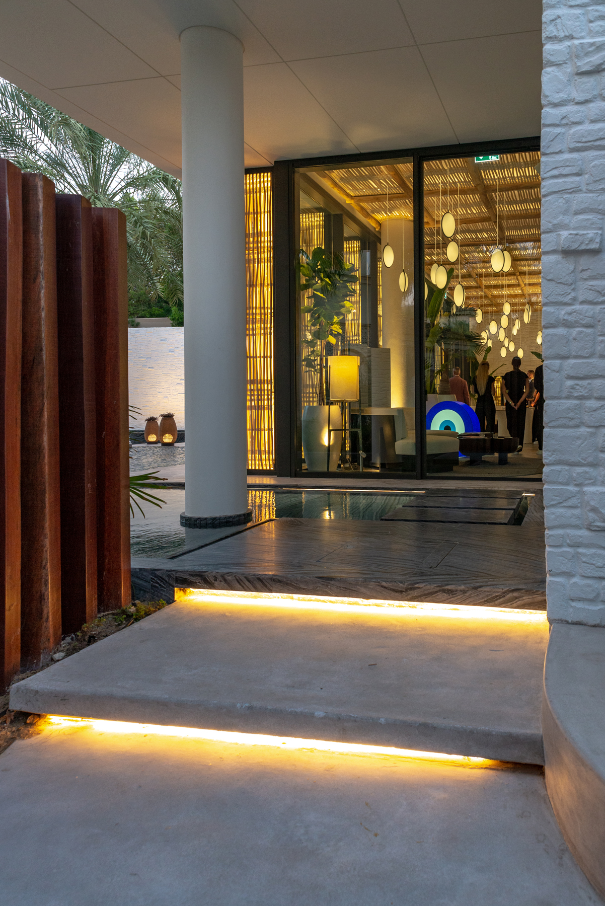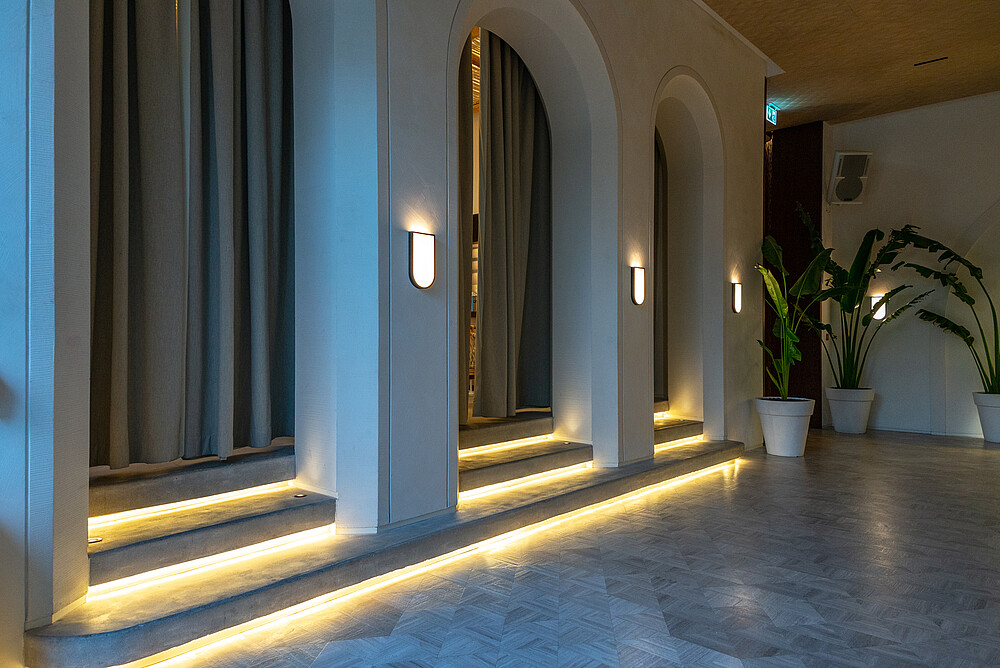 Der Veranstaltungsort ist mit warm gedimmtem Licht aus einer großen Auswahl von Produkten von Huda Lighting ausgestattet, wie z. B. SKYLLA Top View und Side View für die Treppenelemente.